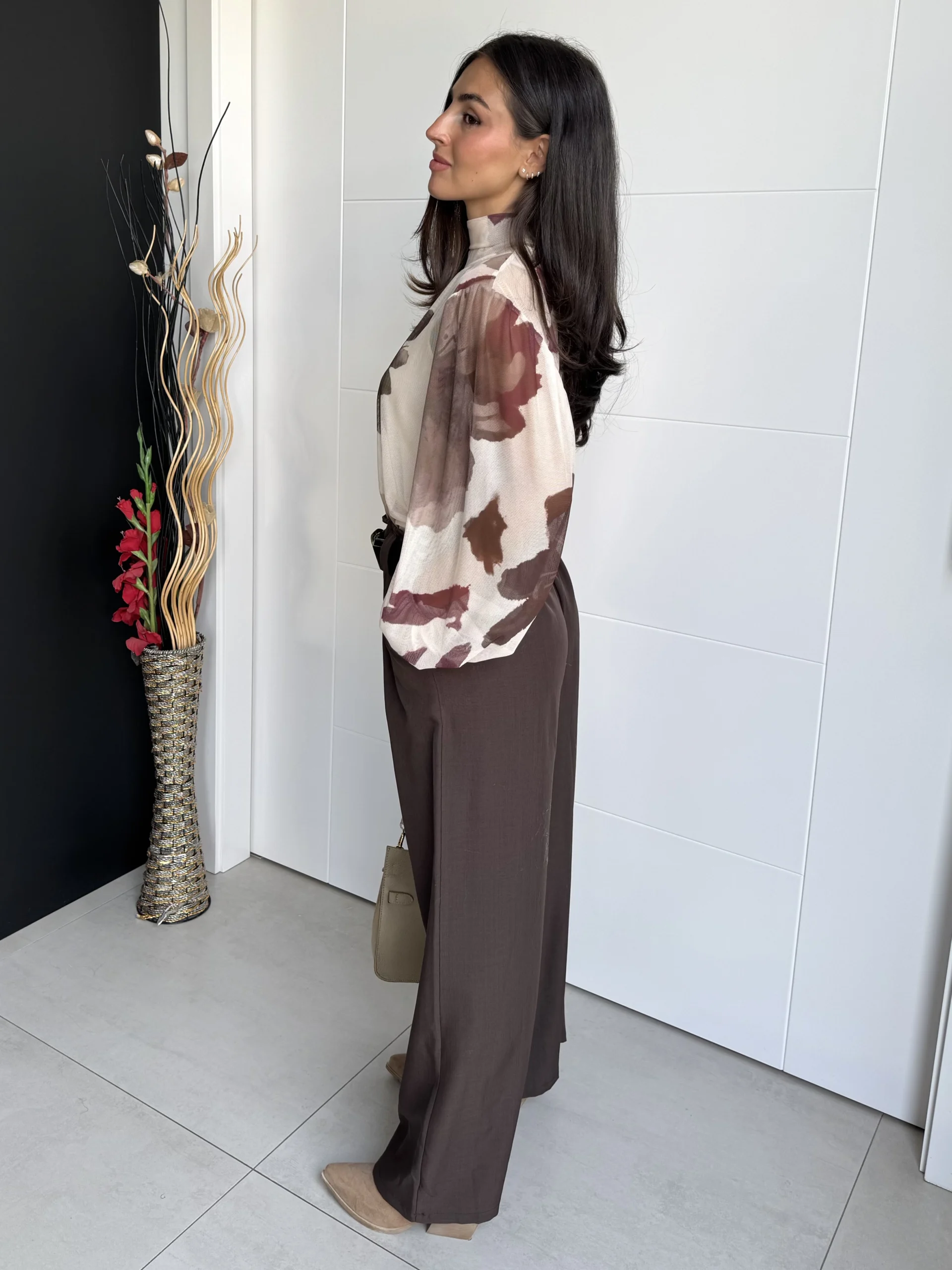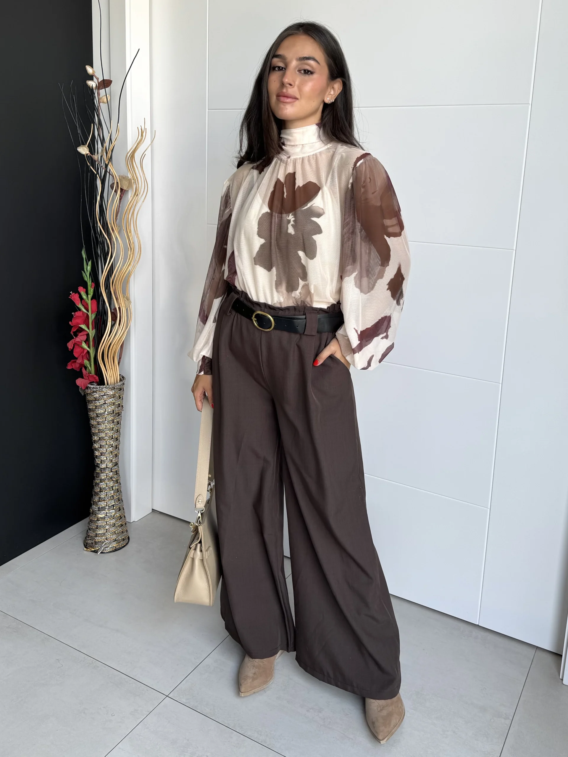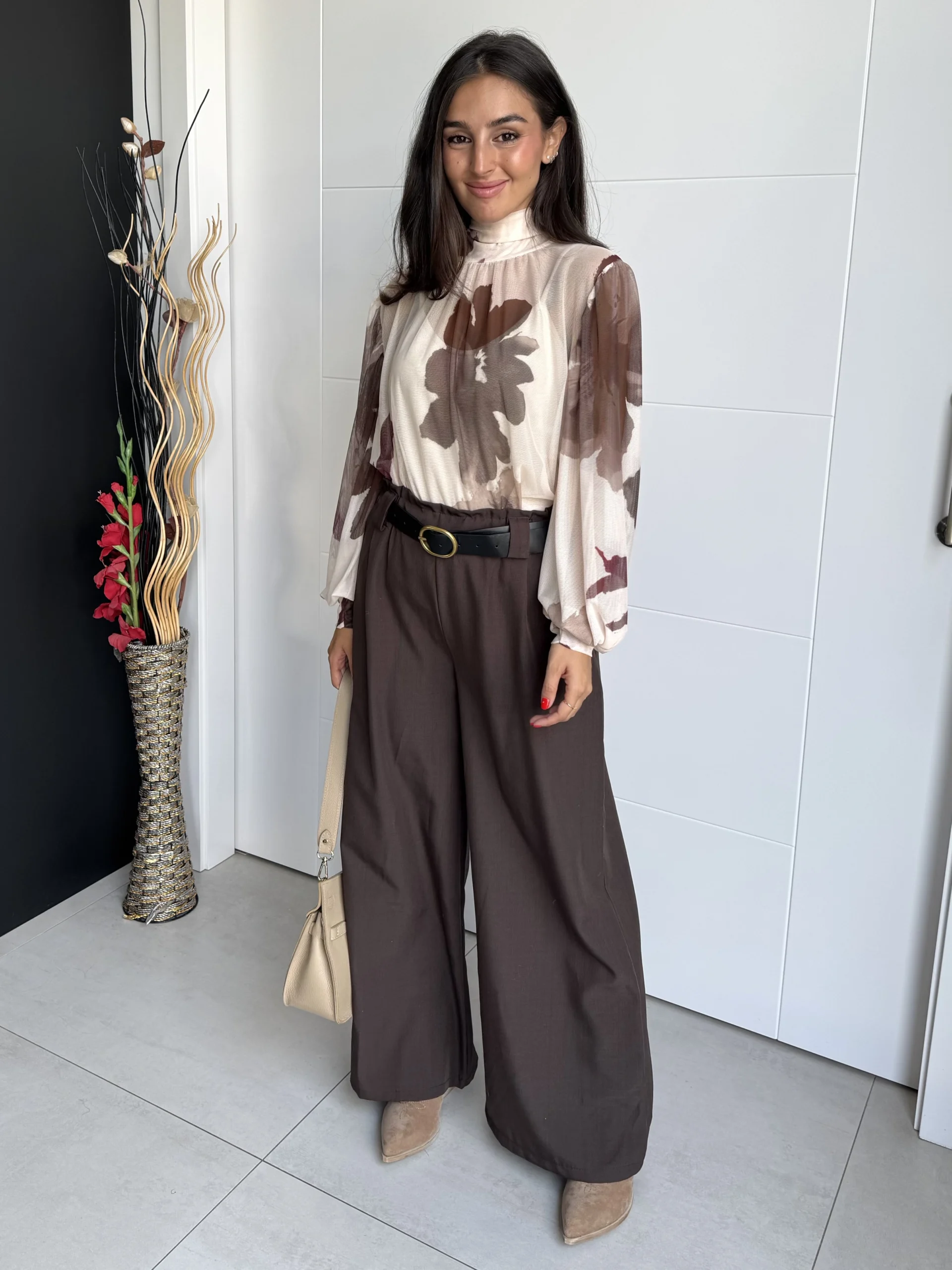 Pantalón Ancho Satén Chocolate fluido de tiro medio con acabado satinado suave. Con pinzas frontales, bolsillos laterales y dobladillo vuelto ancho, aporta comodidad y elegancia a la vez. Ideal para looks casual chic o de oficina.