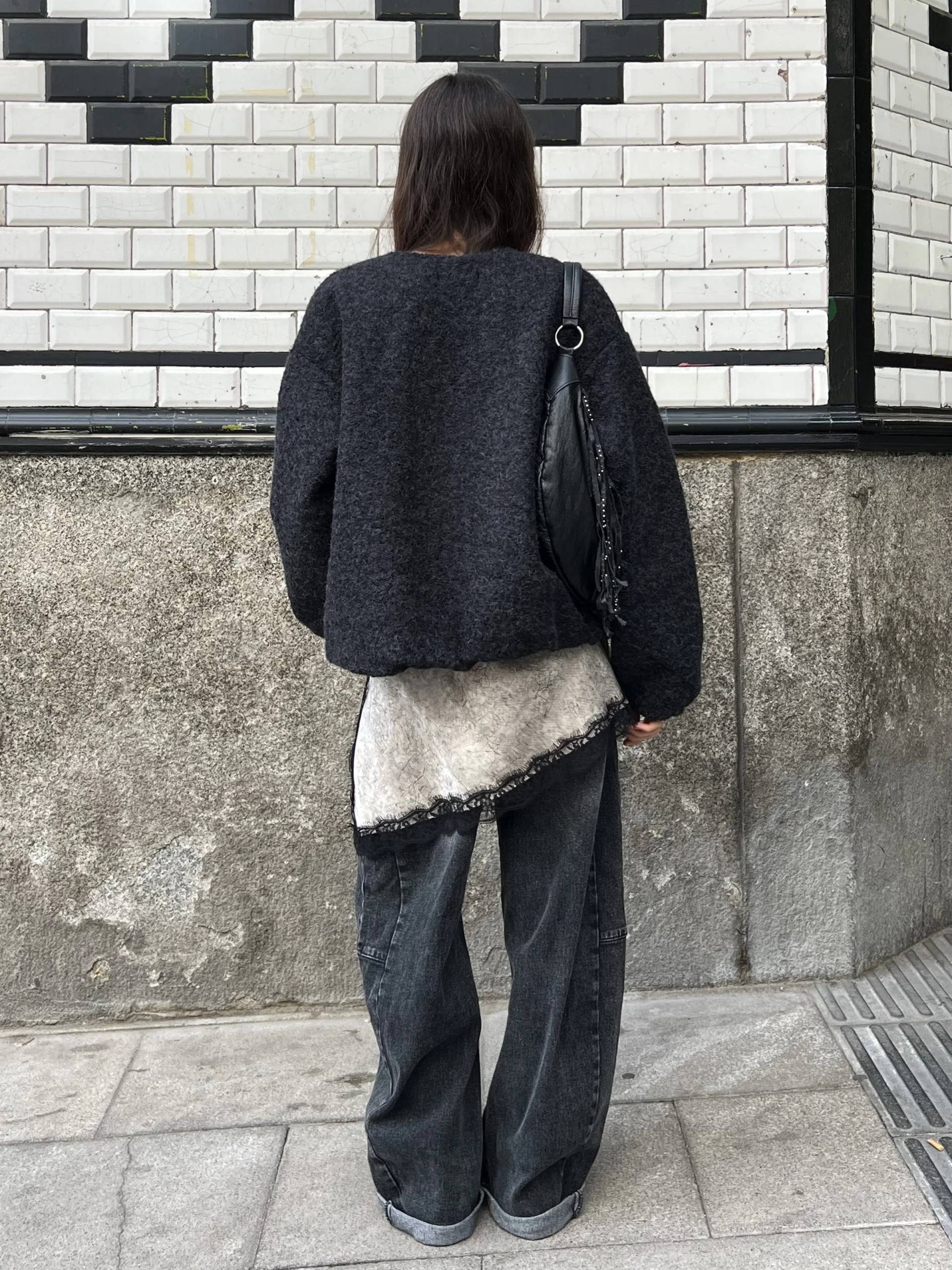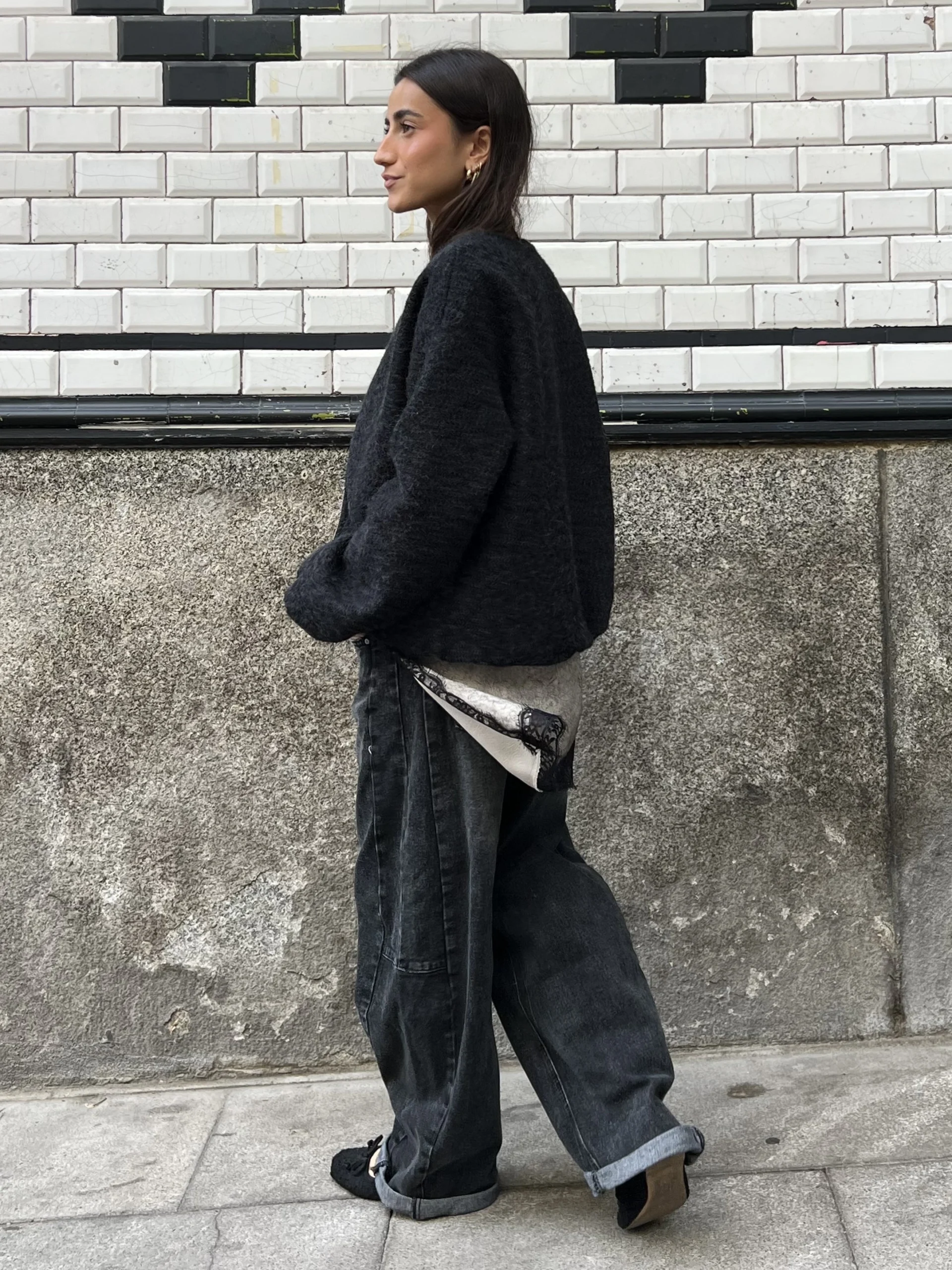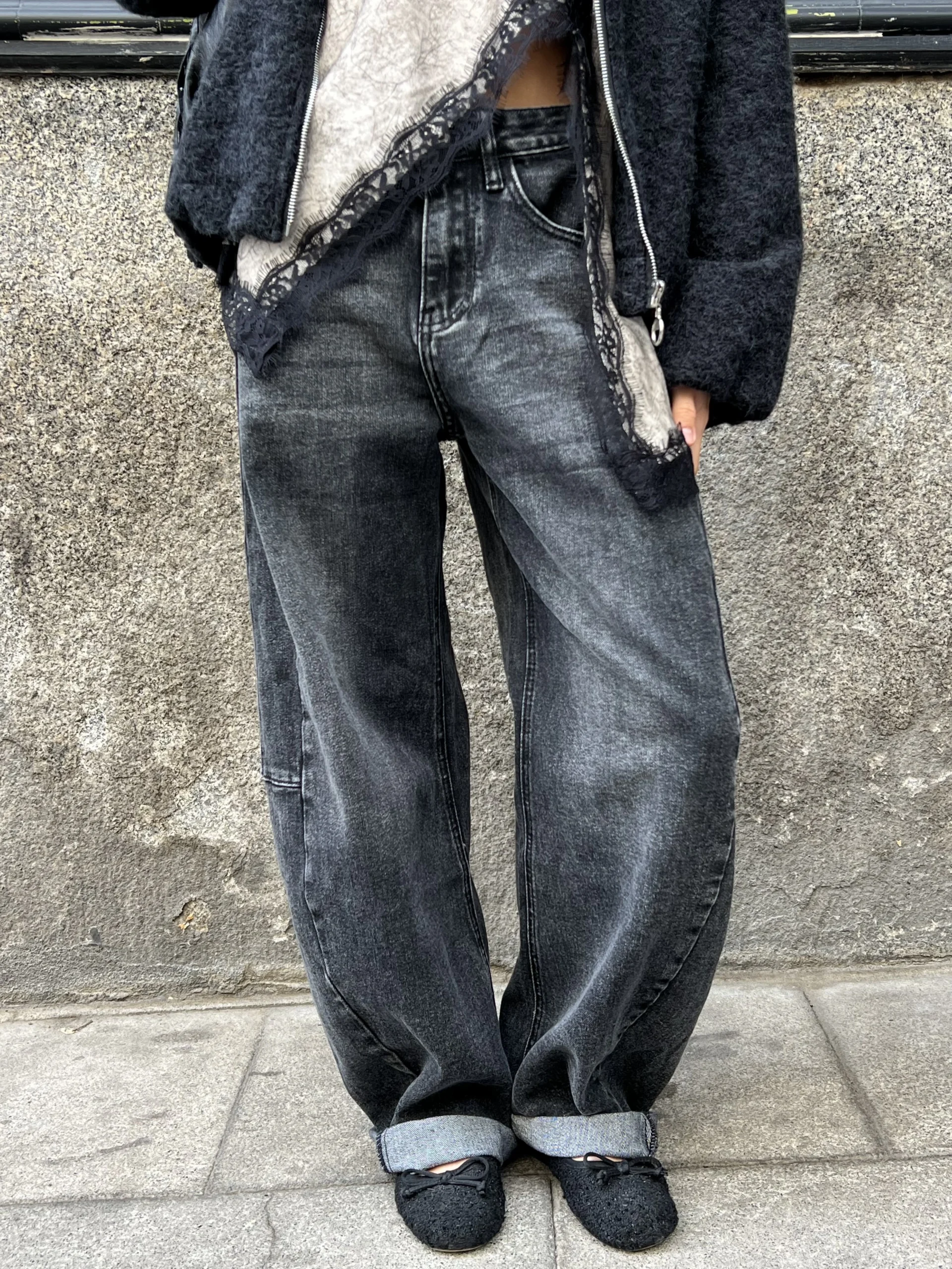 Pantalón vaquero wideleg en color gris oscuro, lavado desgastado. con bolsillos en la parte frontal y trasera. Bajo remangado.