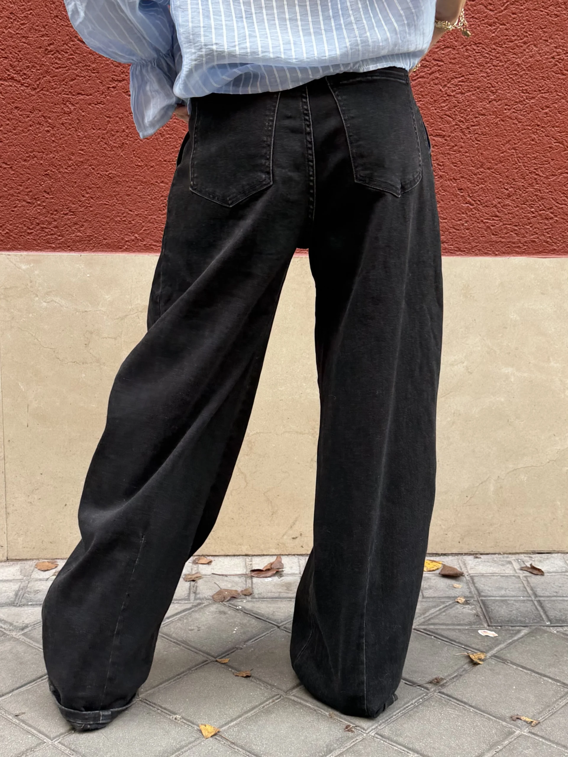 Pantalón vaquero wideleg en color negro, con bolsillos en la parte frontal y trasera. Bajo remangado.