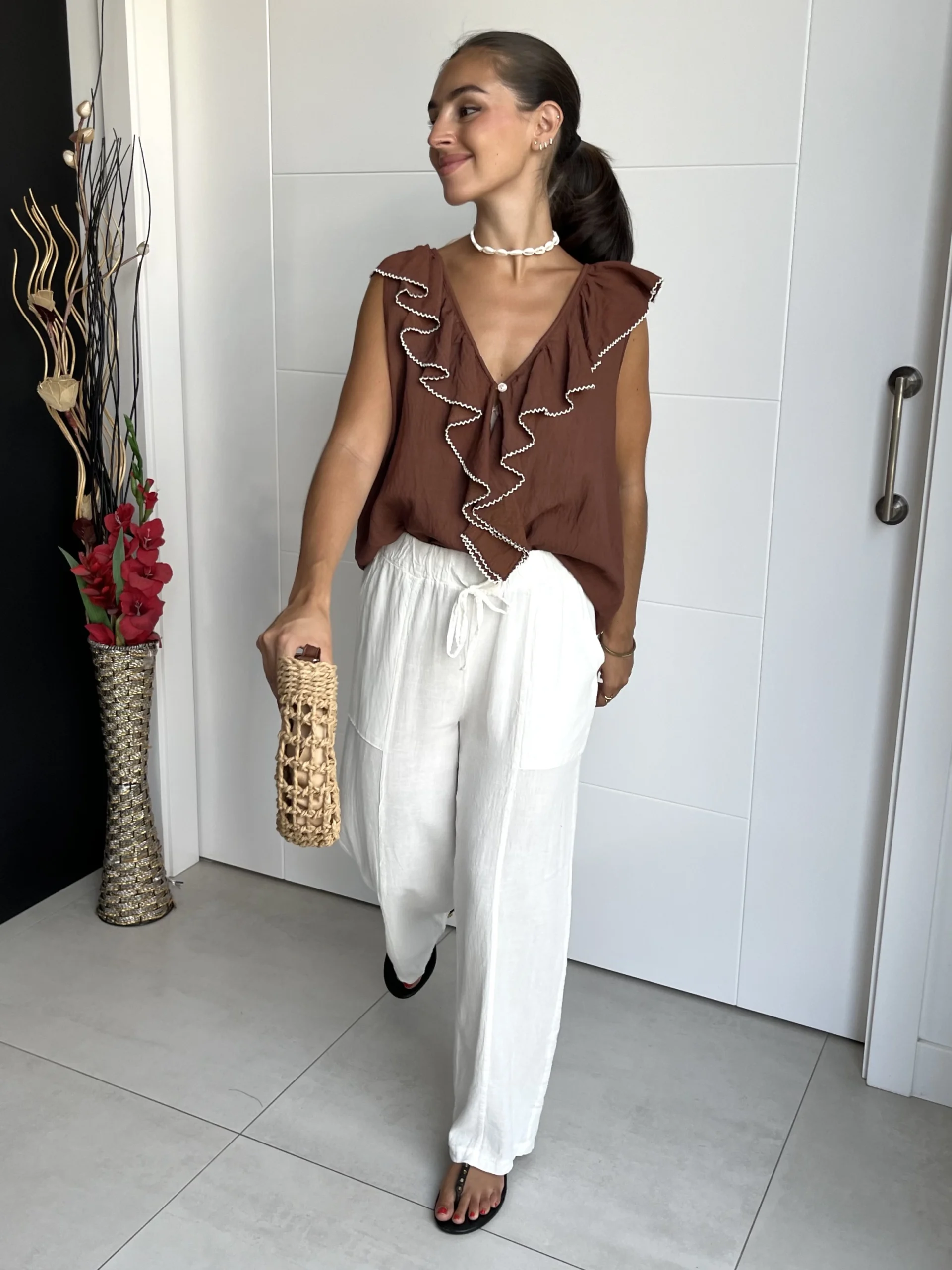Pantalón de lino en color crema, con cordón, y cintura elástica con goma. Pernera ancha y con bolsillos.