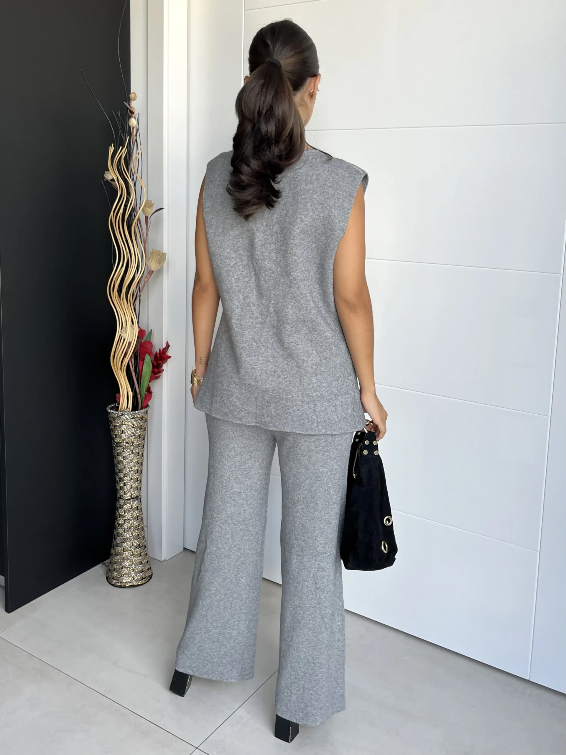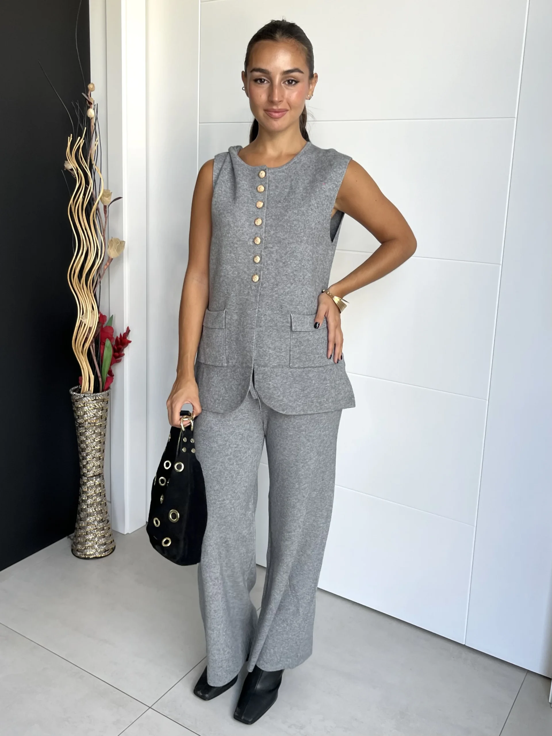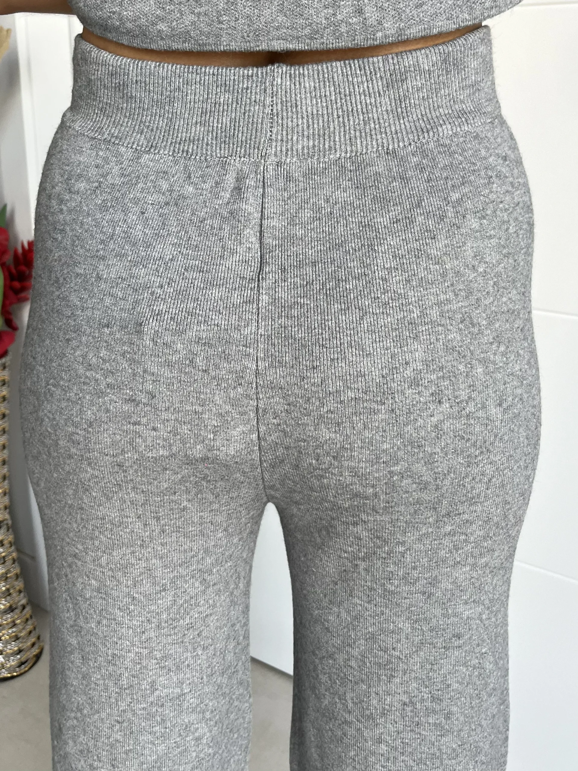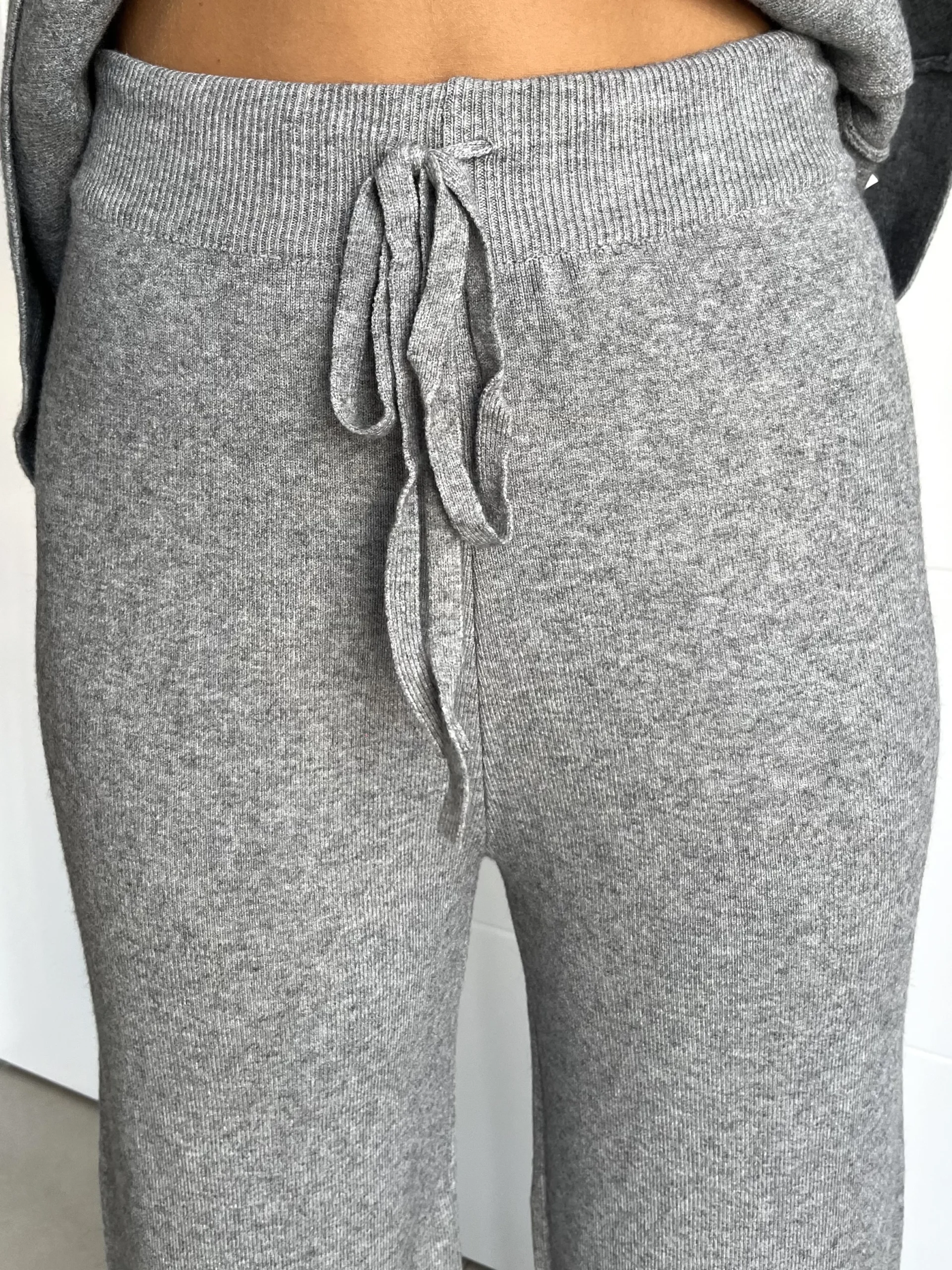 Pantalón de punto suave en color gris, con pernera ancha y cintura elástica con goma y cordón. A juego con el Chaleco Punto Suave Gris.
