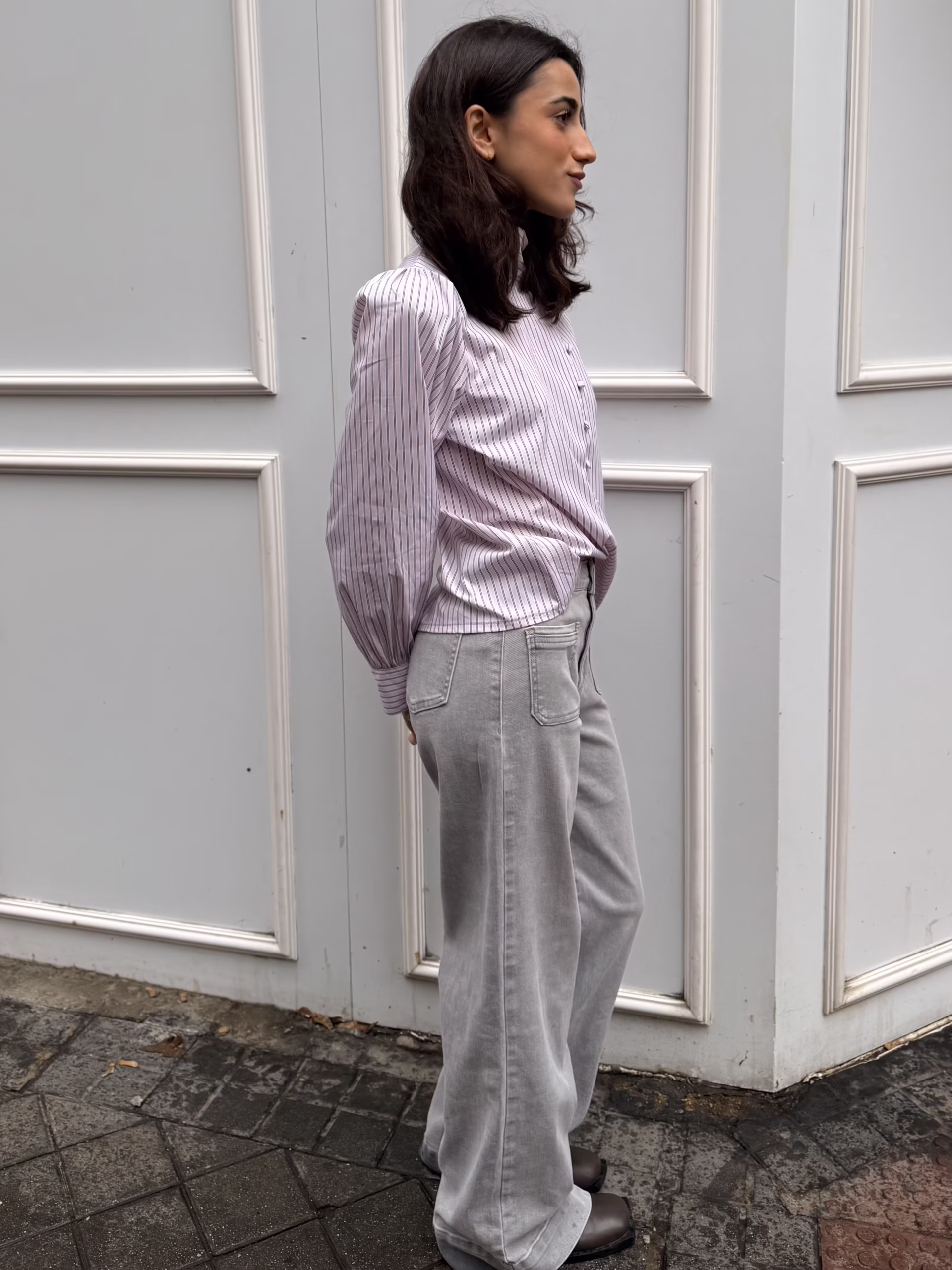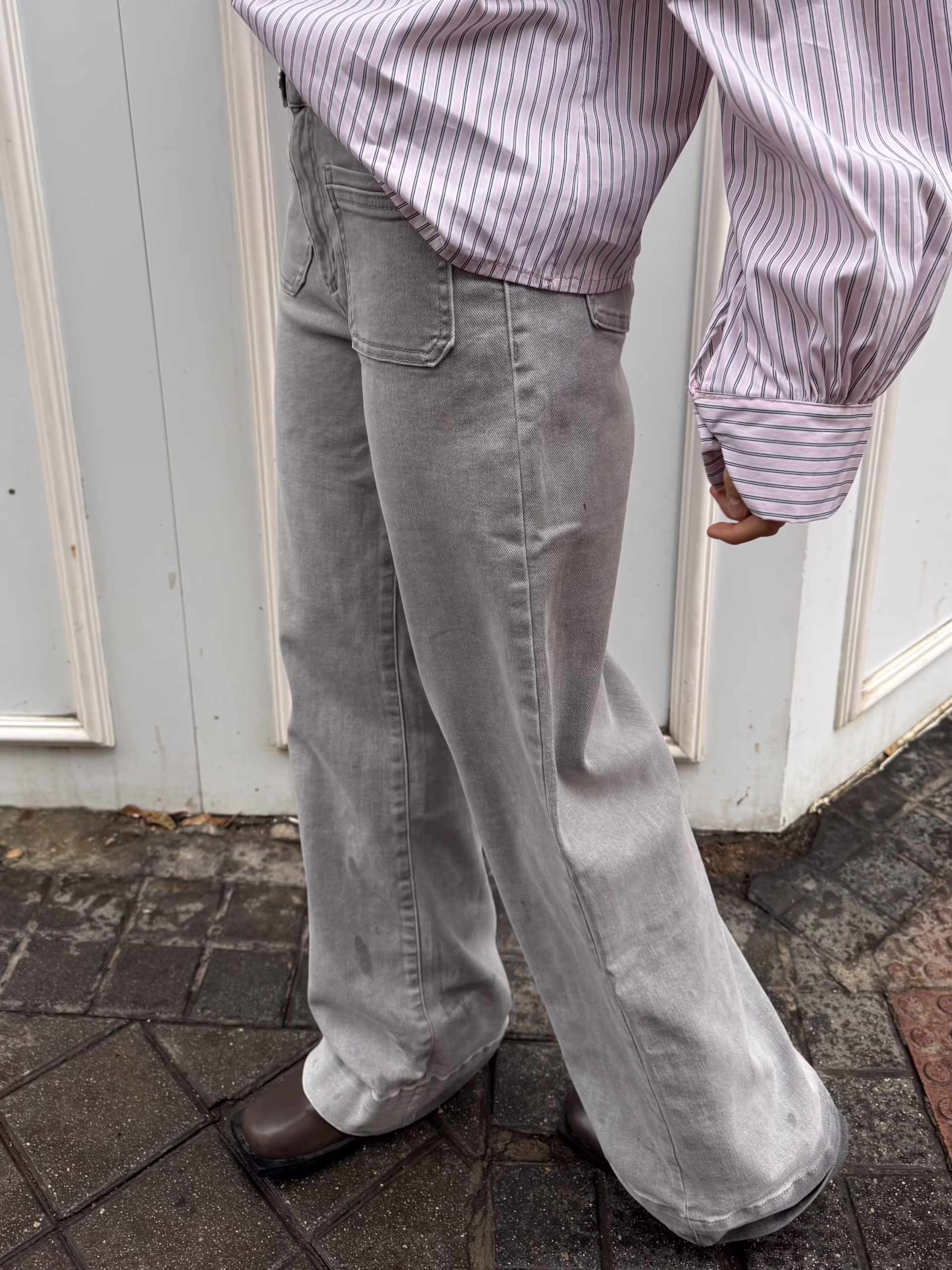 Pantalón recto gris de talle alto con bolsillos delanteros amplios. Diseño estructurado con caída fluida que estiliza la silueta. Ideal para looks de oficina y estilismos casual chic versátiles.