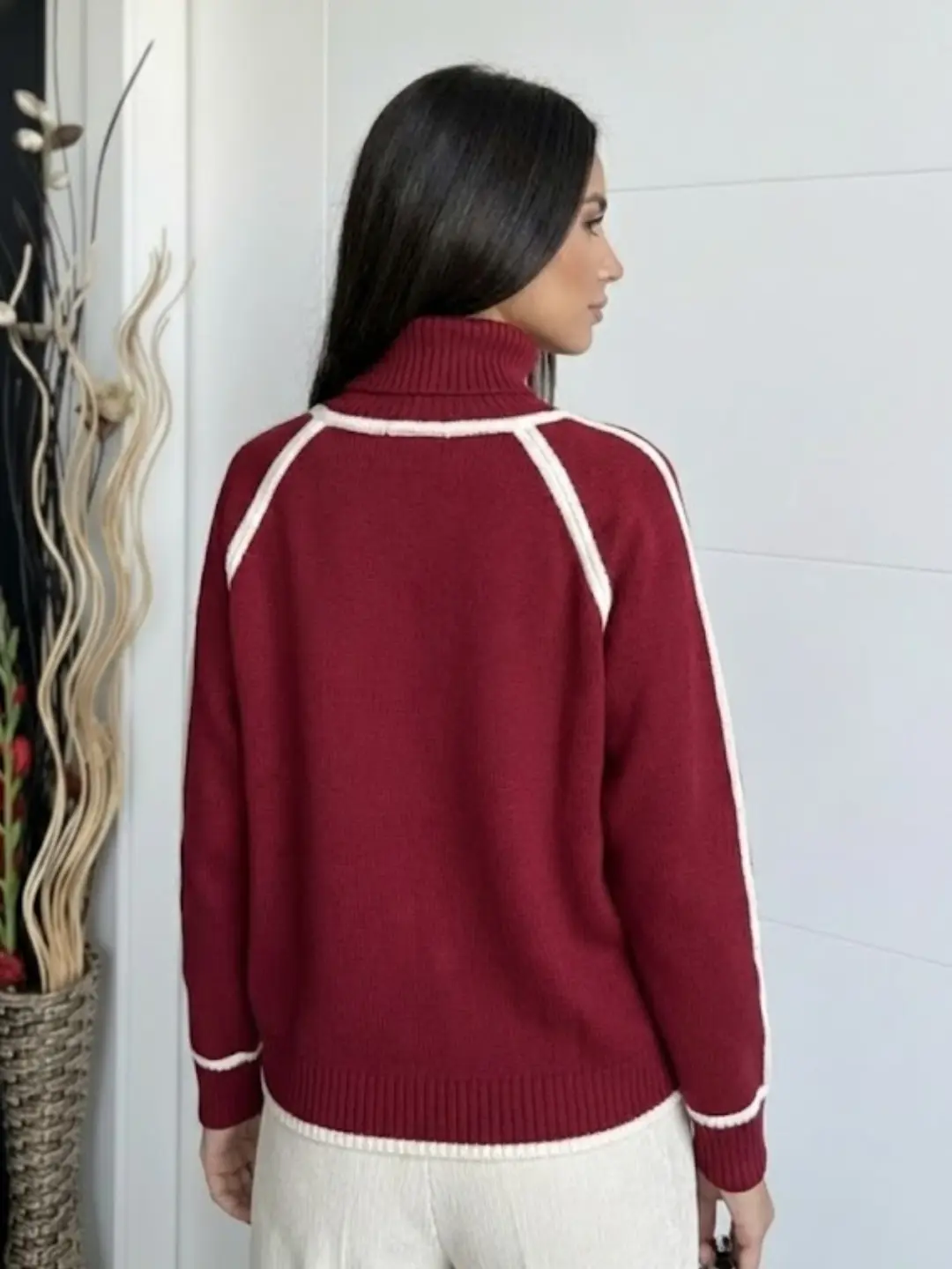 Suéter burdeos con líneas beige en hombros y mangas. Punto suave y cálido, cuello vuelto y diseño recto favorecedor.