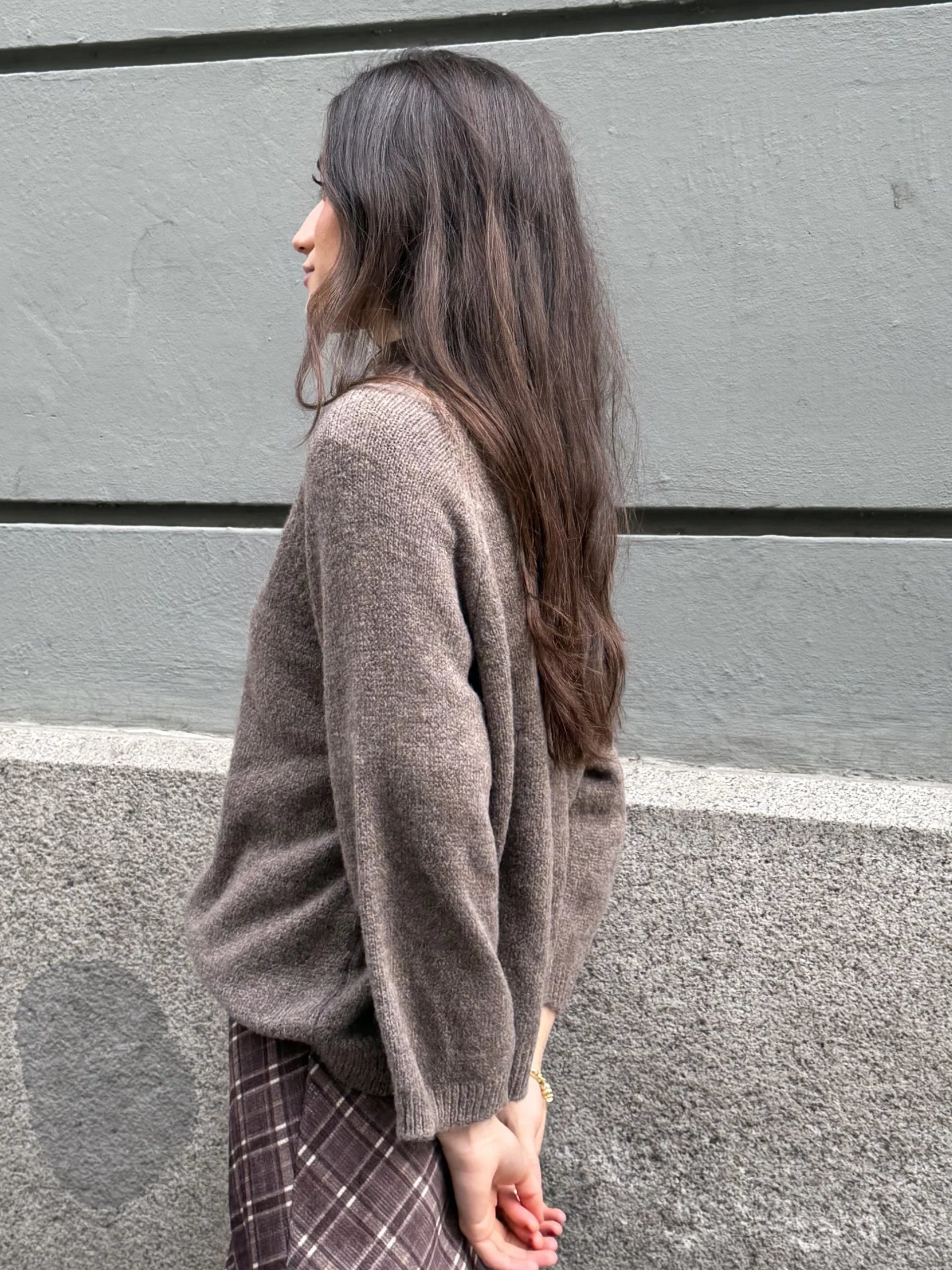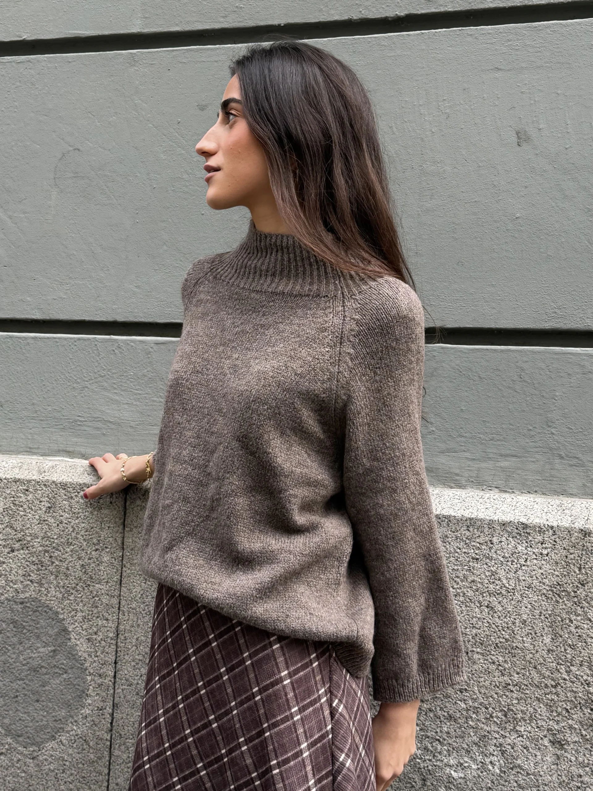 Suéter de punto de color sable con cuello alto estilo chimenea, manga recta. Cómodo, versátil y fácil de combinar con faldas o pantalones de invierno.