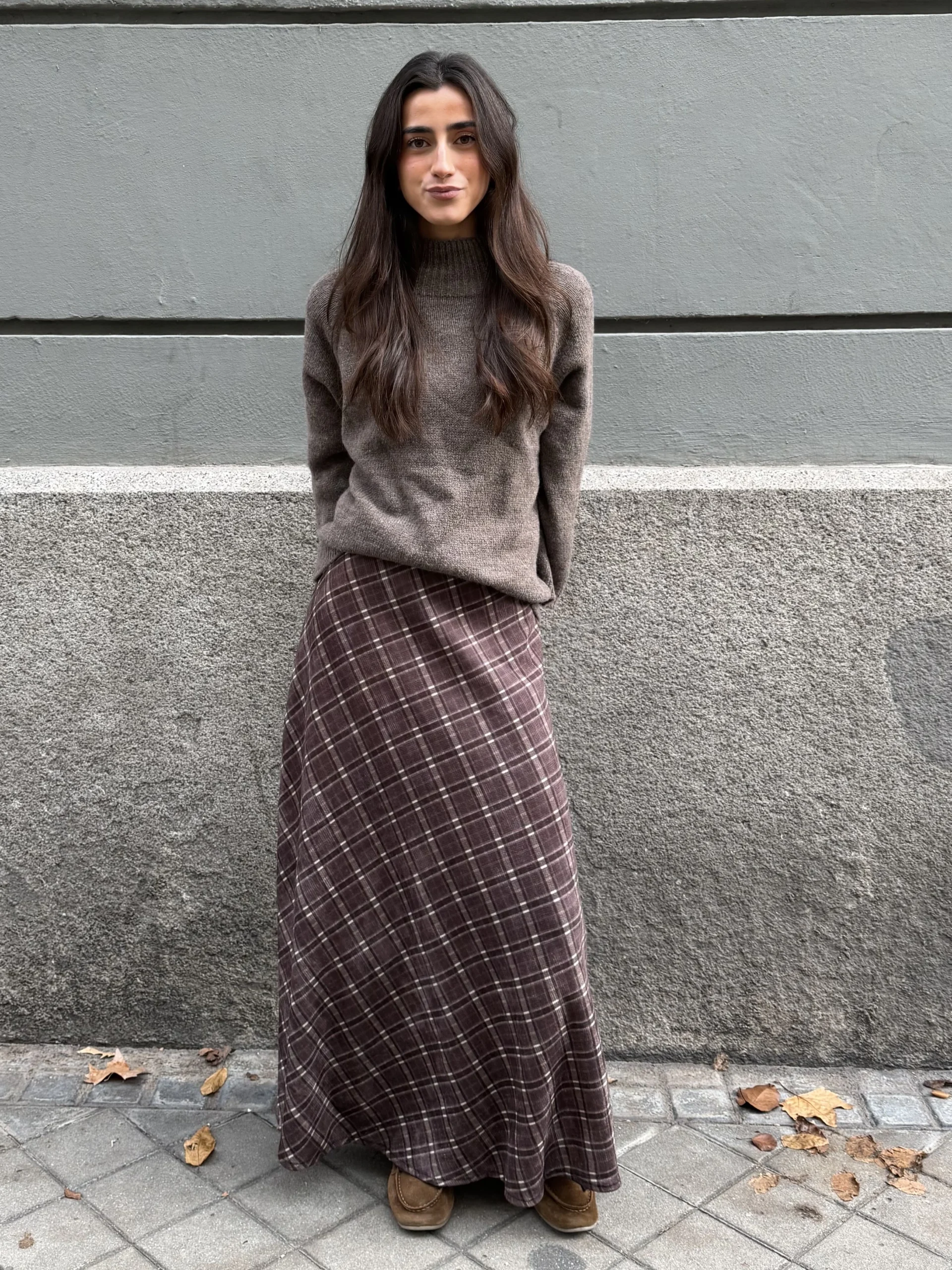 Falda Larga Pana Planchada Cuadros Grisácea