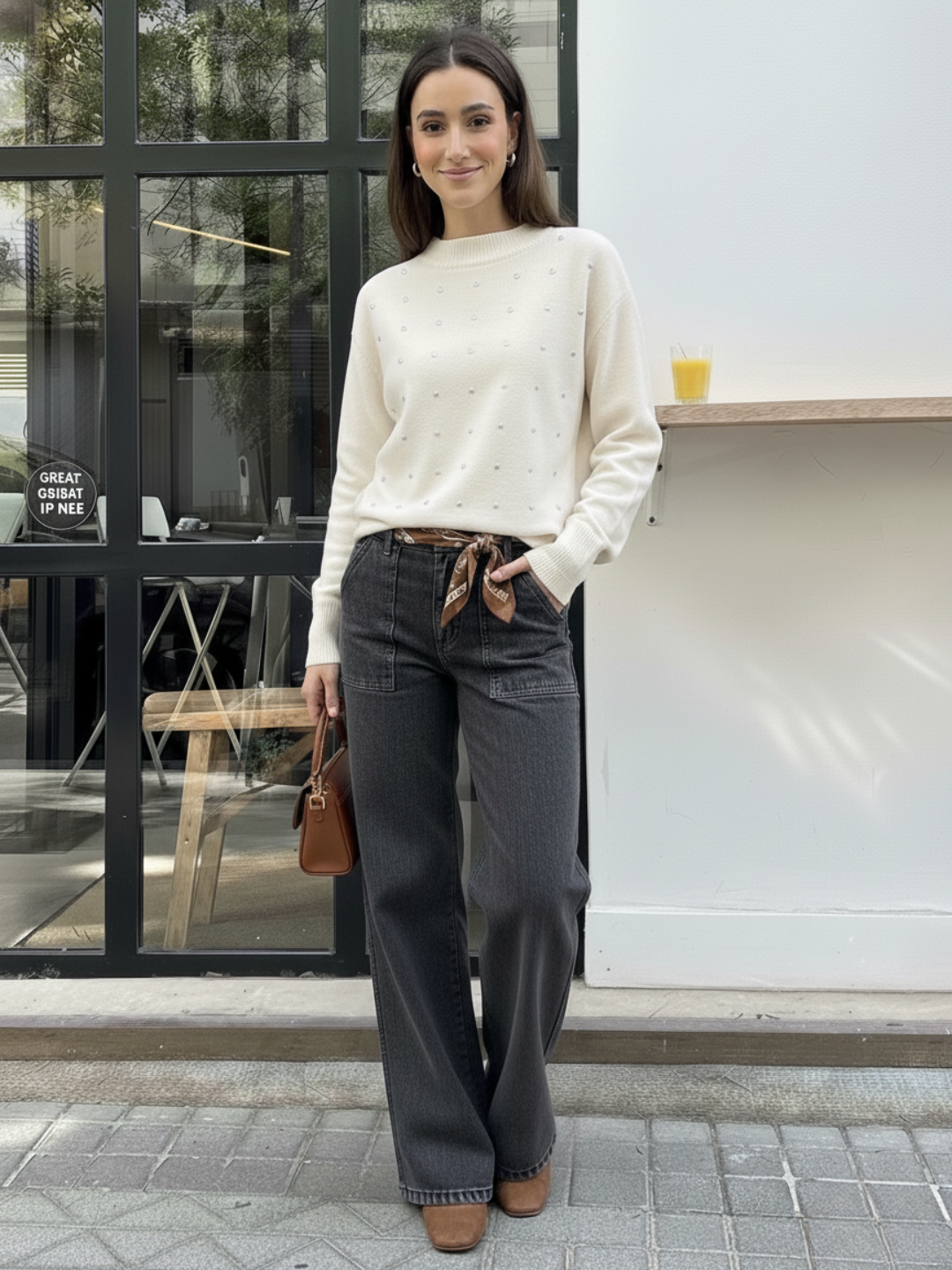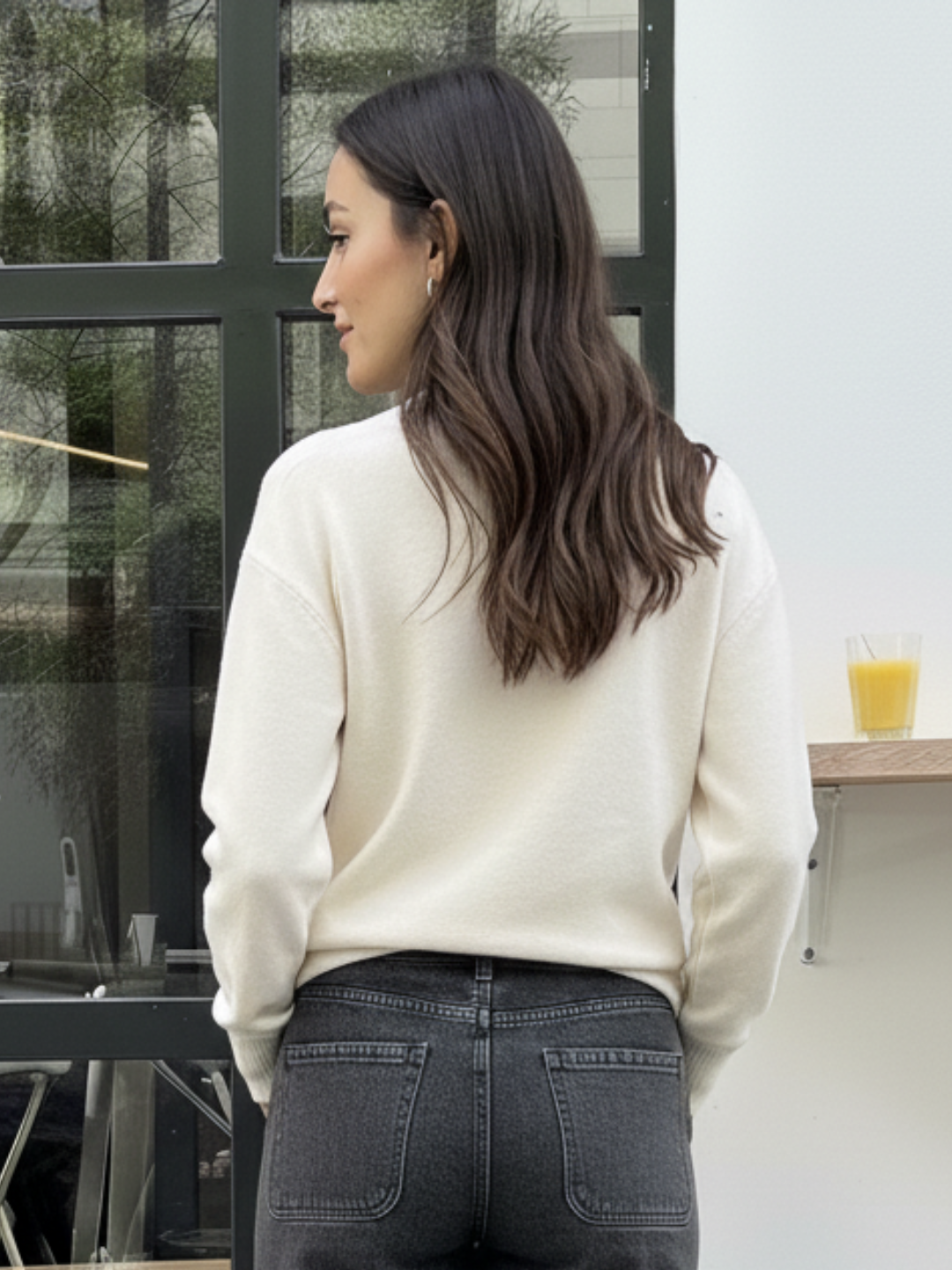 Jersey crudo con detalles brillantes integrados en el tejido. Diseño de cuello redondo, manga larga y acabado acanalado en puños y bajo. Suave, cálido y ligero.