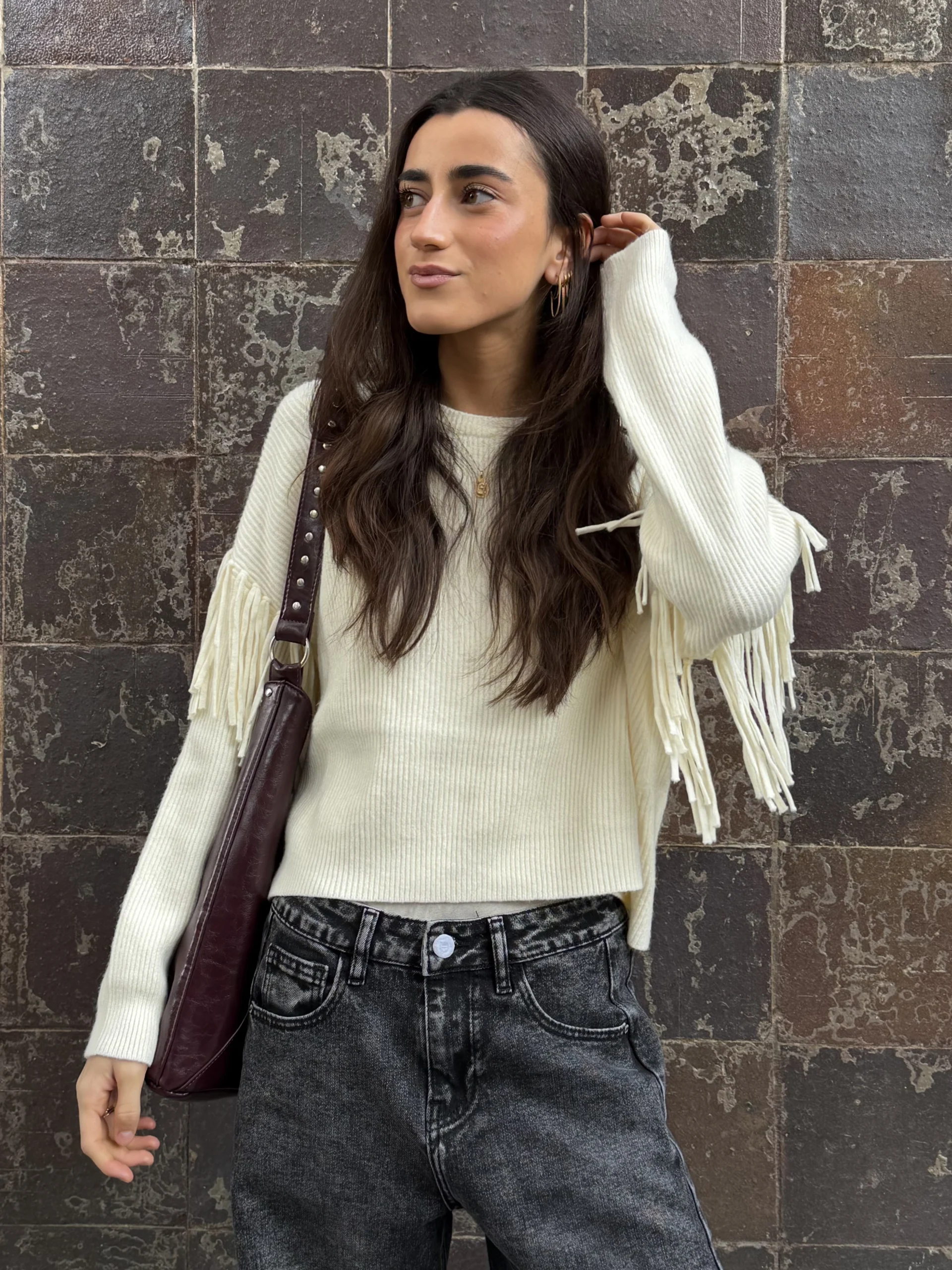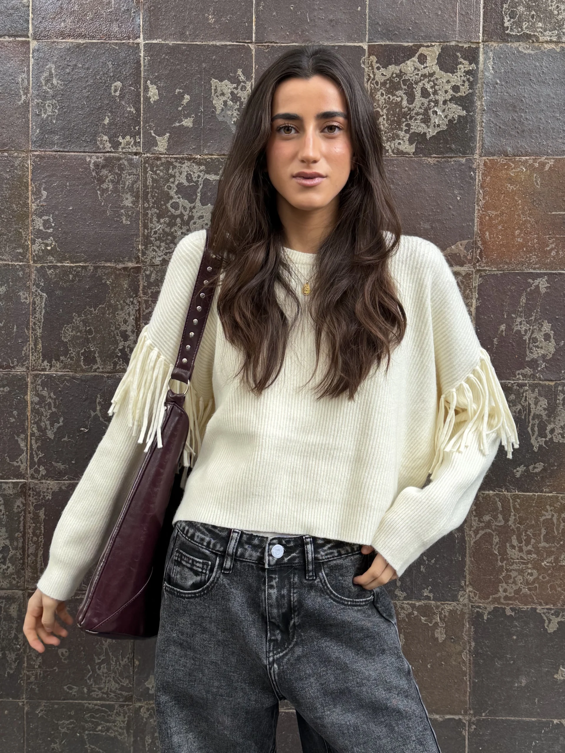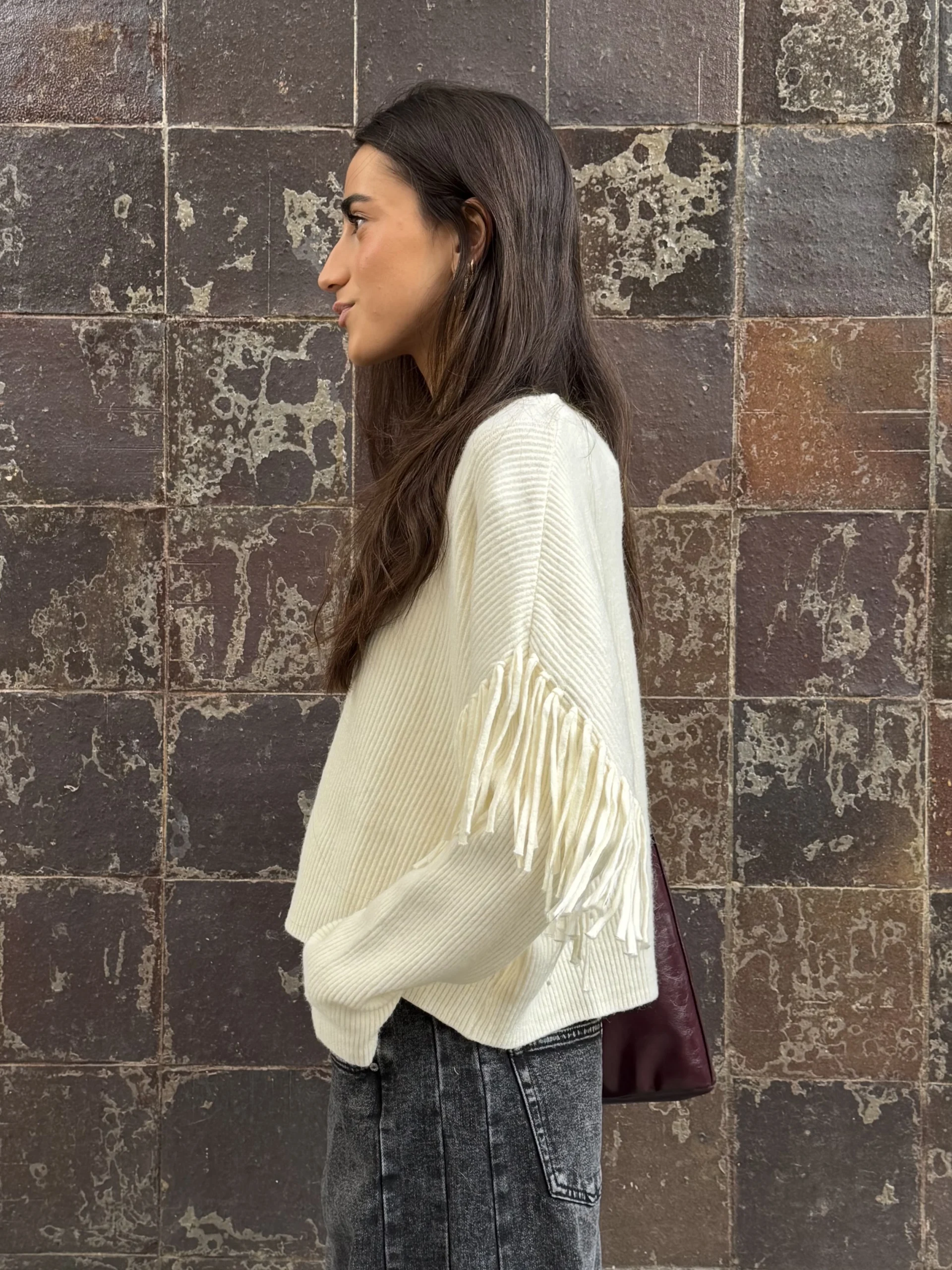 Suéter crudo de punto suave con flecos en las mangas, diseño moderno y elegante. Corte ligeramente cropped, tacto agradable y perfecto para looks casual chic.