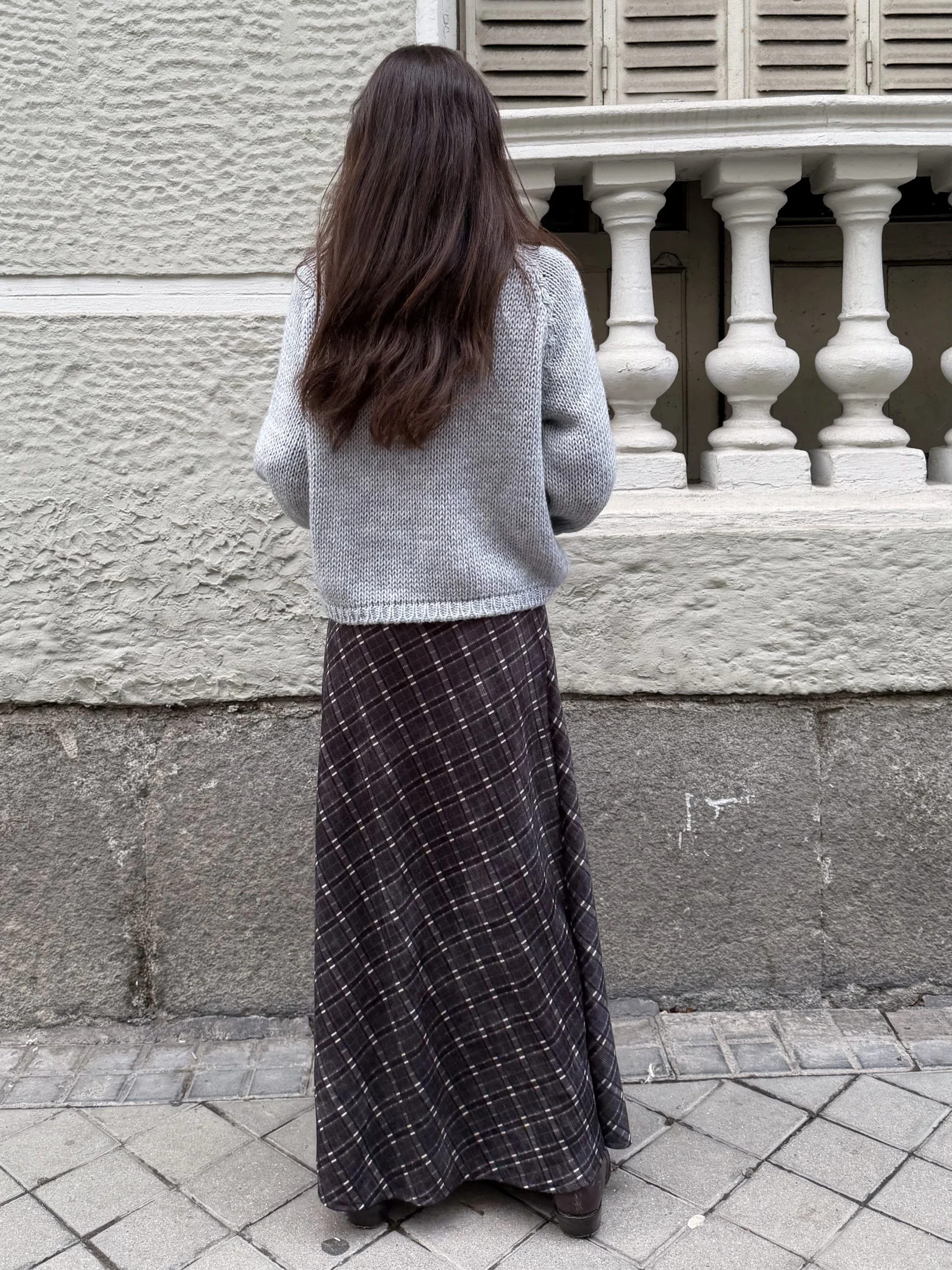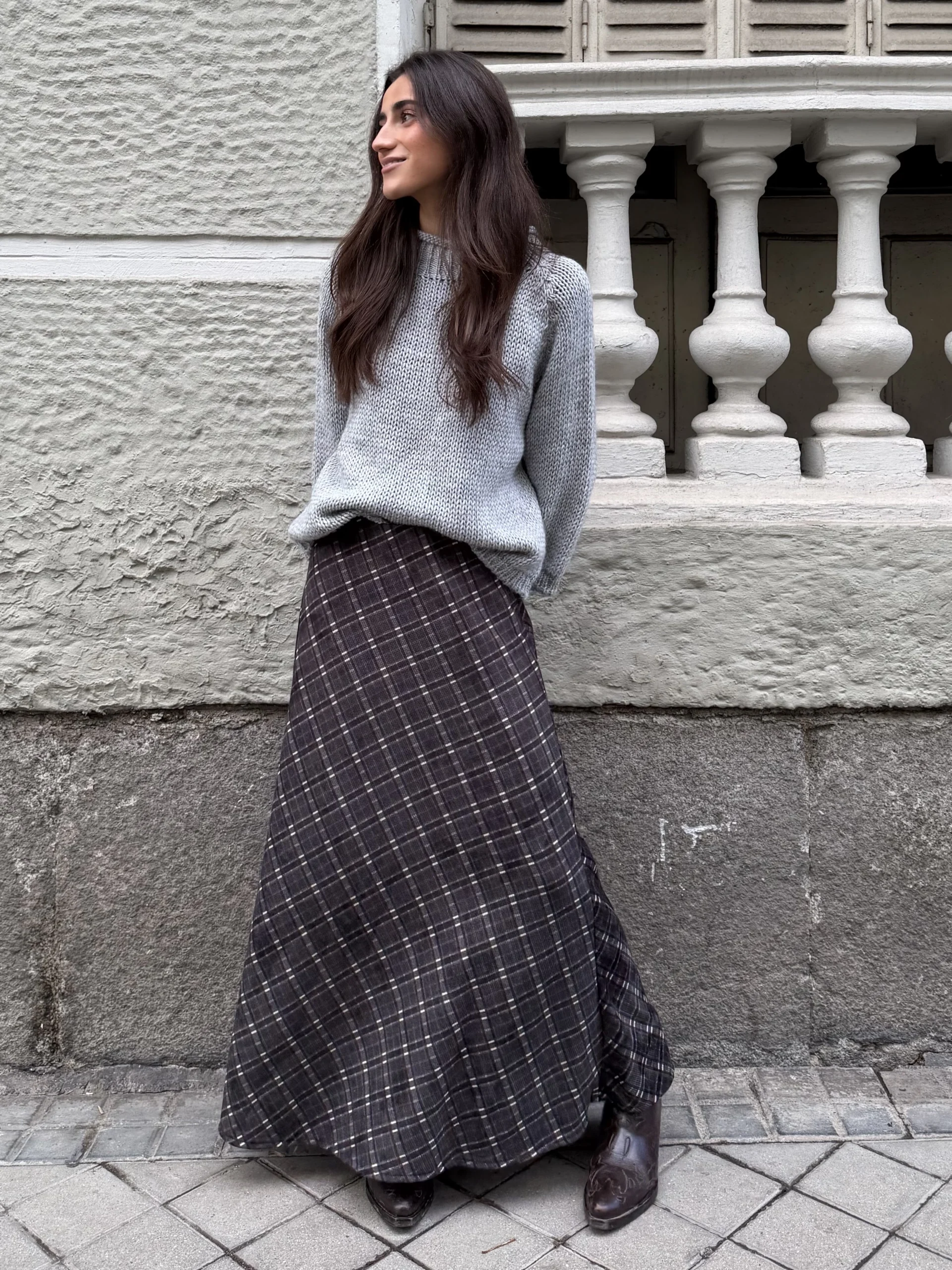 Falda Larga Pana Planchada Cuadros Grisácea