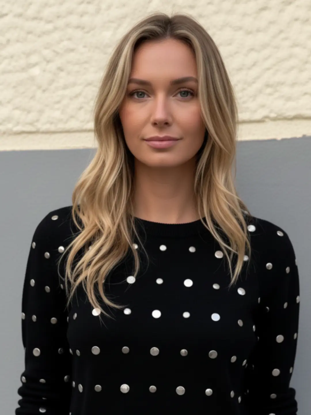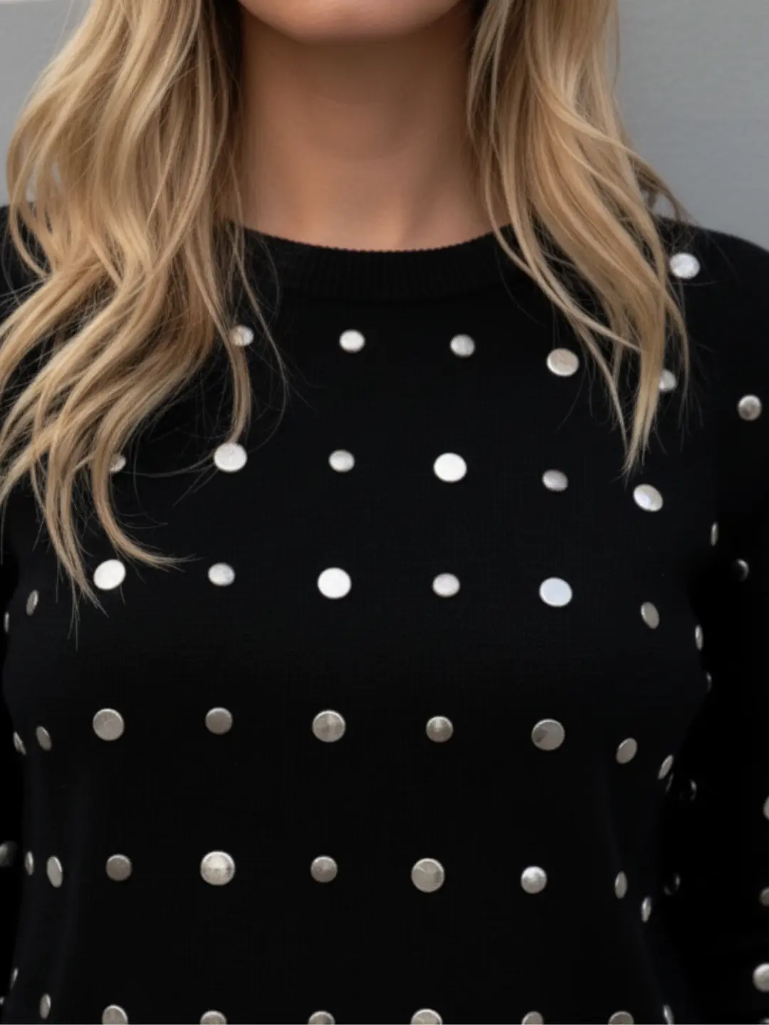 Suéter negro de punto fino suave con tacto agradable y caída ligera. Presenta cuello redondo clásico, manga larga con puño rematado. El punto es compacto pero ligero, perfecto para entretiempo. Decorado con tachuelas metálicas plateadas distribuidas de forma uniforme.