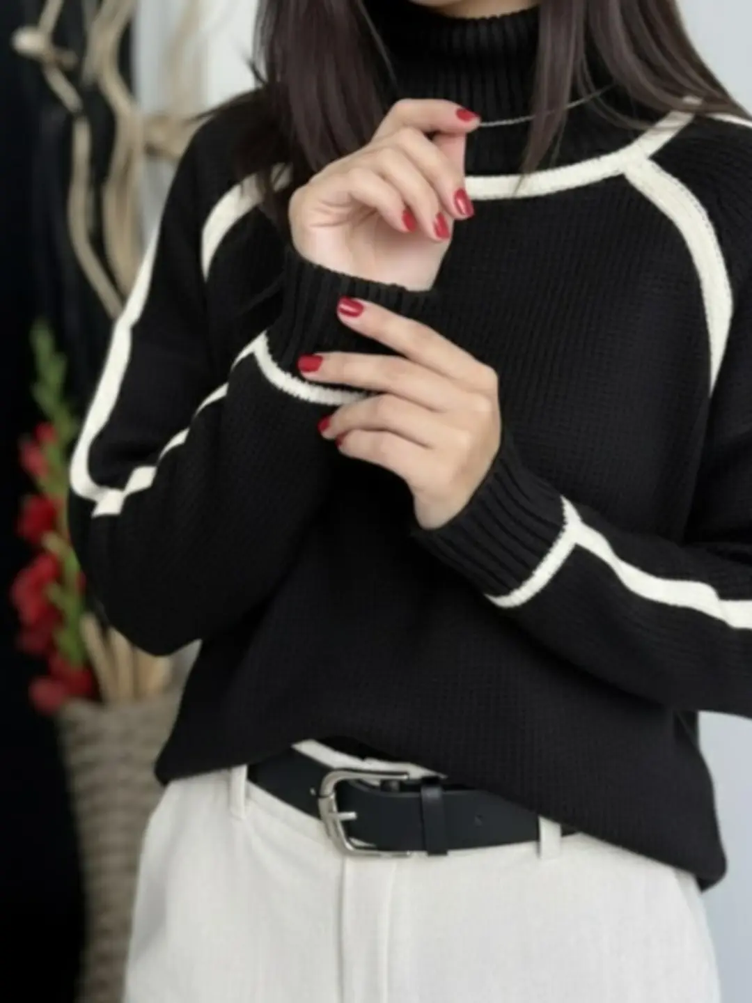 Suéter negro con líneas em crudo en hombros y mangas. Punto suave y cálido, cuello vuelto y diseño recto favorecedor.