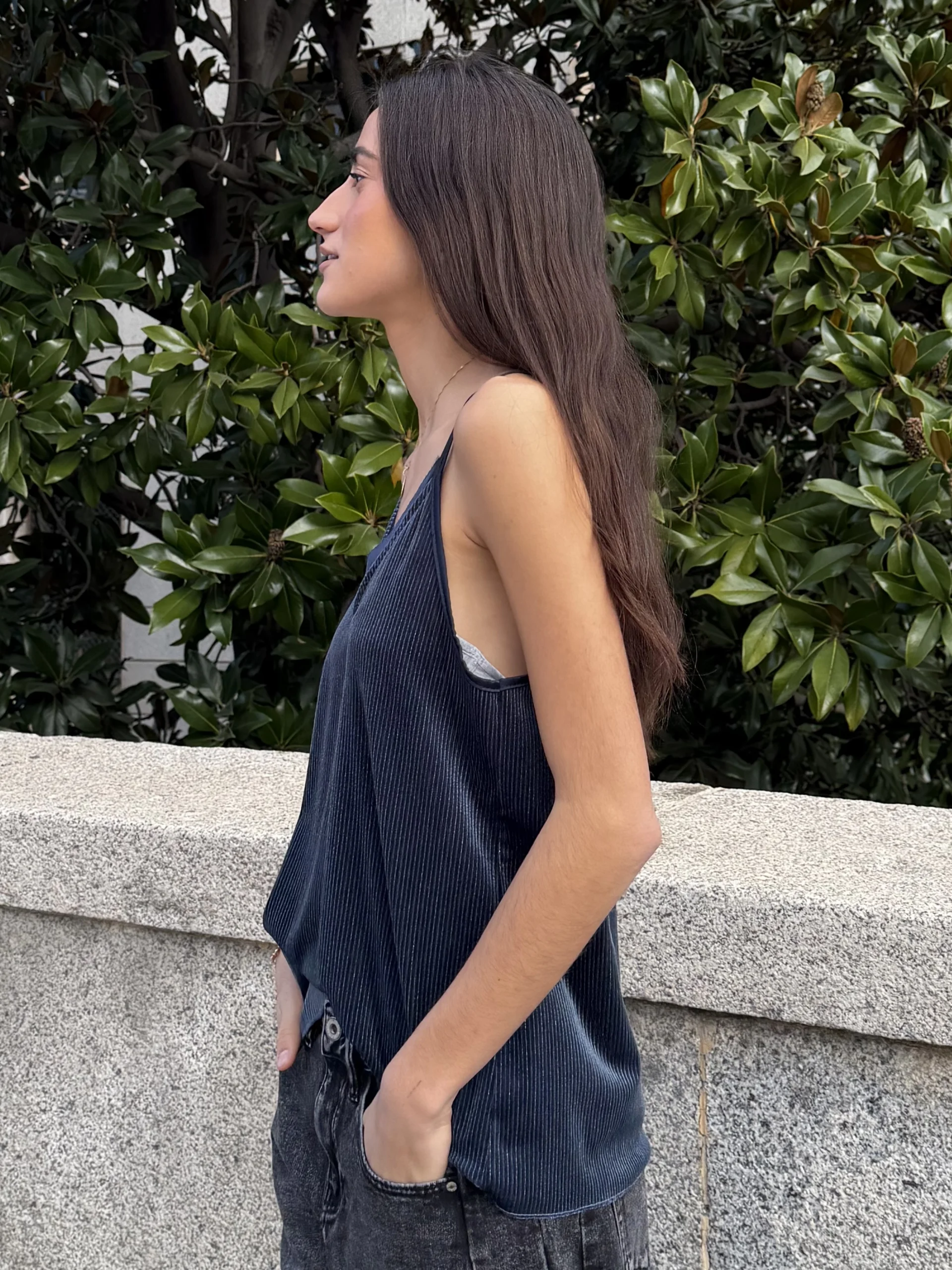Top azul grisáceo aterciopelado de tirantes finos, con acabado plisado y caída fluida. Elegante, versátil y perfecto para looks casual chic o de noche.