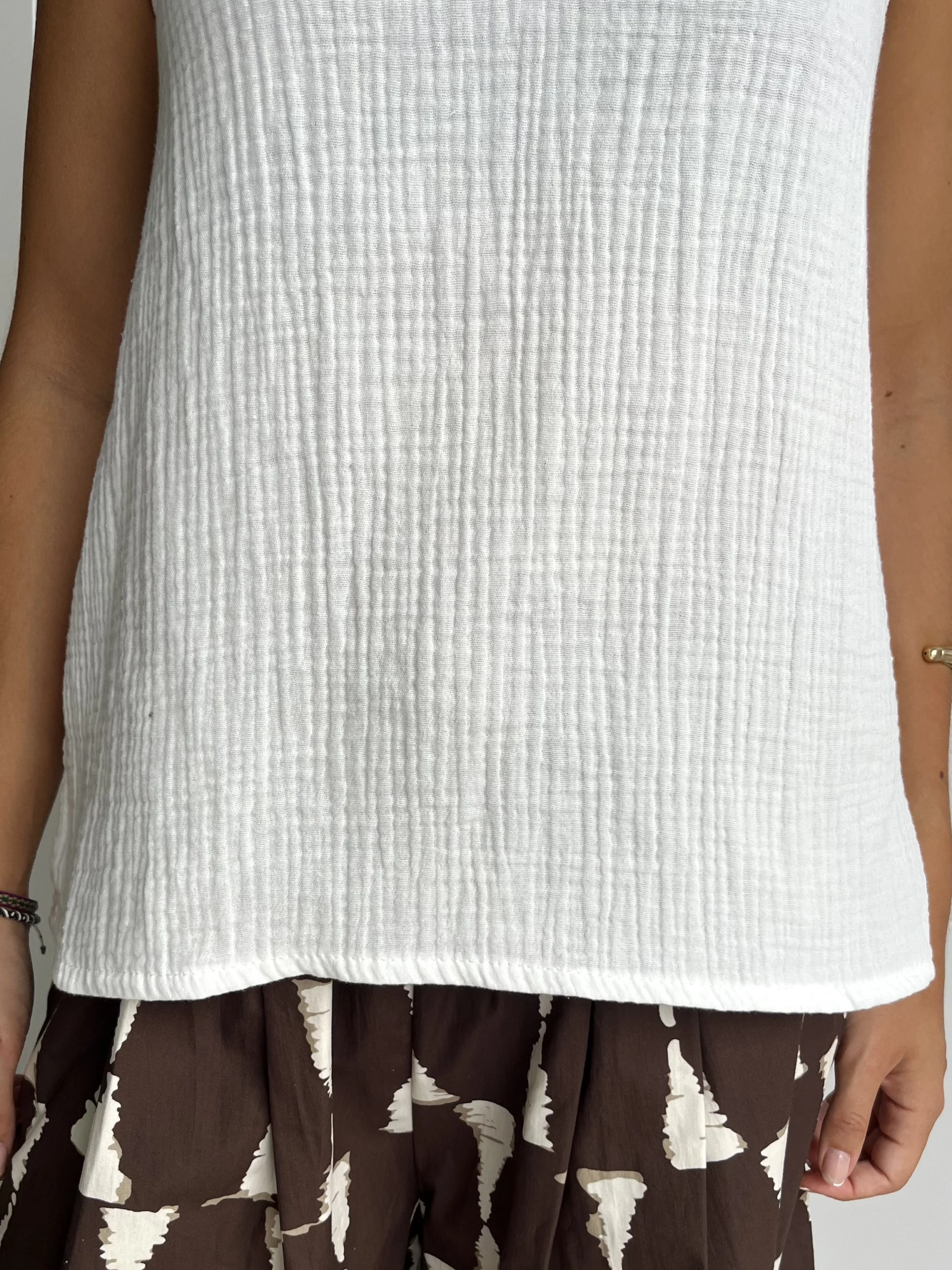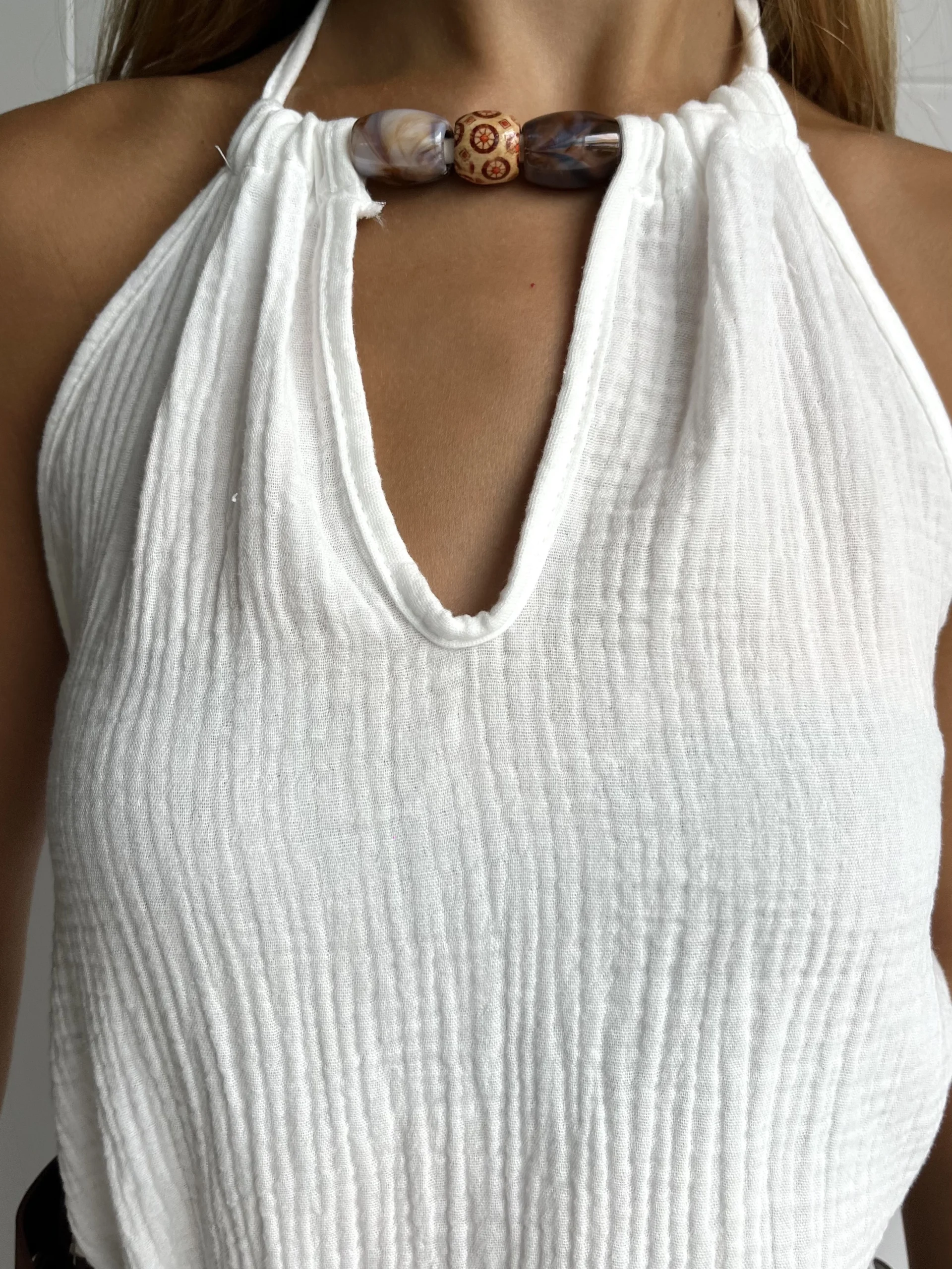 Top blanco de tirantes de algodón con escote halter y abertura en el pecho. Lazada en la nuca y tres bolas marrones en el cuello.