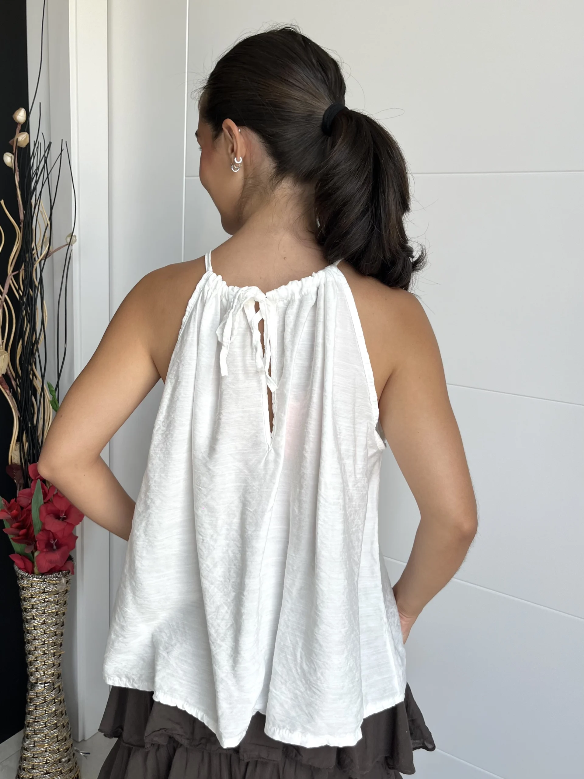 Top blanco de tirantes con escote halter, lazada en la nuca. Con bolas en el escote.