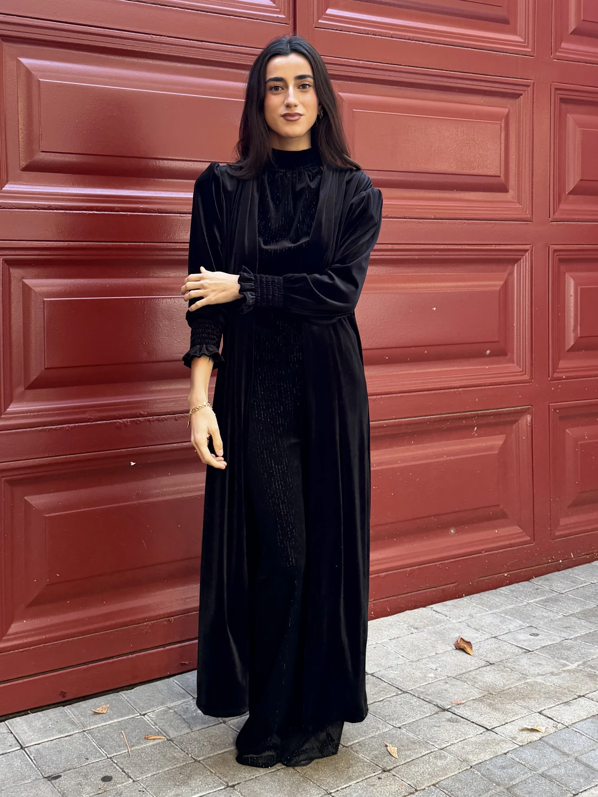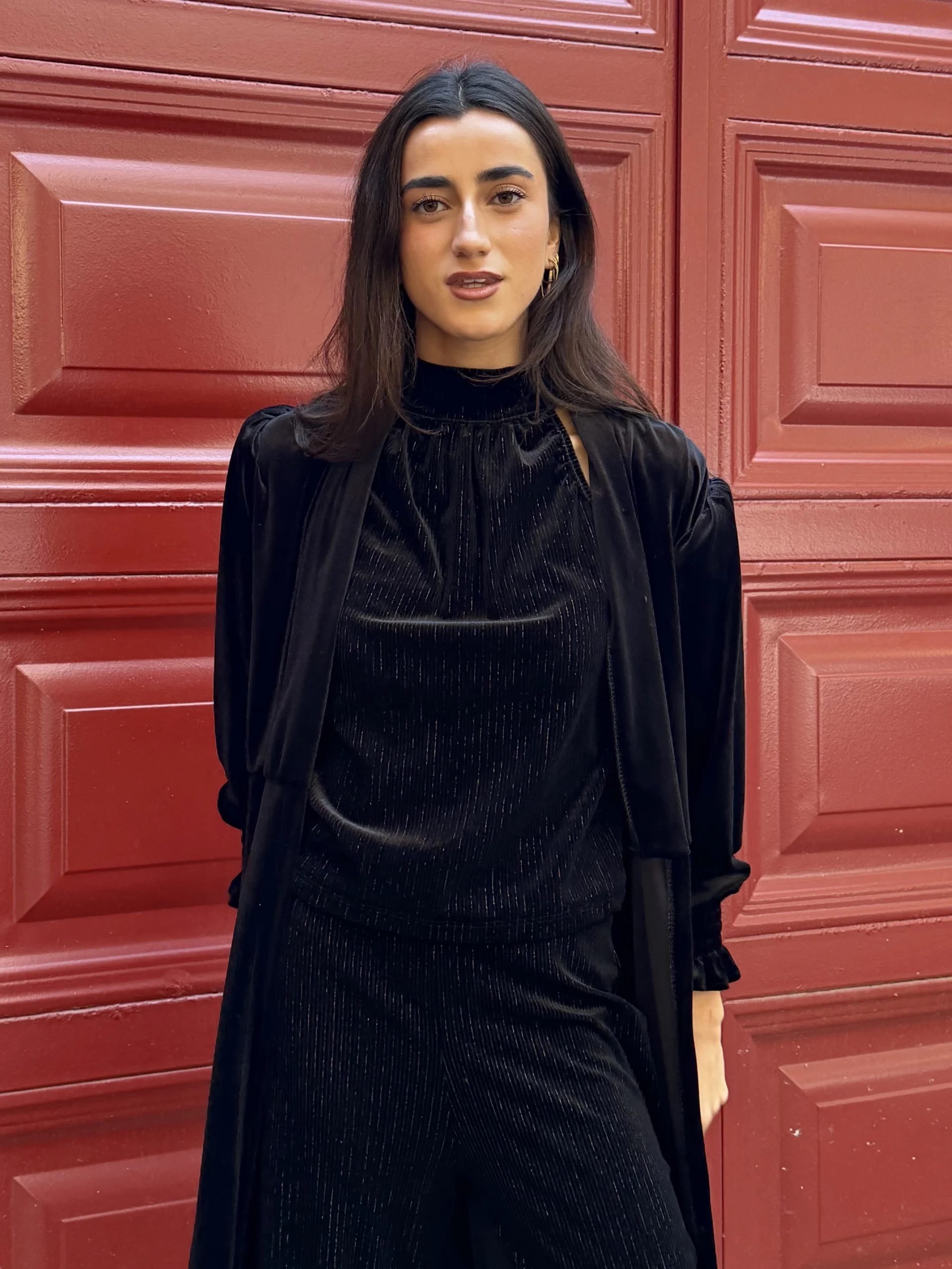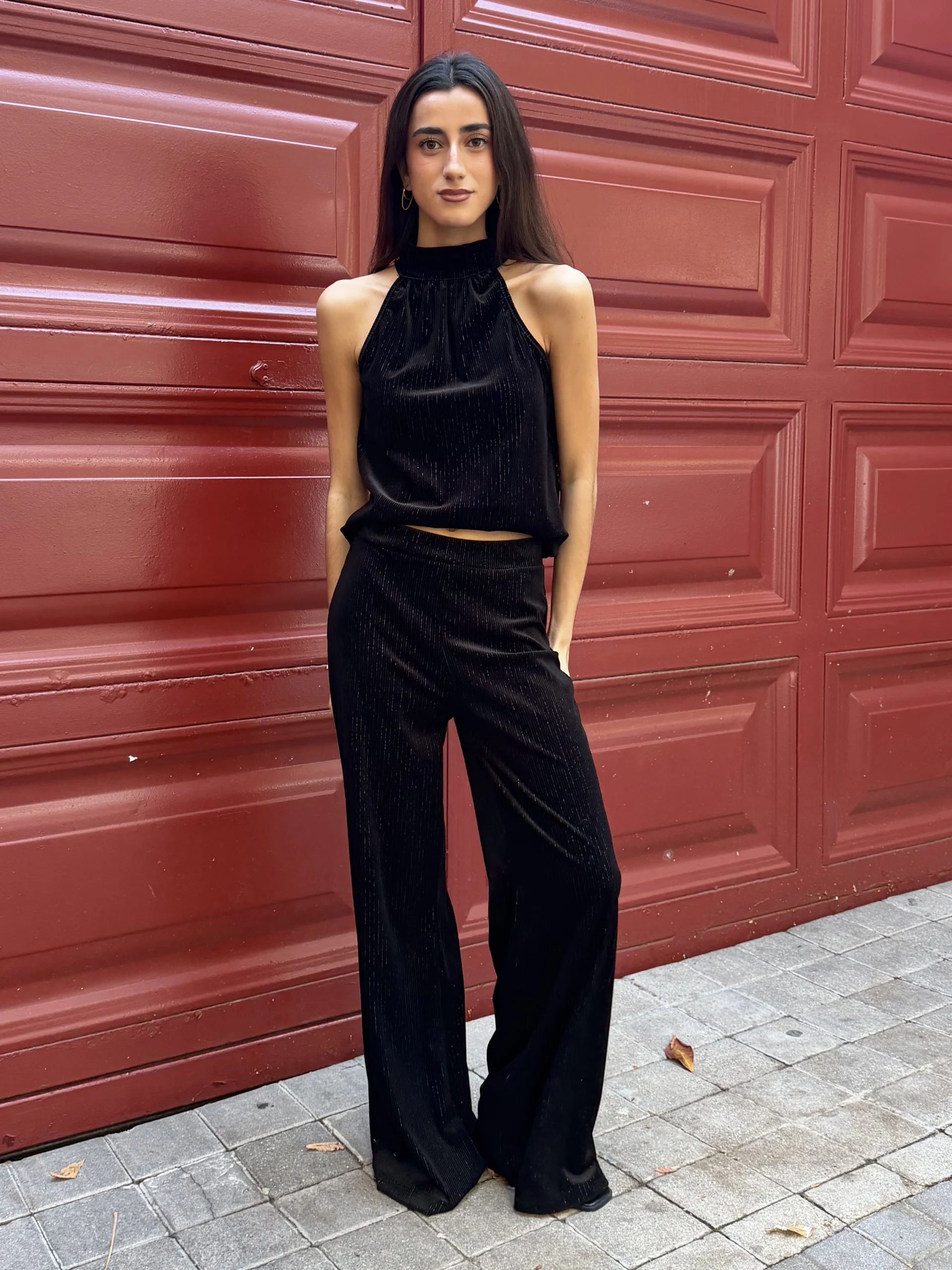 Top negro aterciopelado con cuello halter fruncido y caída fluida. Tejido brillante efecto plisado. Elegante, cómoda y perfecta para looks de noche o conjuntos coordinados.