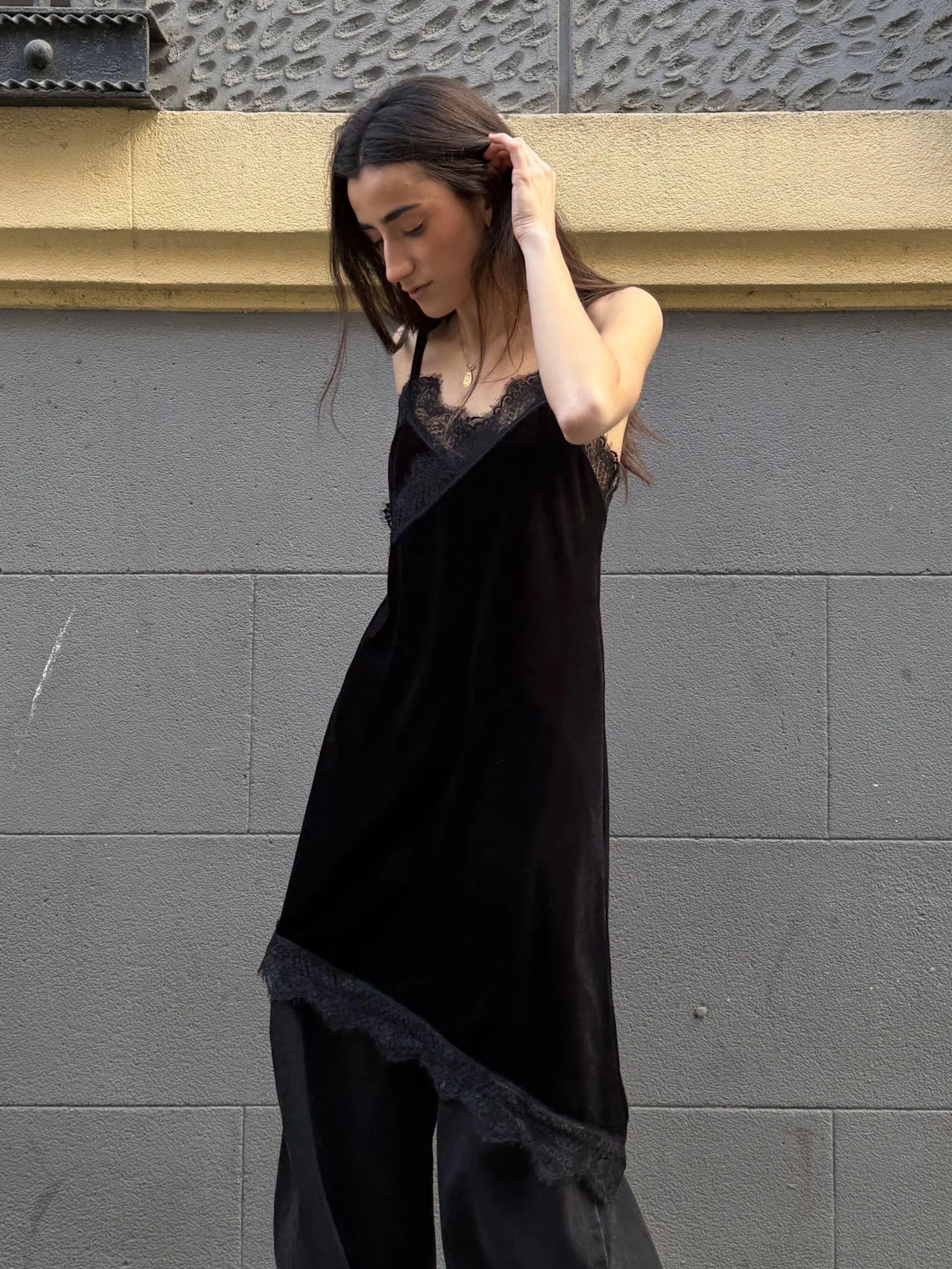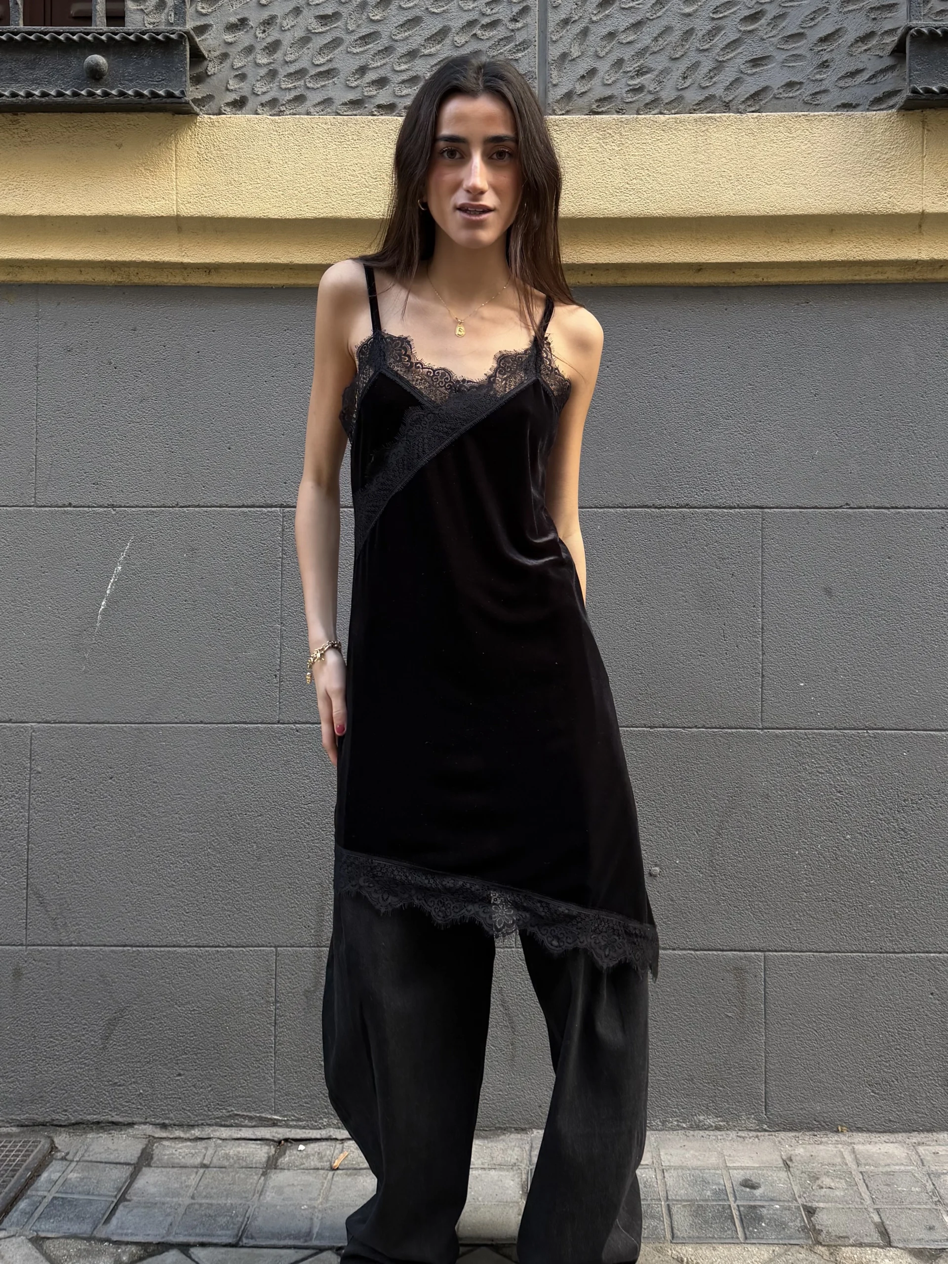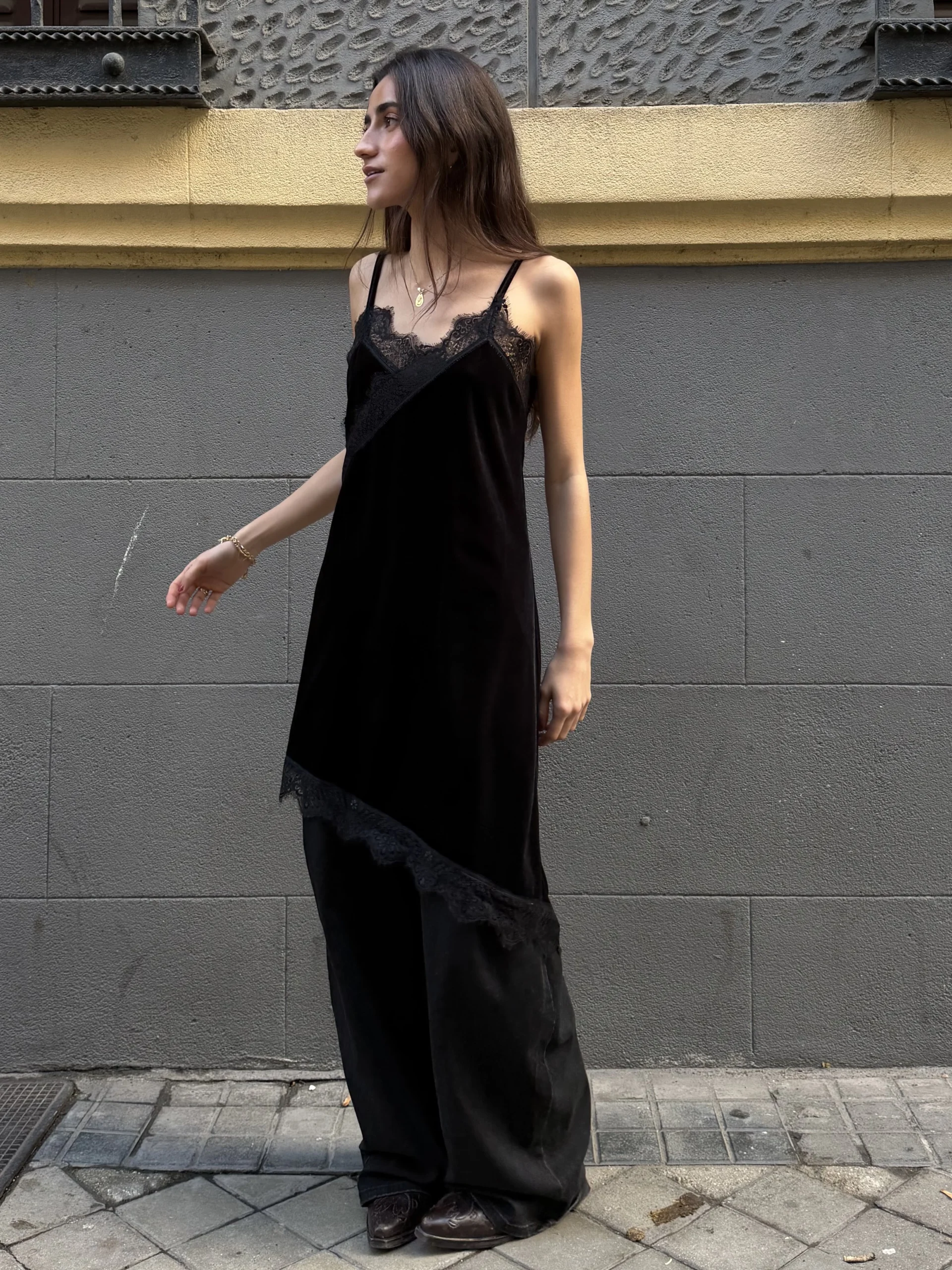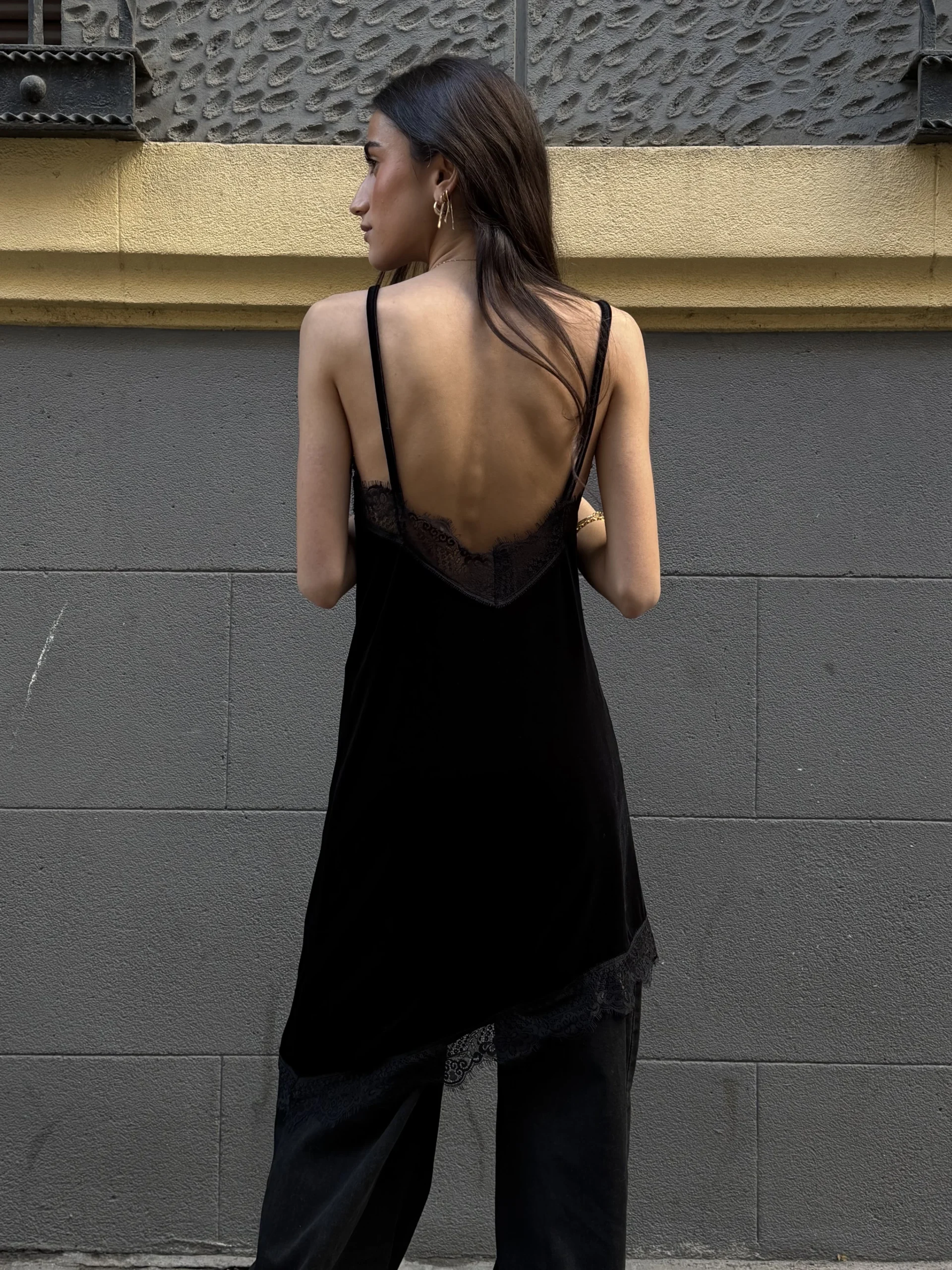 Top lencero negro con escote en pico y detalle de encaje floral. Tirantes finos y tejido fluido con caída ligera. Bajo asimétrico rematado en encaje que aporta movimiento.