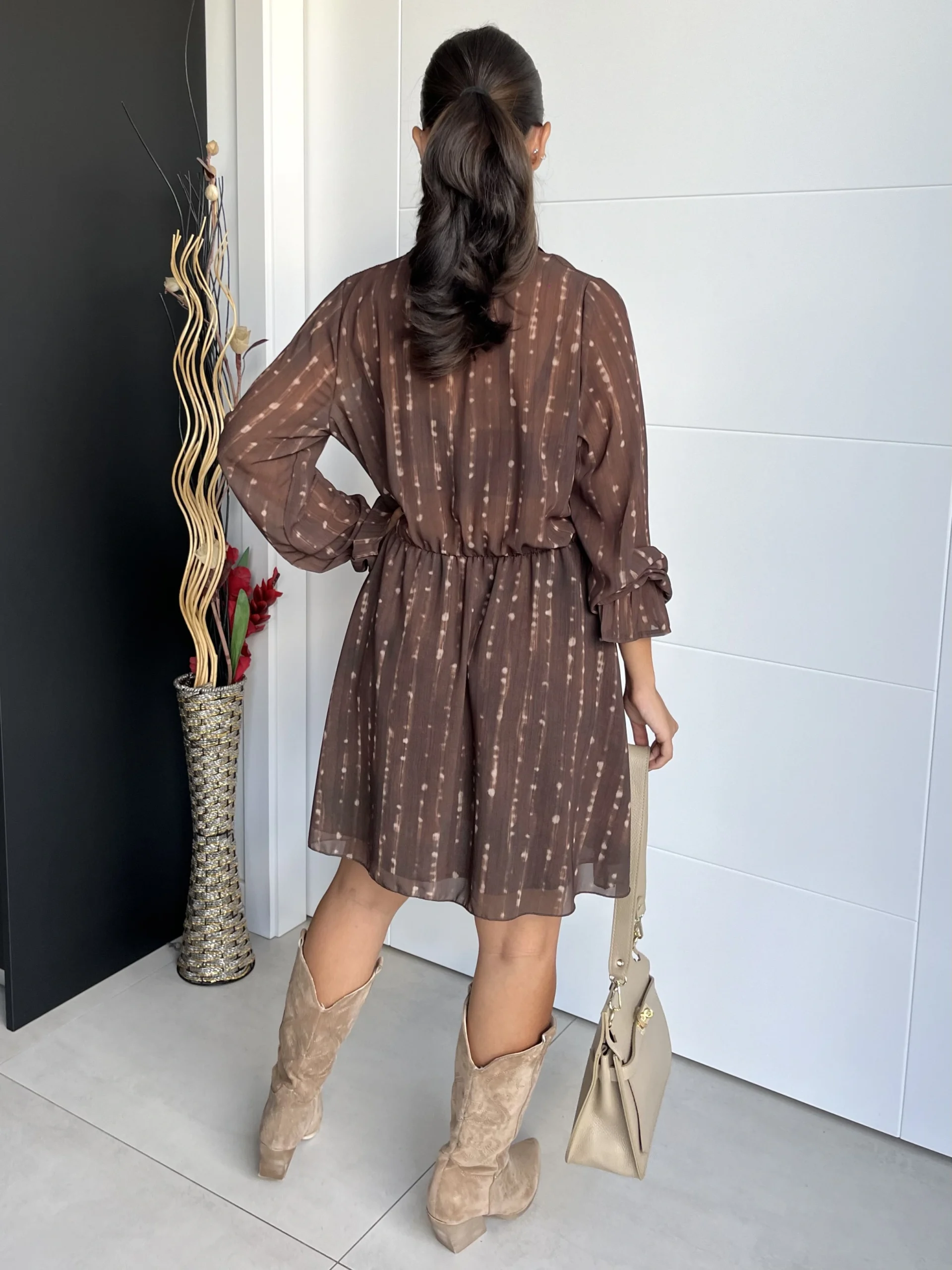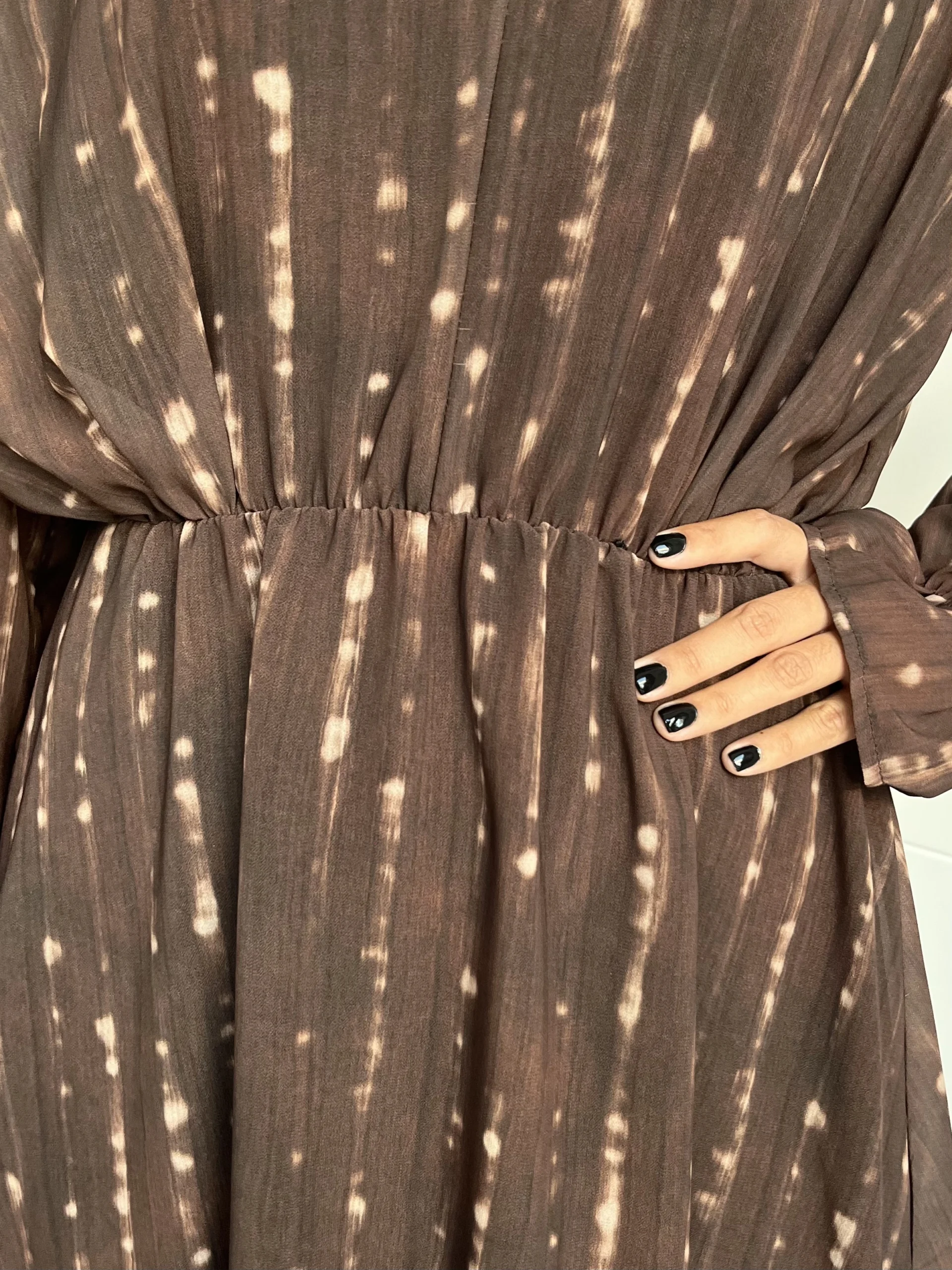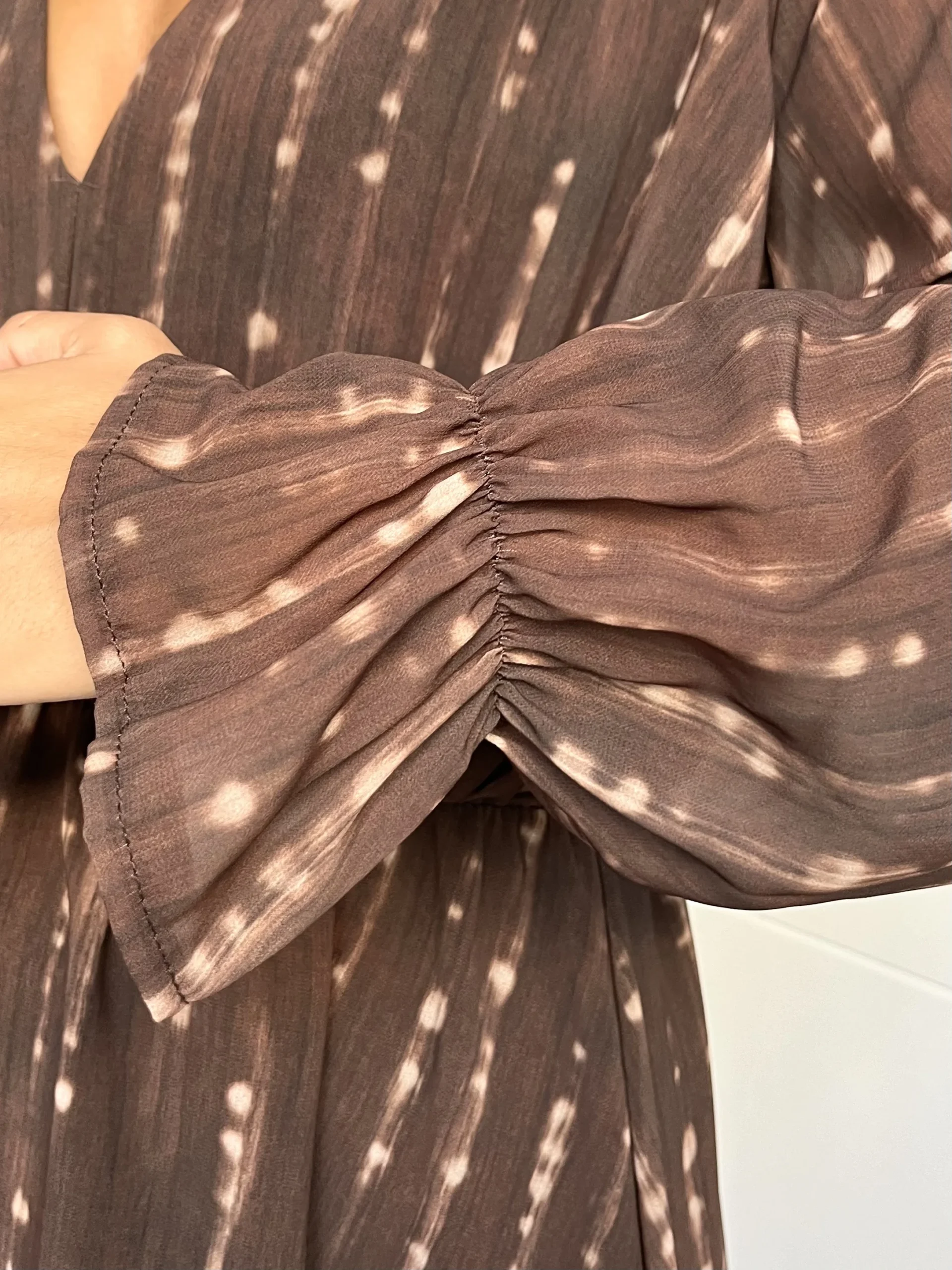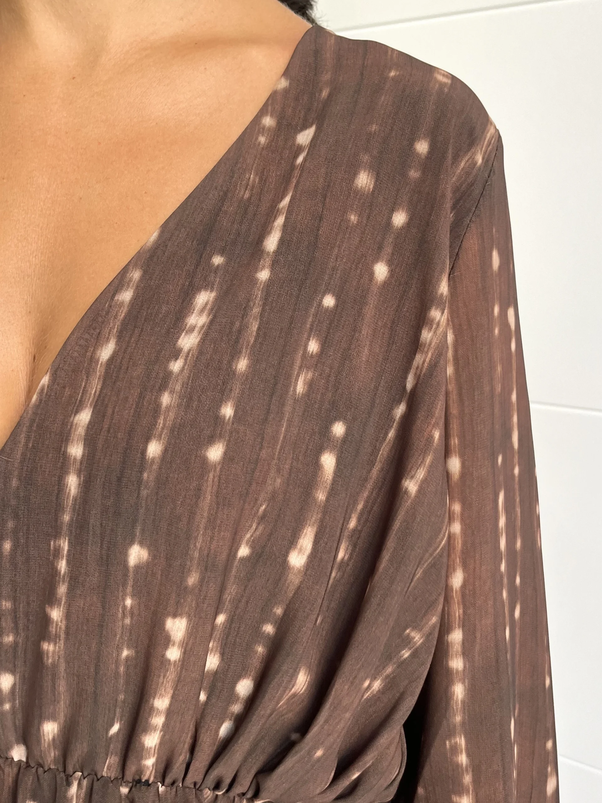 Vestido corto de gasa en color marrón chocolate con estampado en crudo difuminado. Escote en pico, manga larga y goma elástica en los puños y en la cintura. Forro interior negro.
