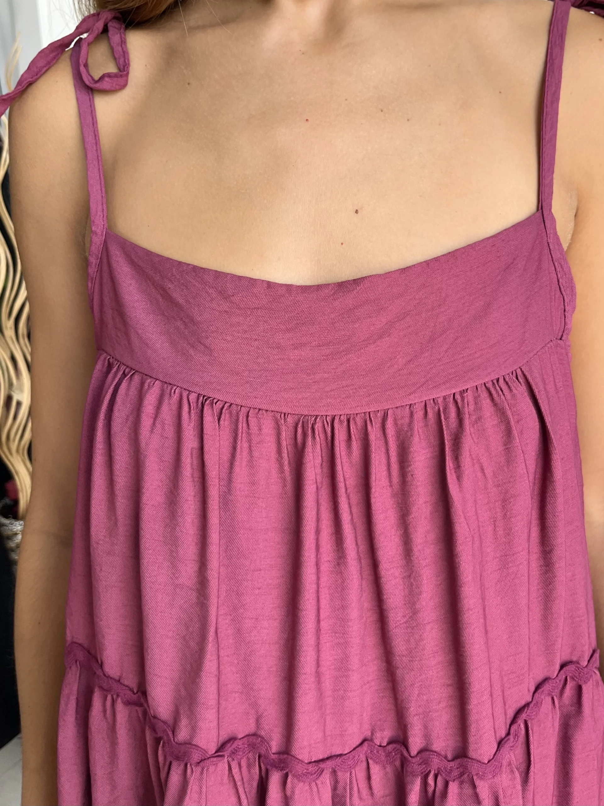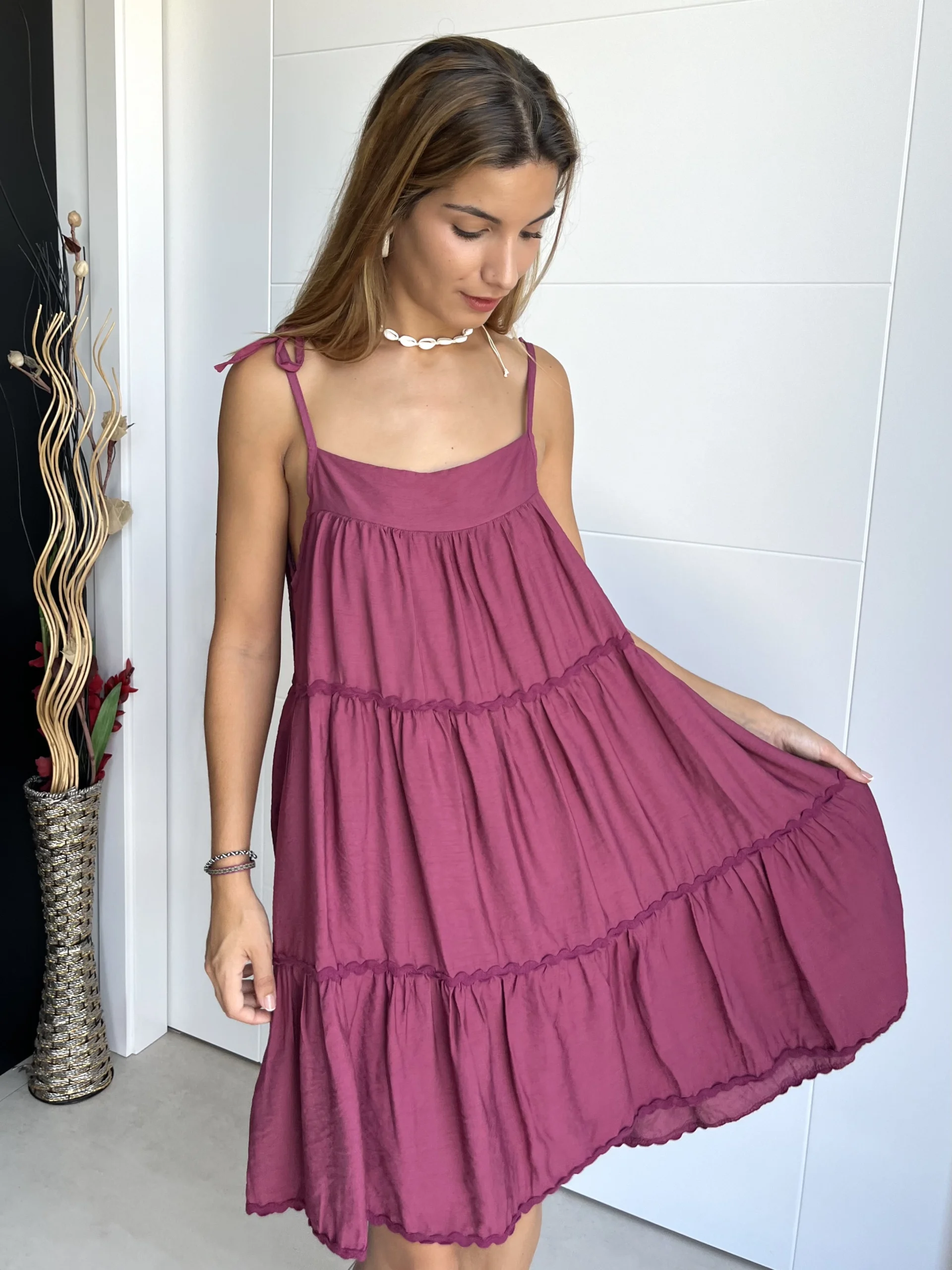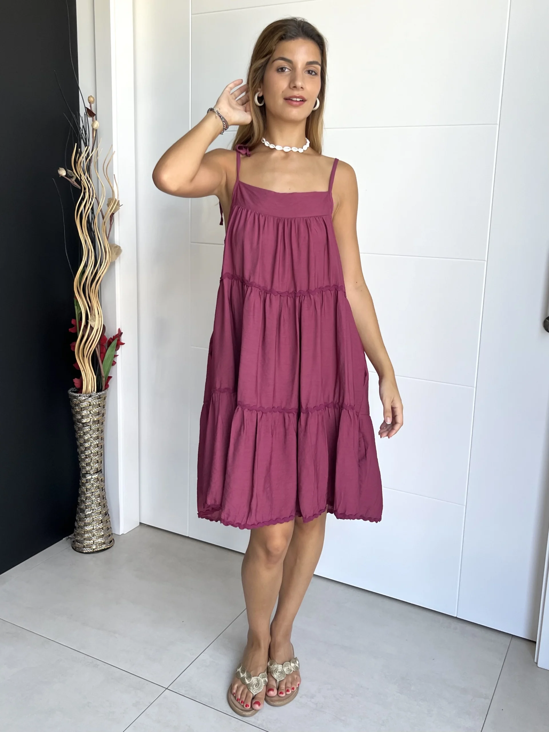 Vestido corto de tirantes con lacitos en color berenjena. Vestido ancho, con volantes en la falda y con bolsillos laterales. No tiene forro interior.