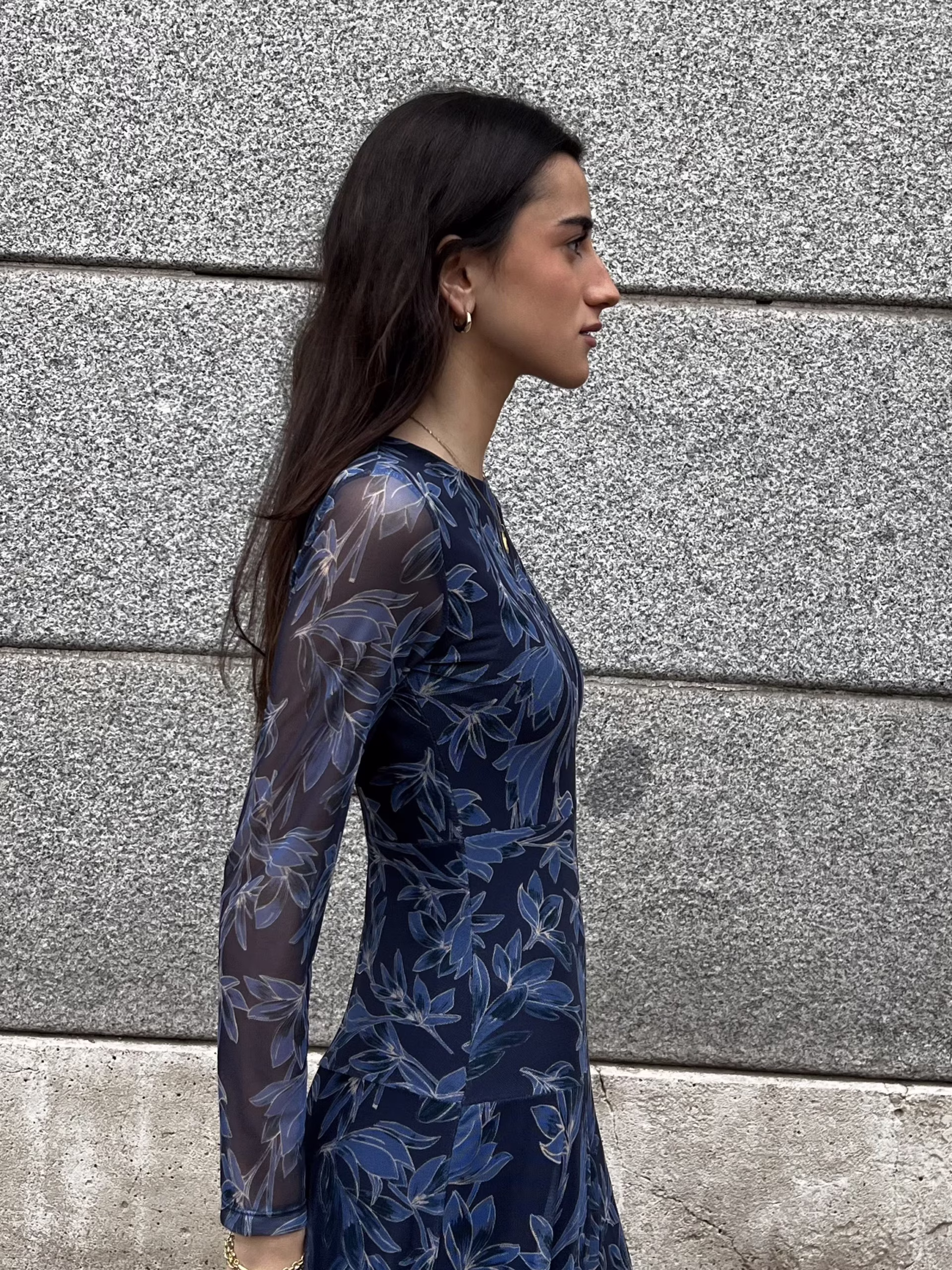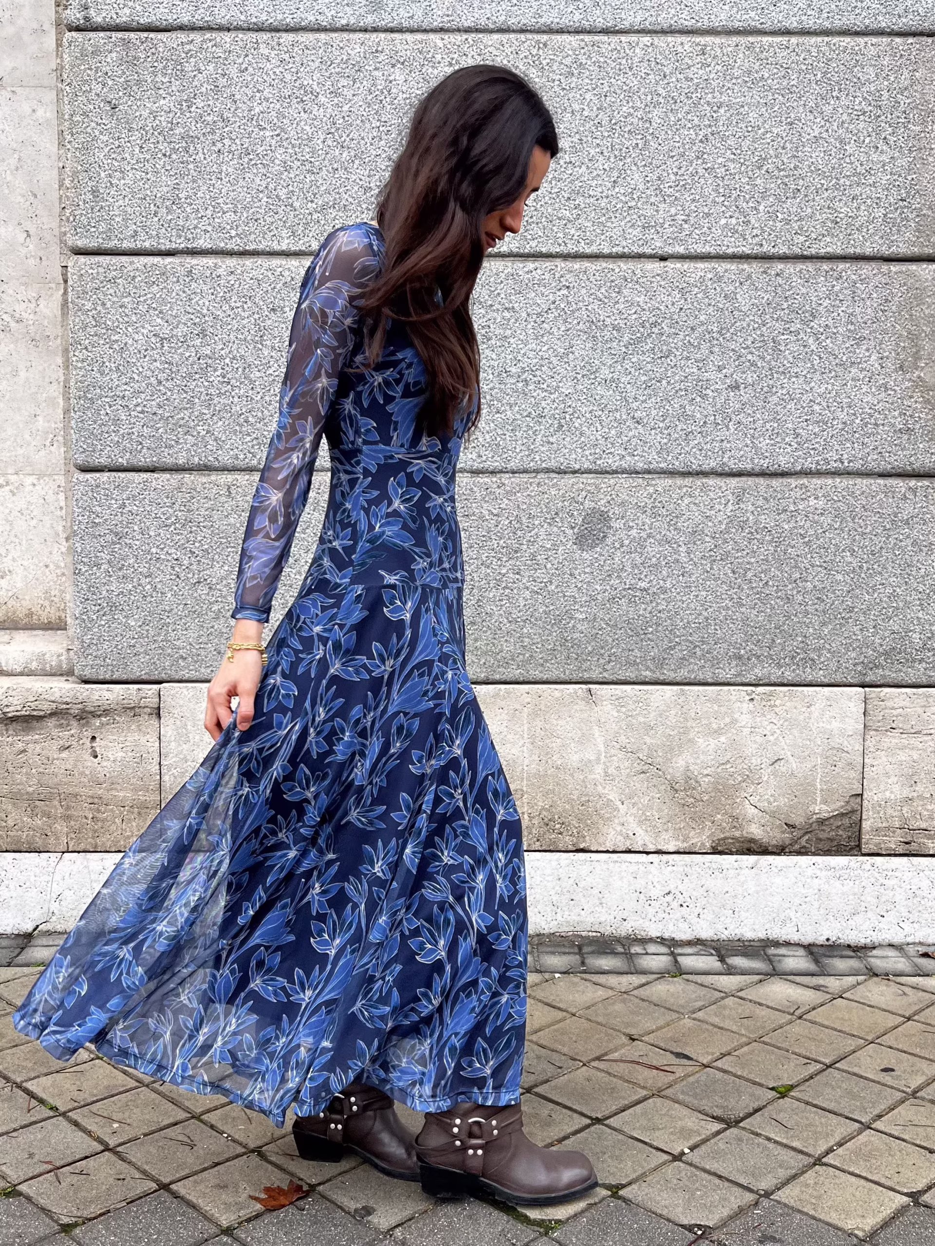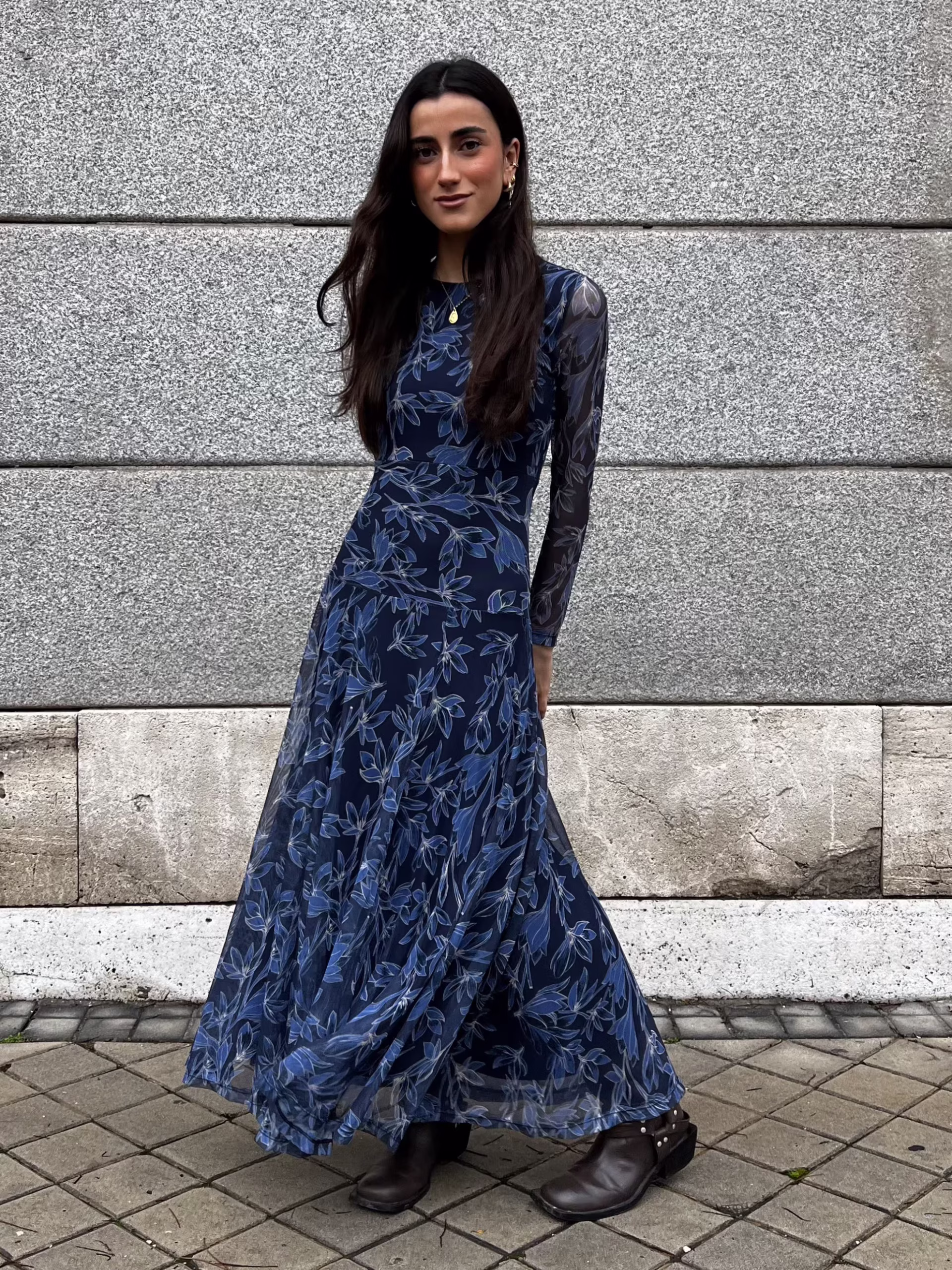 Vestido largo confeccionado en tul semitransparente con estampado floral en tono azul noche.