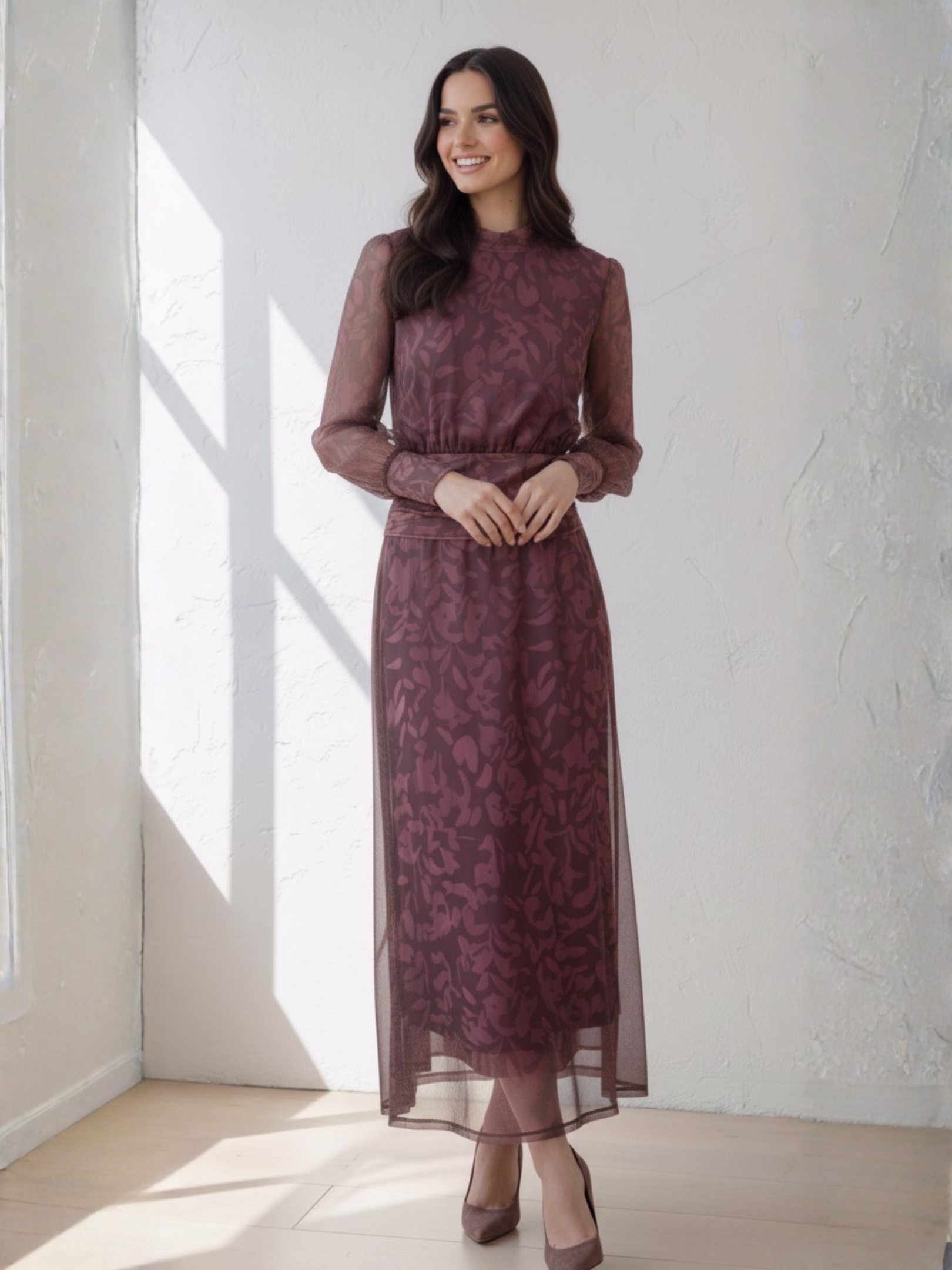 Vestido largo de tul floral semitransparente en tono marrón ciruela, con forro interior. Cuello cerrado, manga larga vaporosa y cintura elástica que se adapta cómodamente. Falda evasé con caída fluida y movimiento ligero.