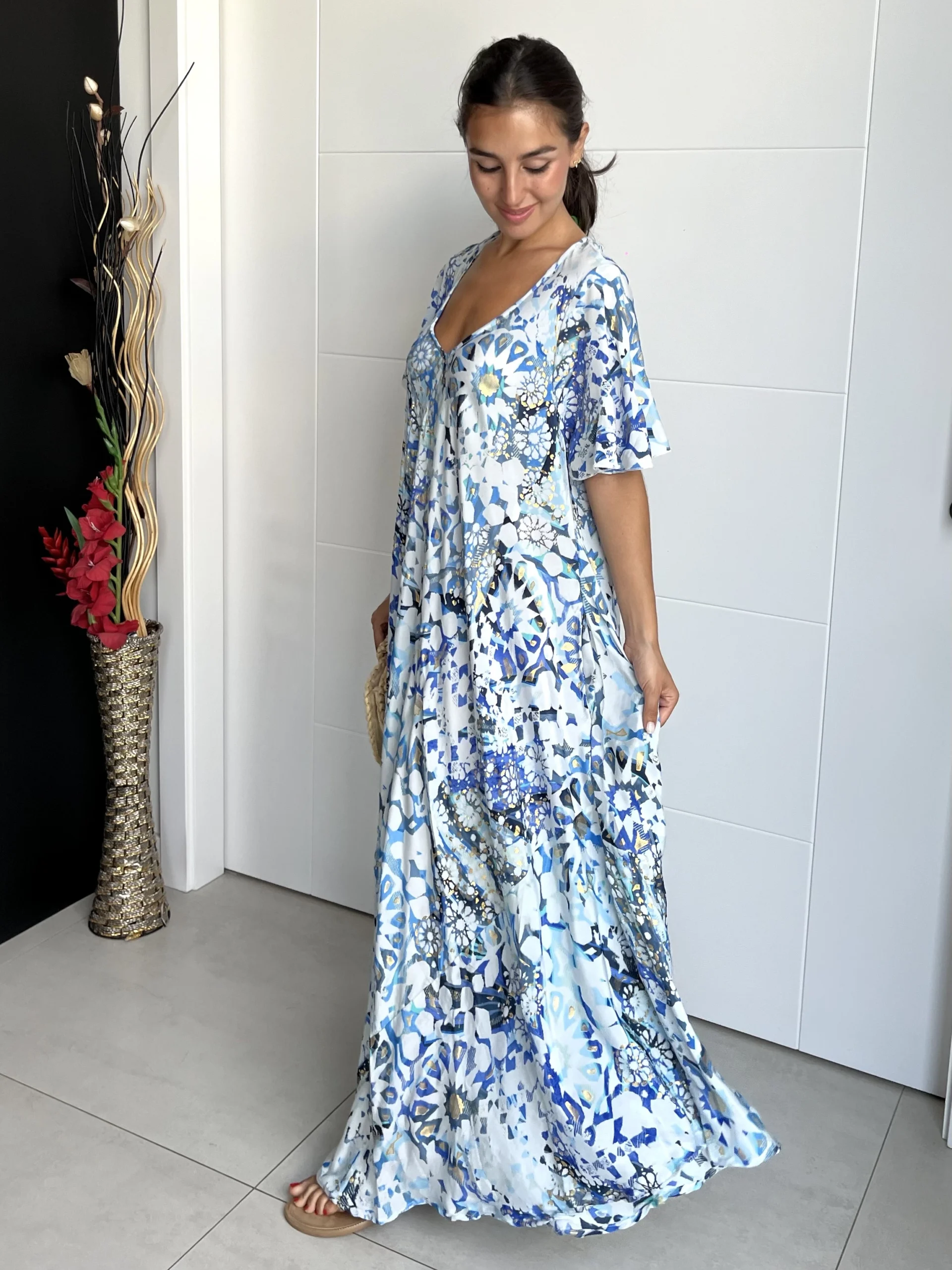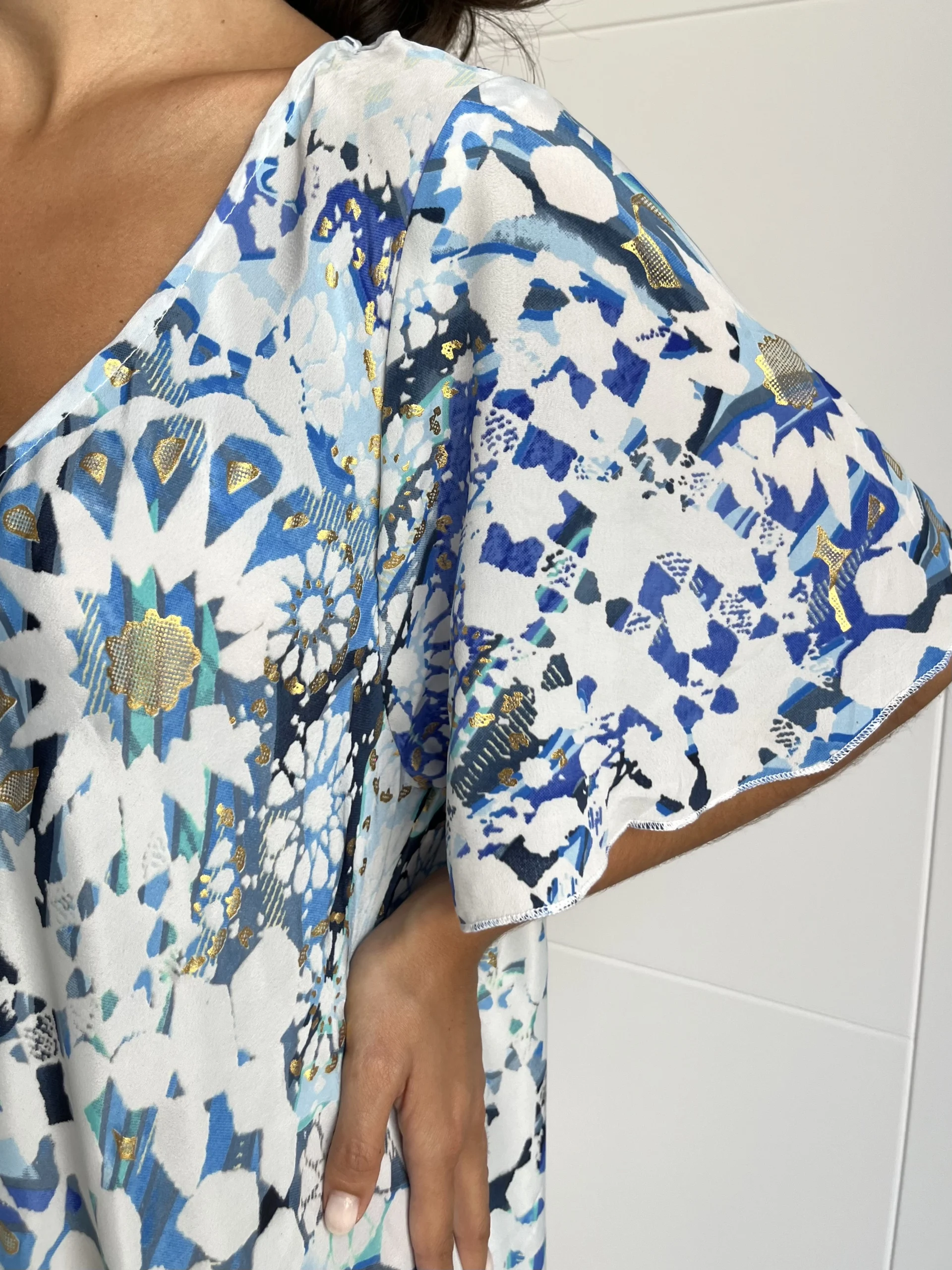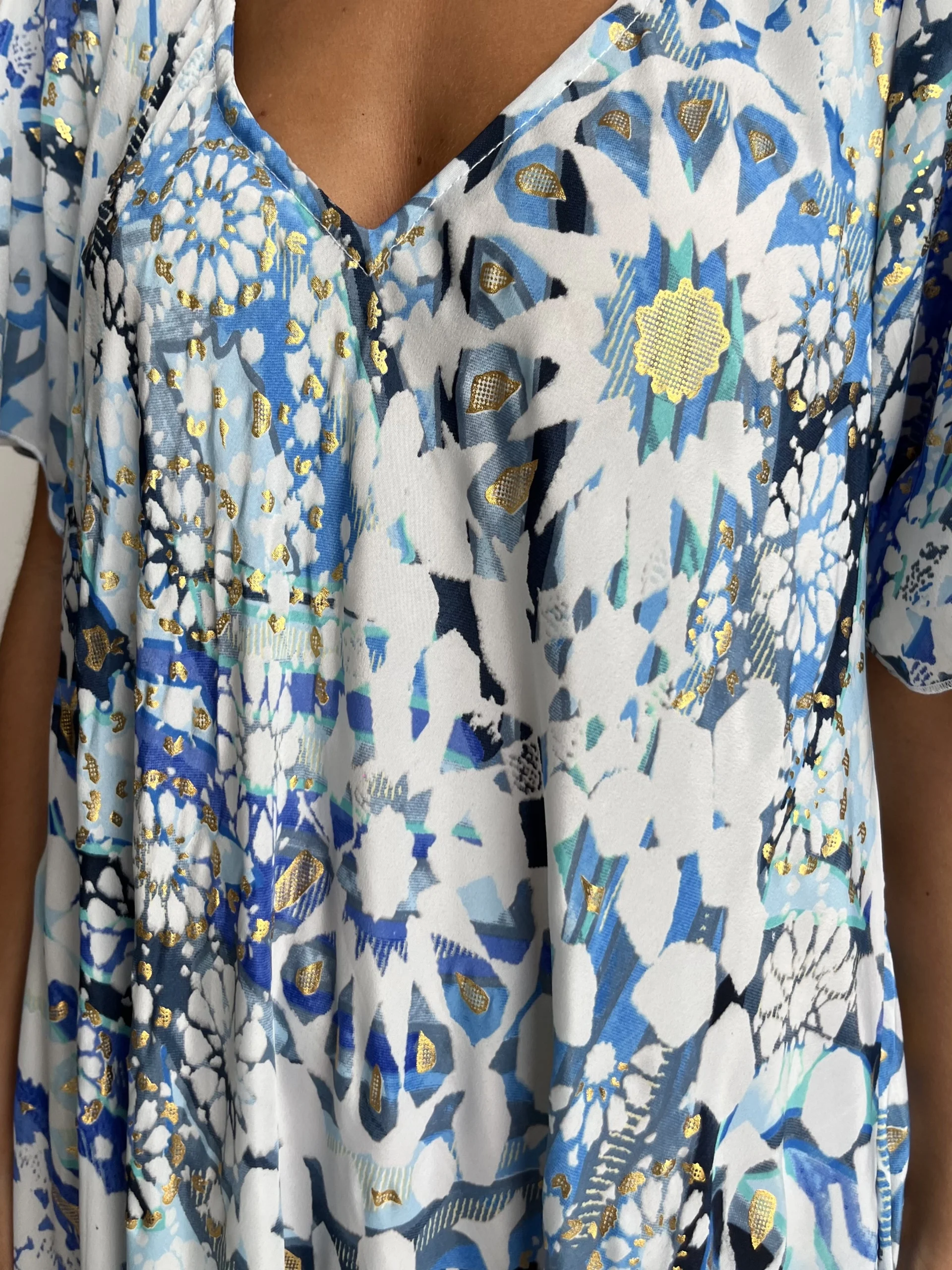 Vestido de playa con estilo India, estampado en colores azul marino, azul claro, blanco y dorado. Bolsillos laterales, sin forro interior. Vestido ancho, ligero y con vuelo.