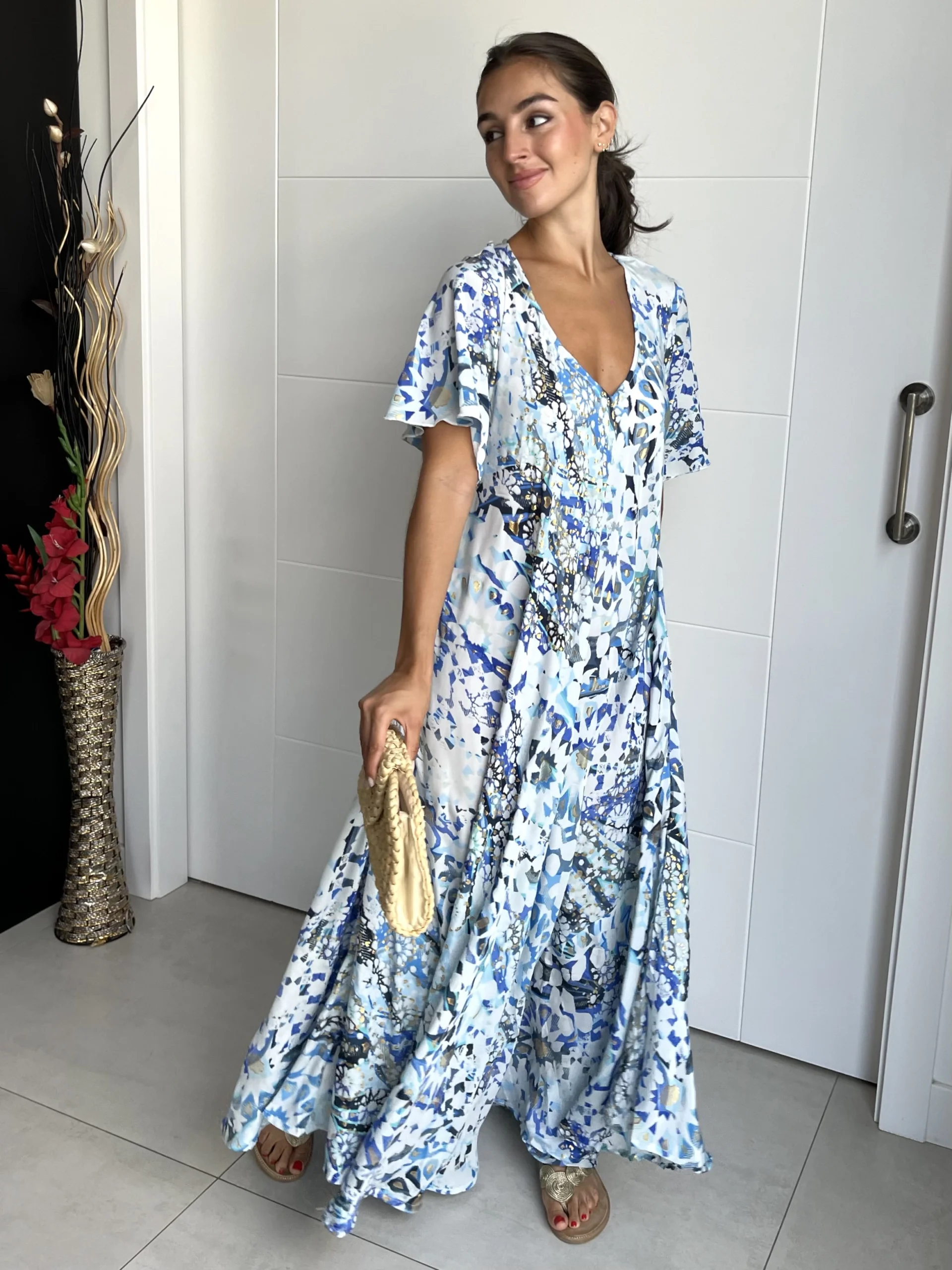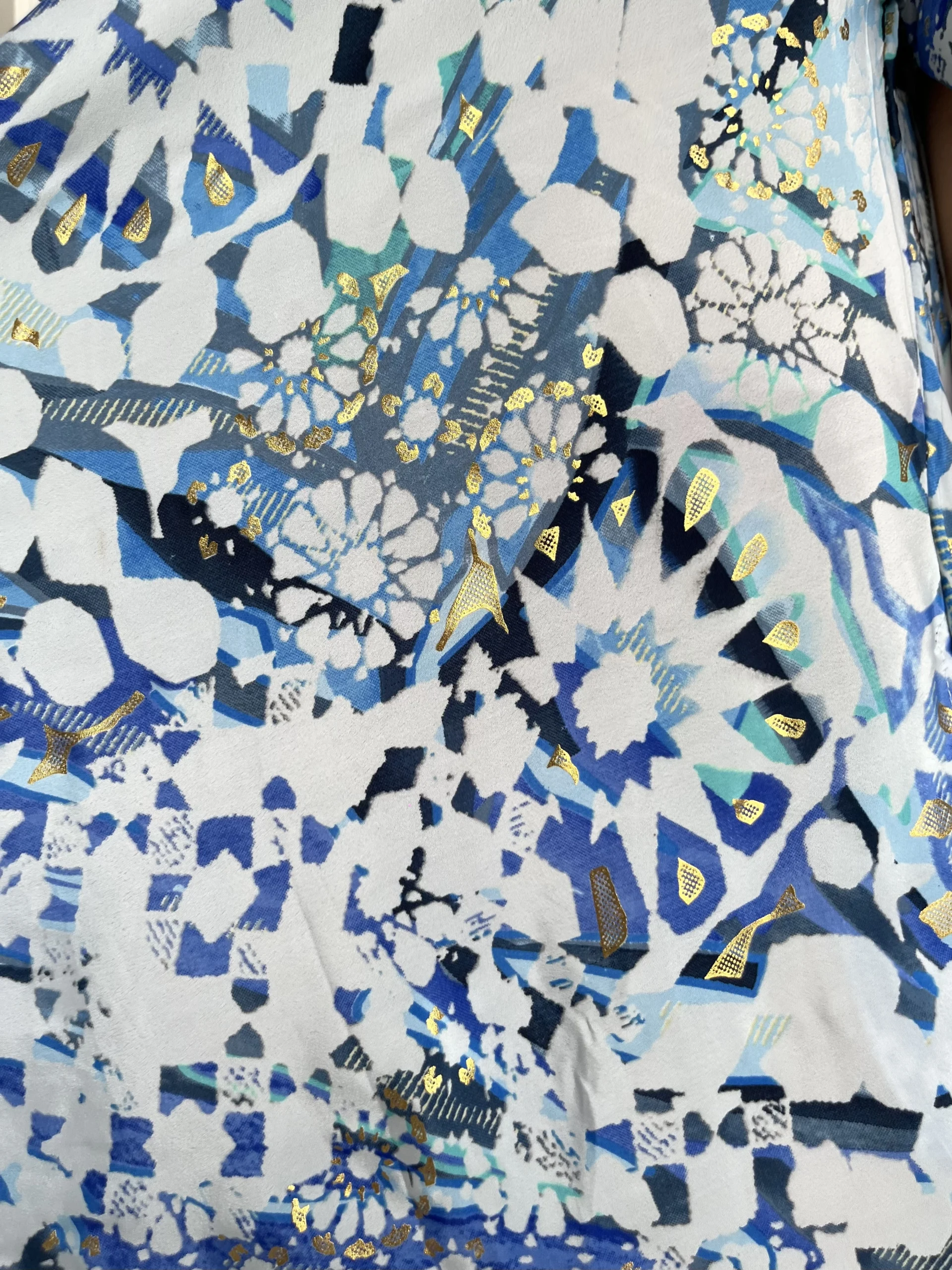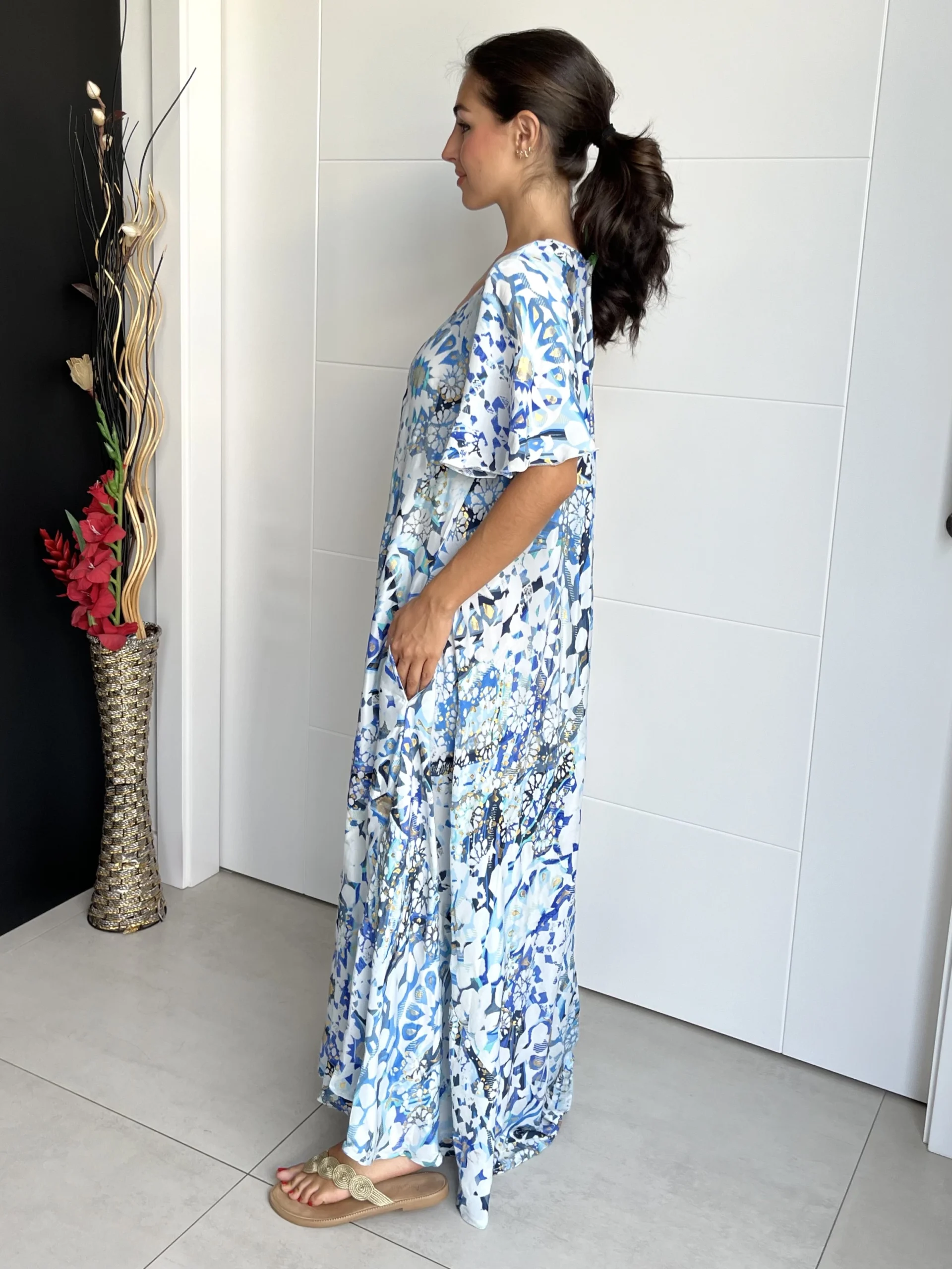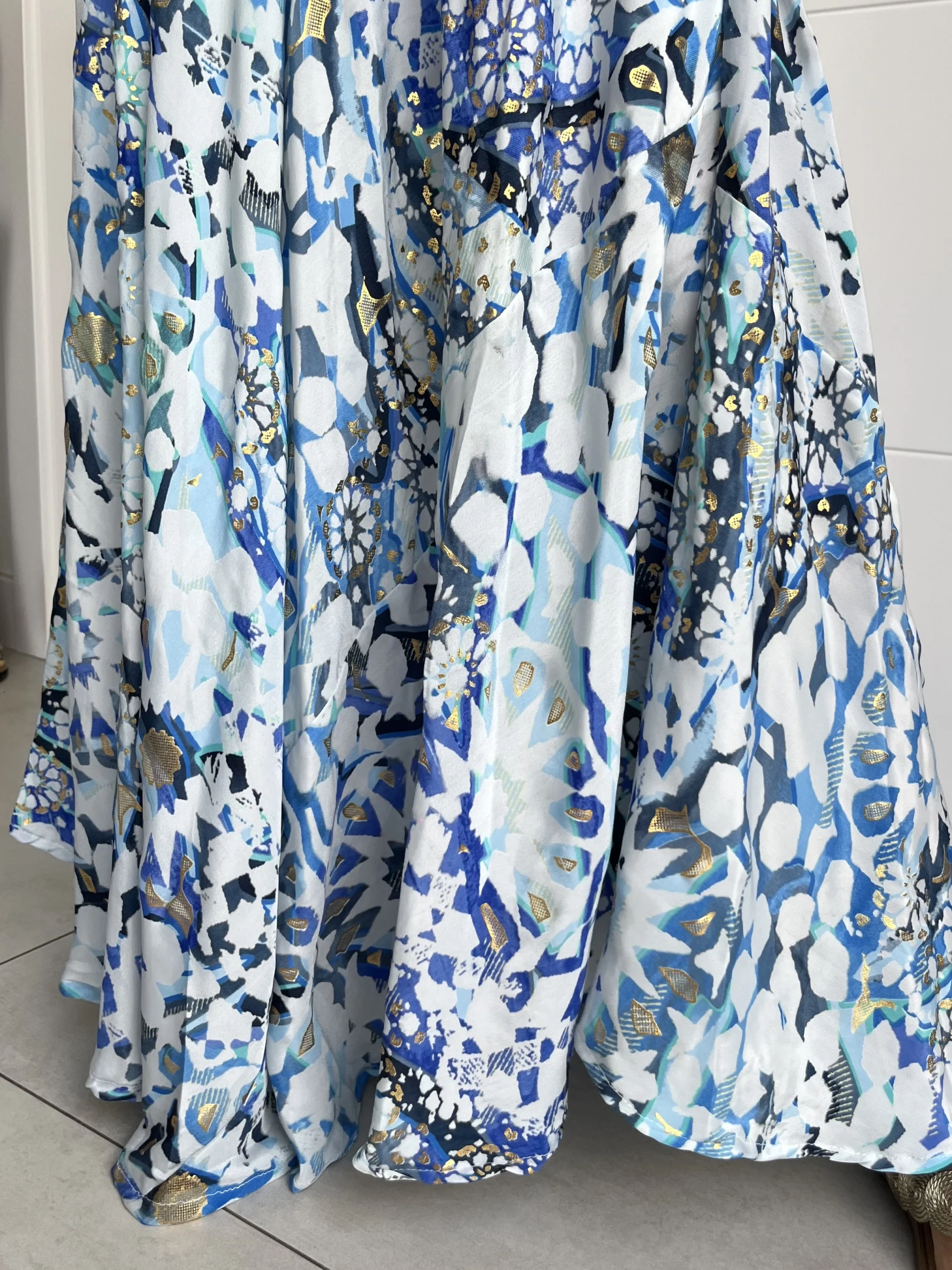 Vestido de playa con estilo India, estampado en colores azul marino, azul claro, blanco y dorado. Bolsillos laterales, sin forro interior. Vestido ancho, ligero y con vuelo.