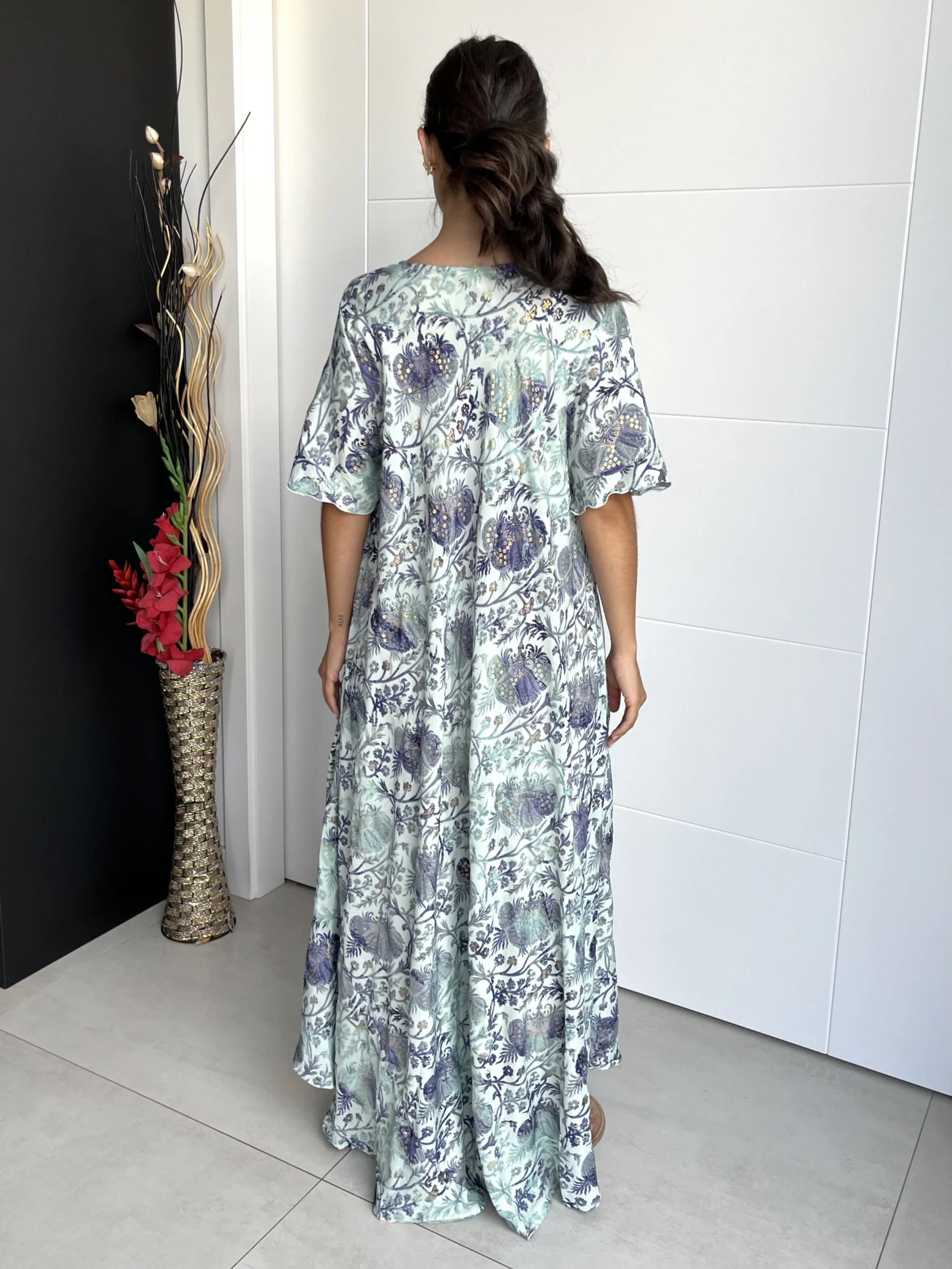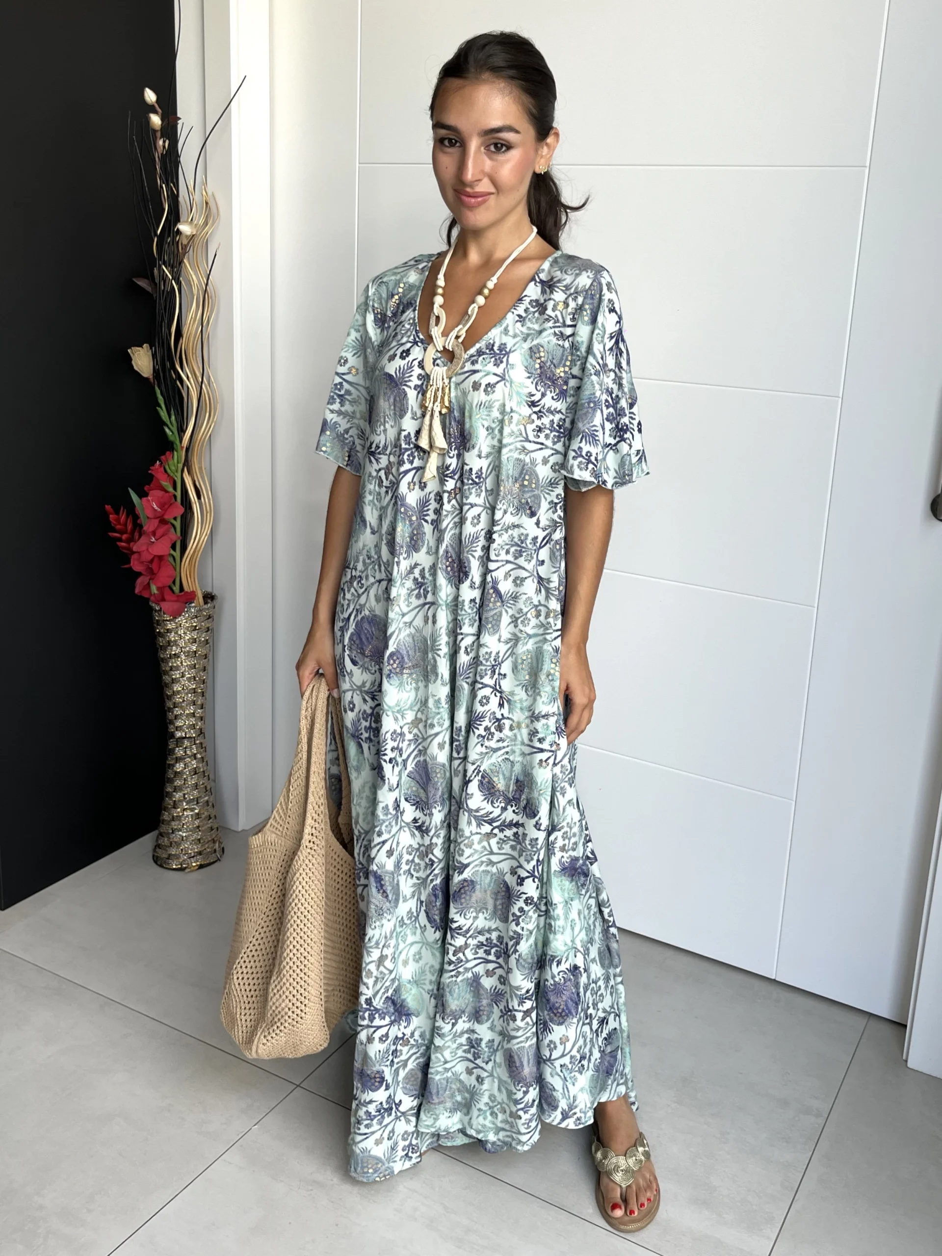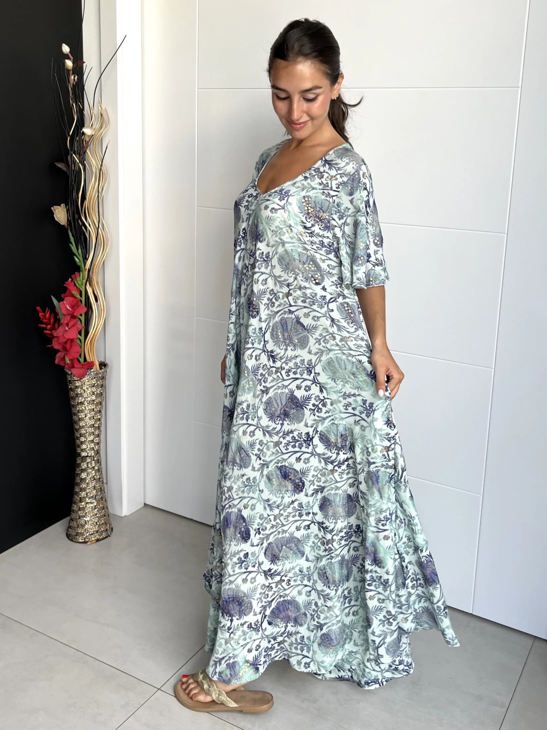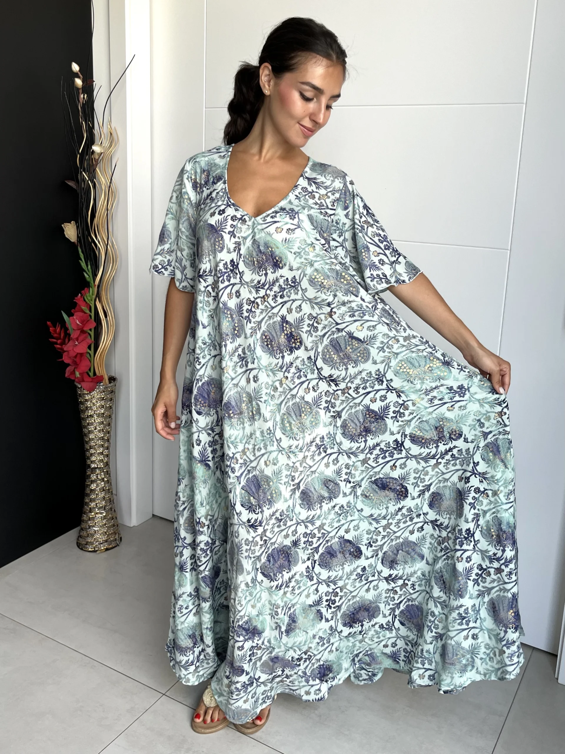 Vestido de playa con estilo India, estampado en colores verde agua, azul marino, y dorado. Bolsillos laterales, sin forro interior. Vestido ancho, ligero y con vuelo.