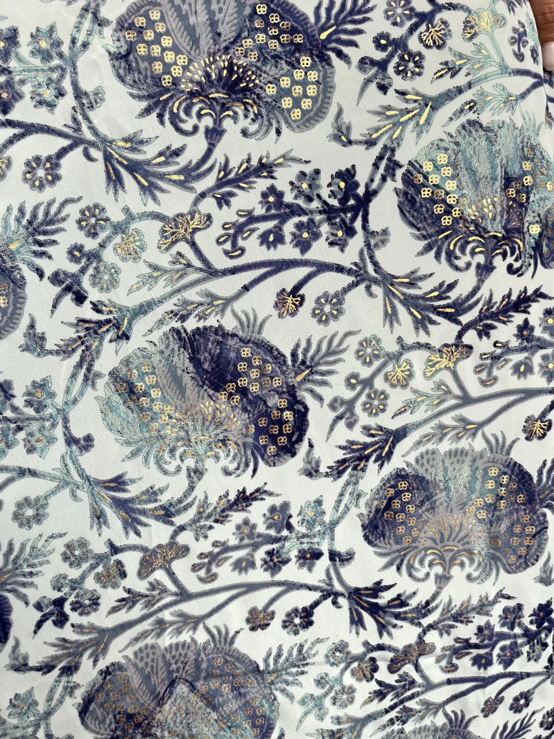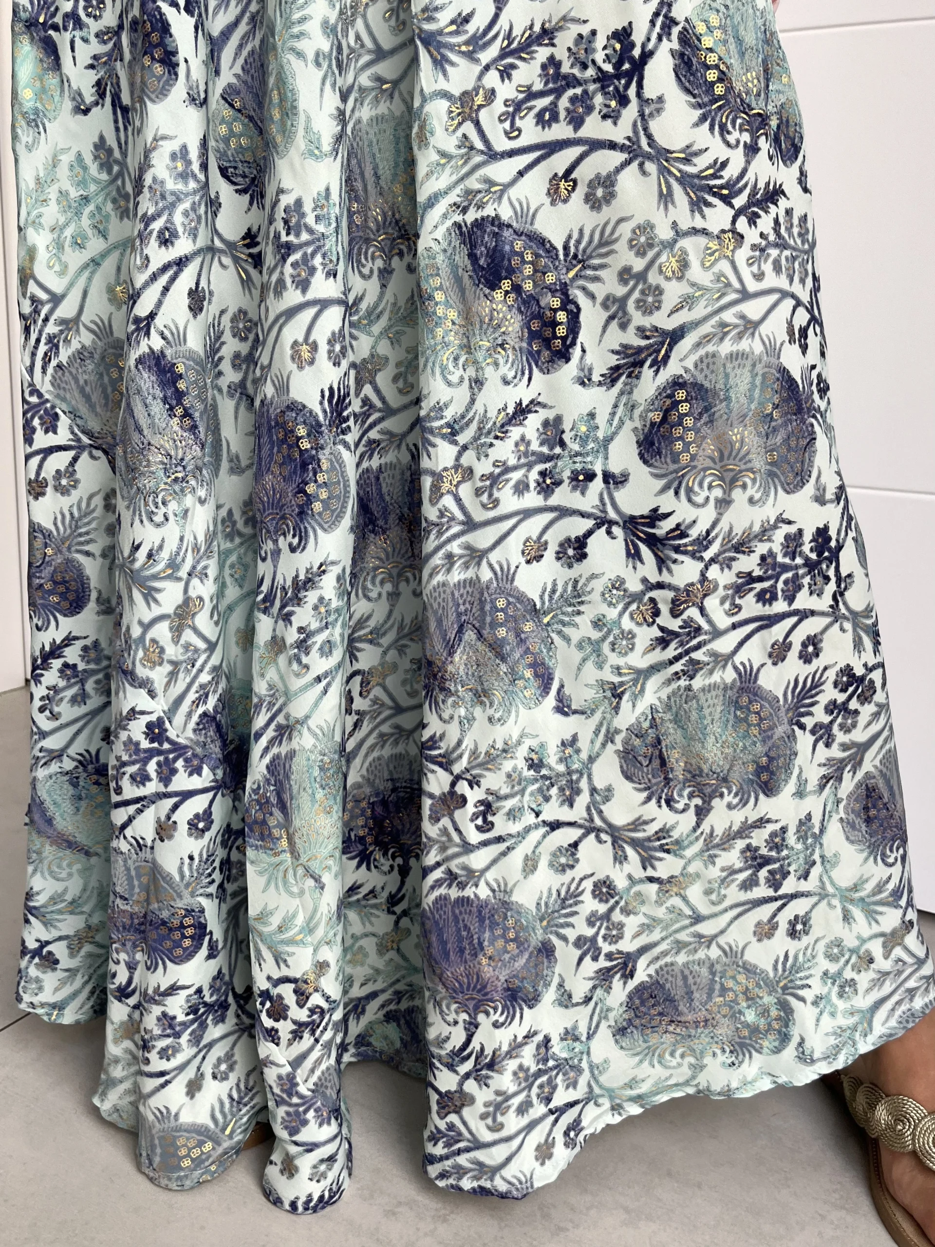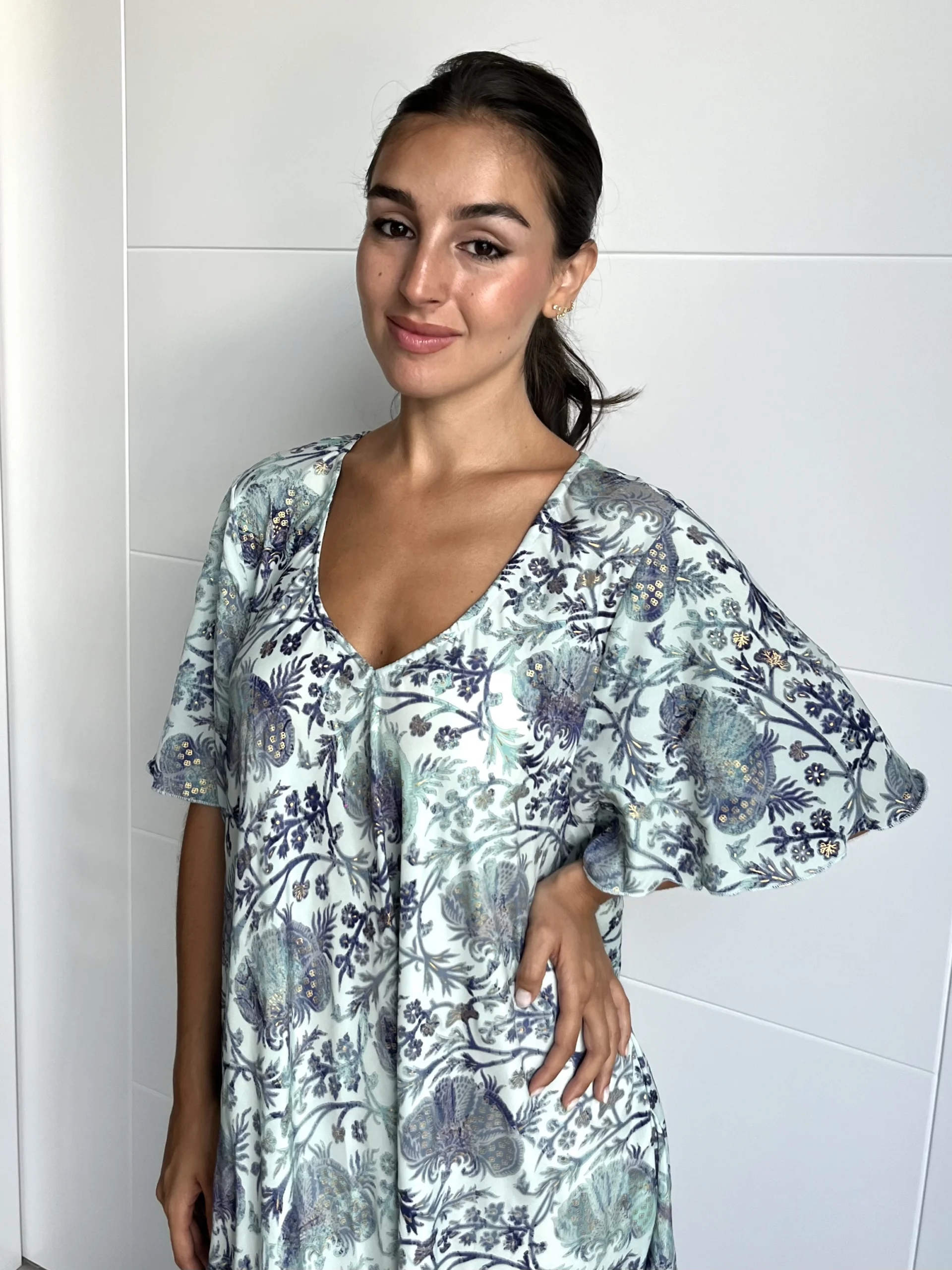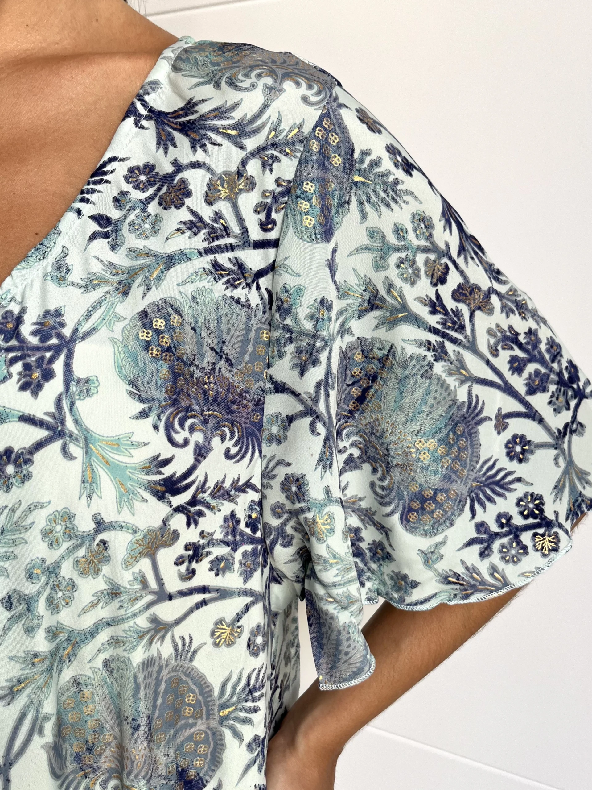 Vestido de playa con estilo India, estampado en colores verde agua, azul marino, y dorado. Bolsillos laterales, sin forro interior. Vestido ancho, ligero y con vuelo.