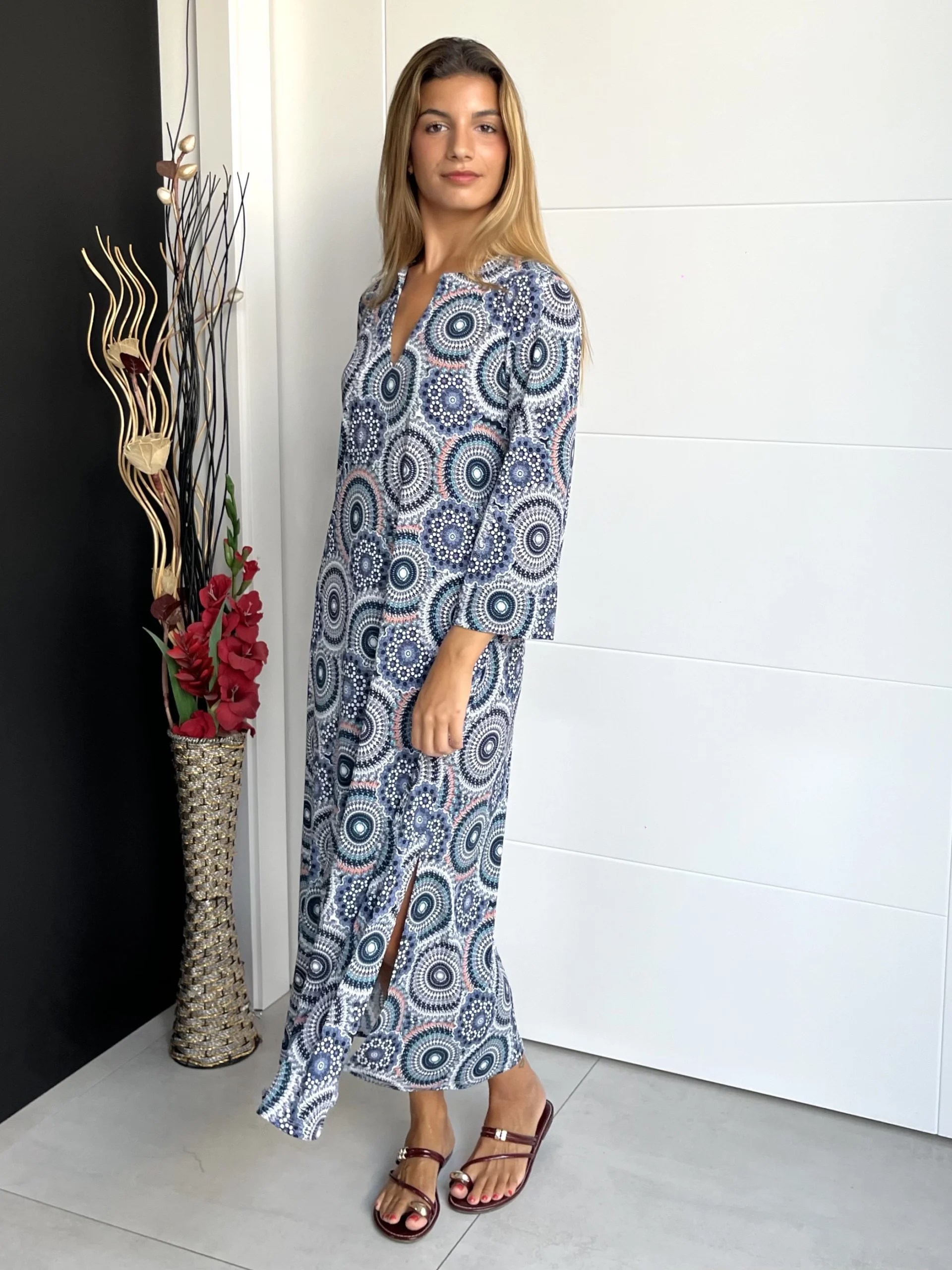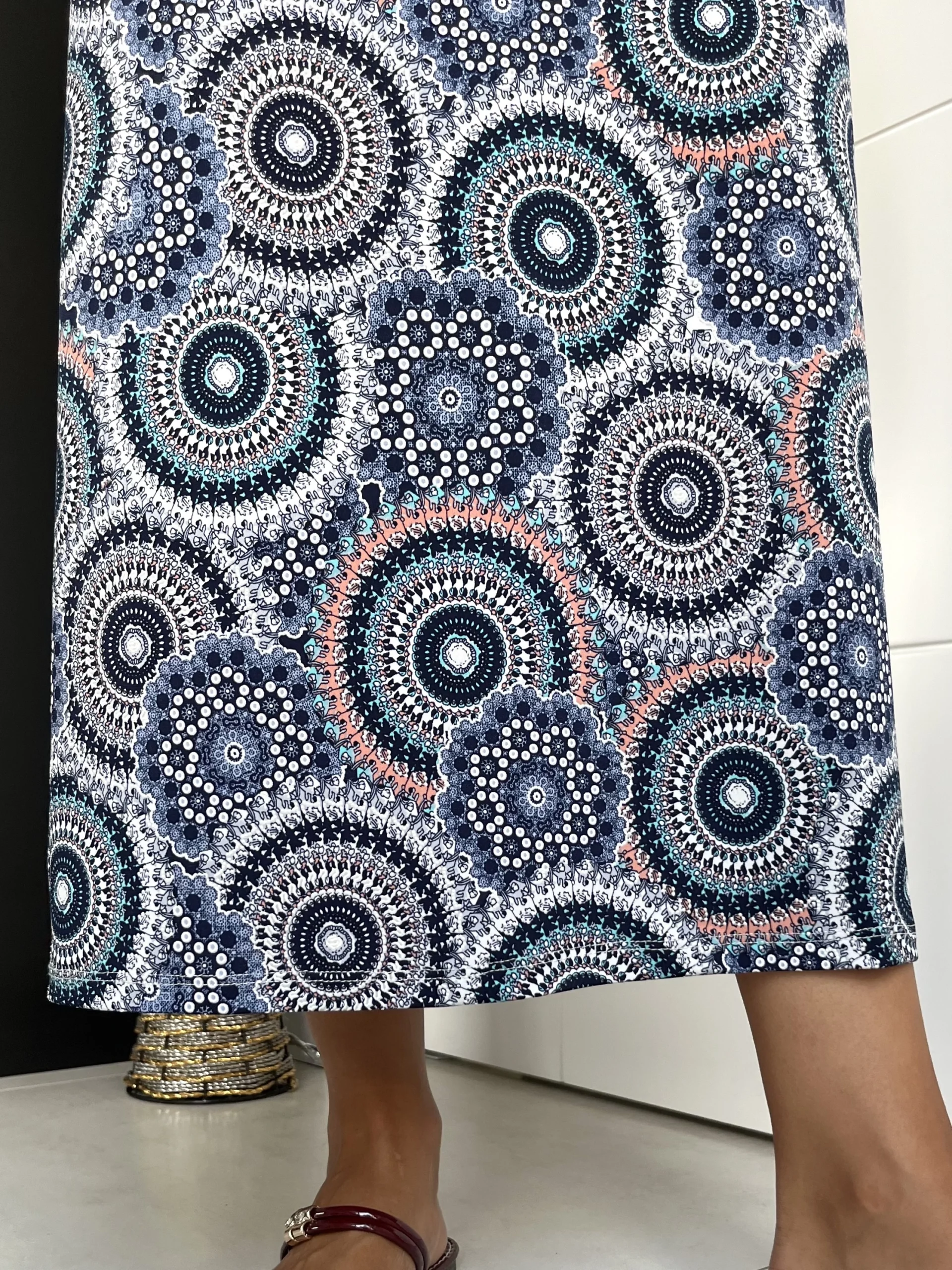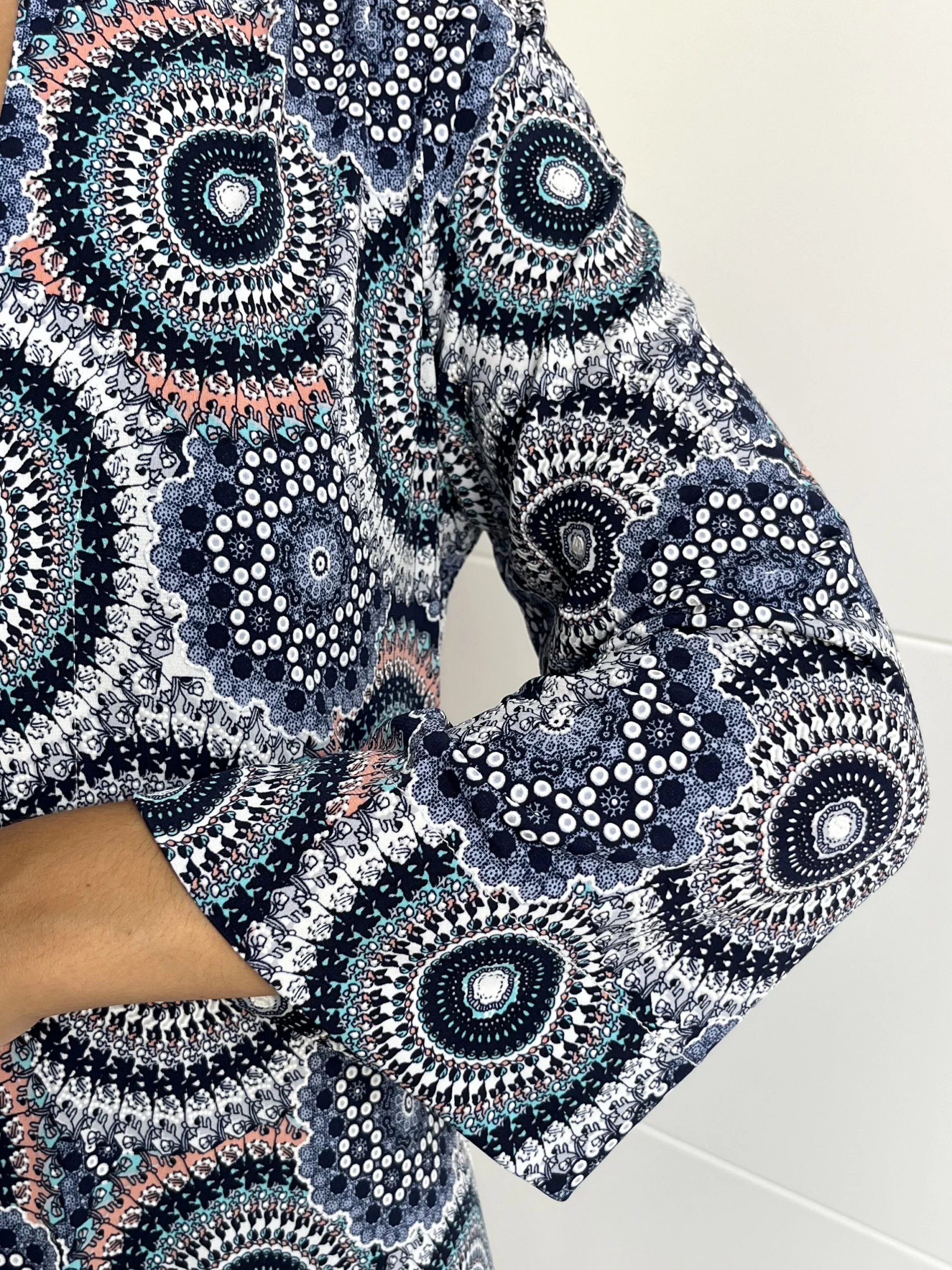 Vestido midi elástico con manga 3/4 y cuello mao. Estampado en colores azul marino, negro, blanco y salmón. Aberturas en los laterales y prenda con movimiento.