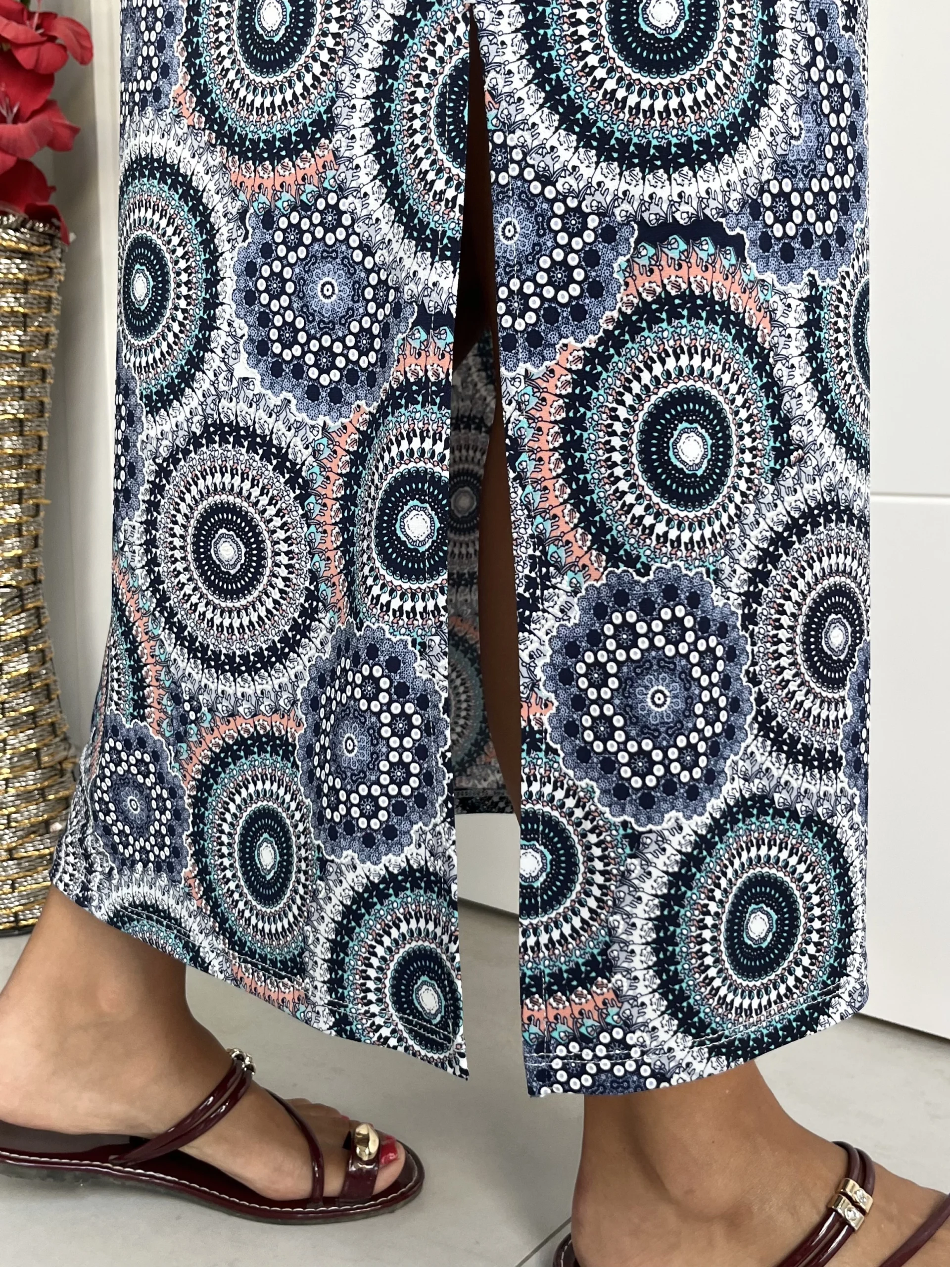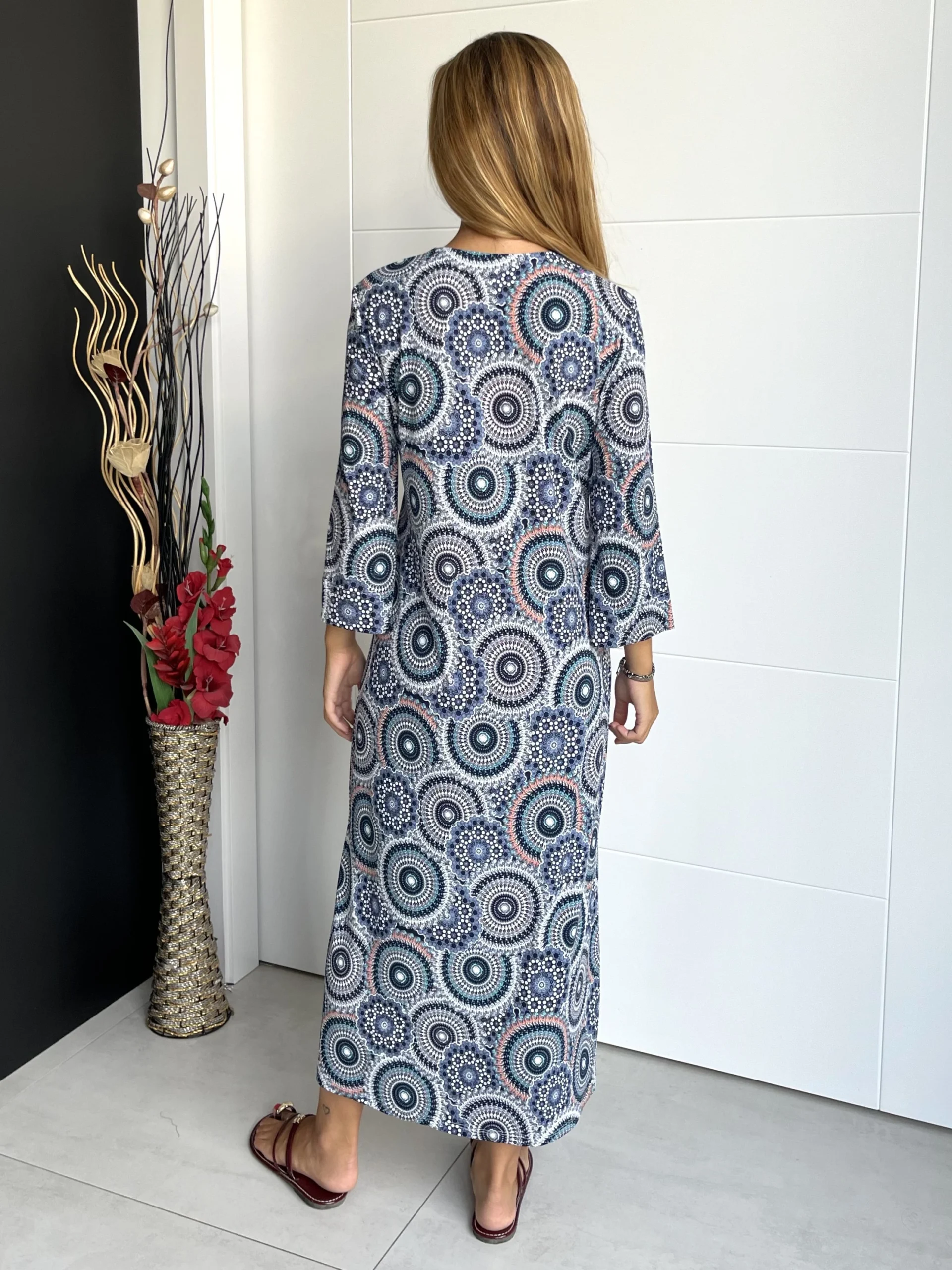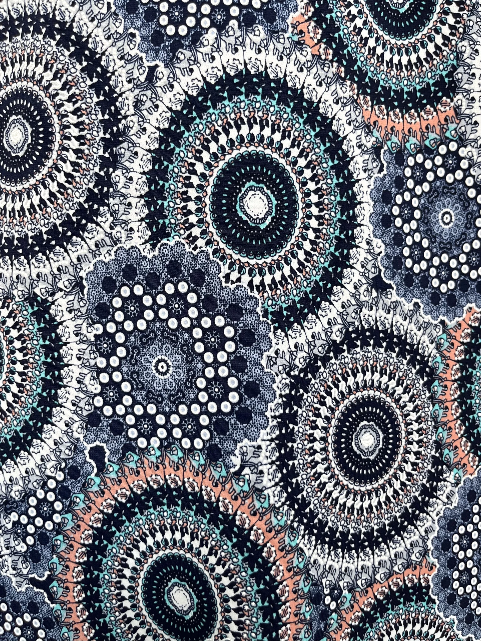 Vestido midi elástico con manga 3/4 y cuello mao. Estampado en colores azul marino, negro, blanco y salmón. Aberturas en los laterales y prenda con movimiento.