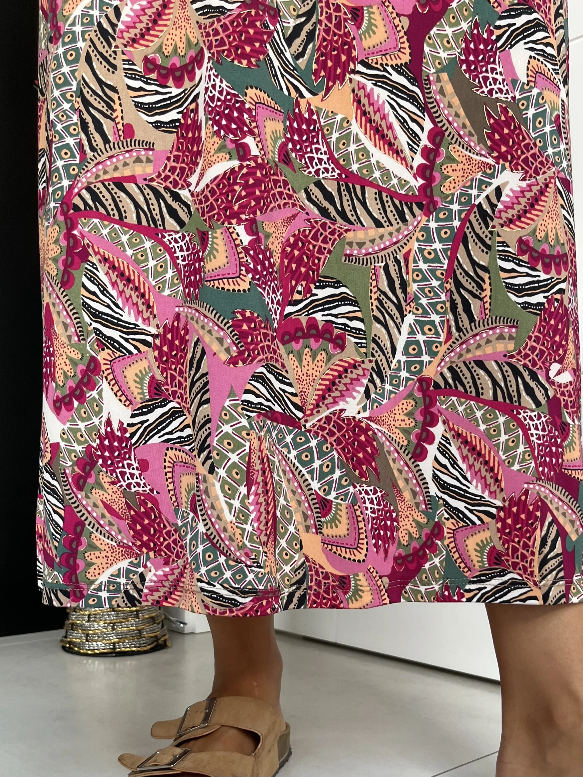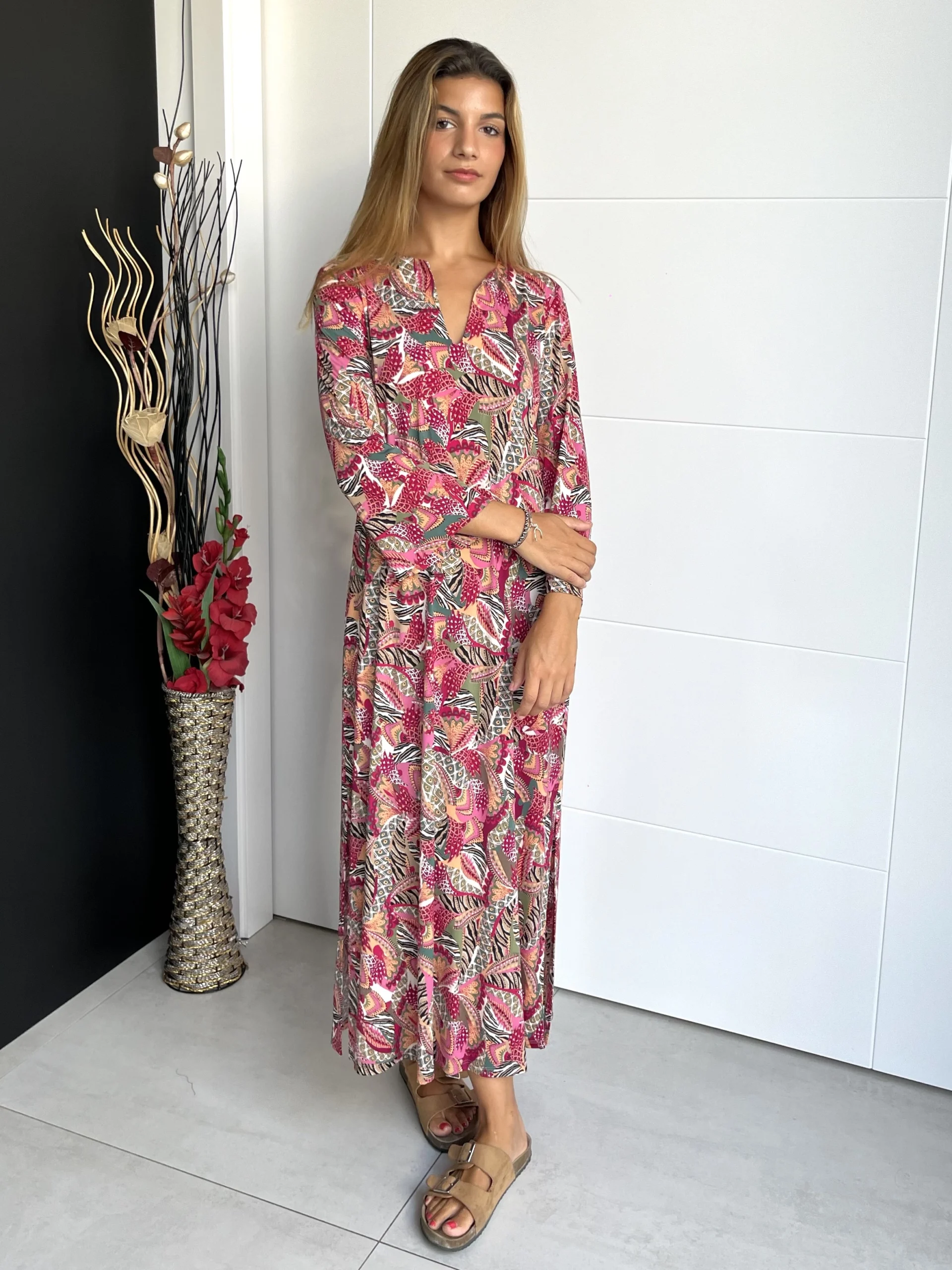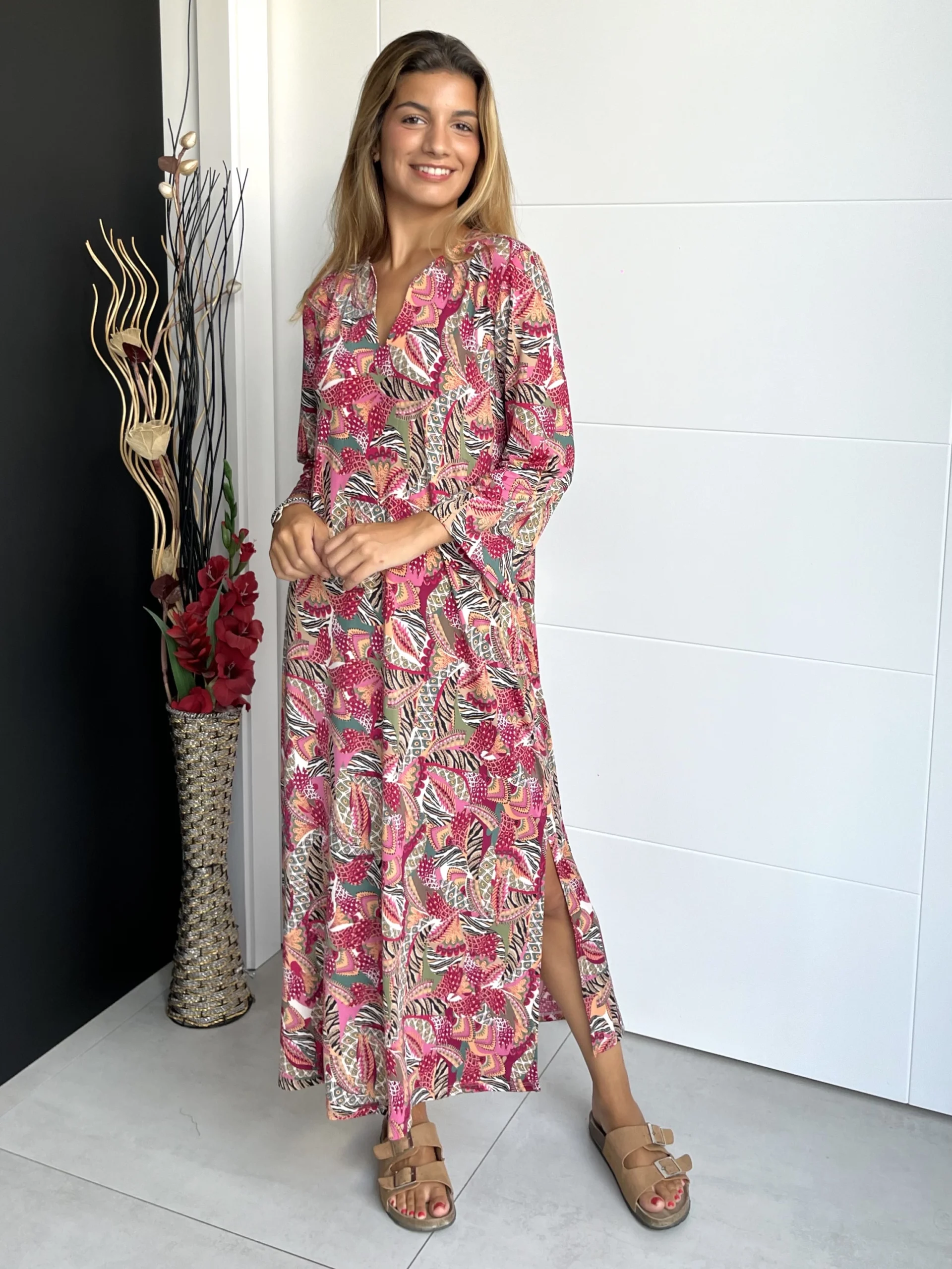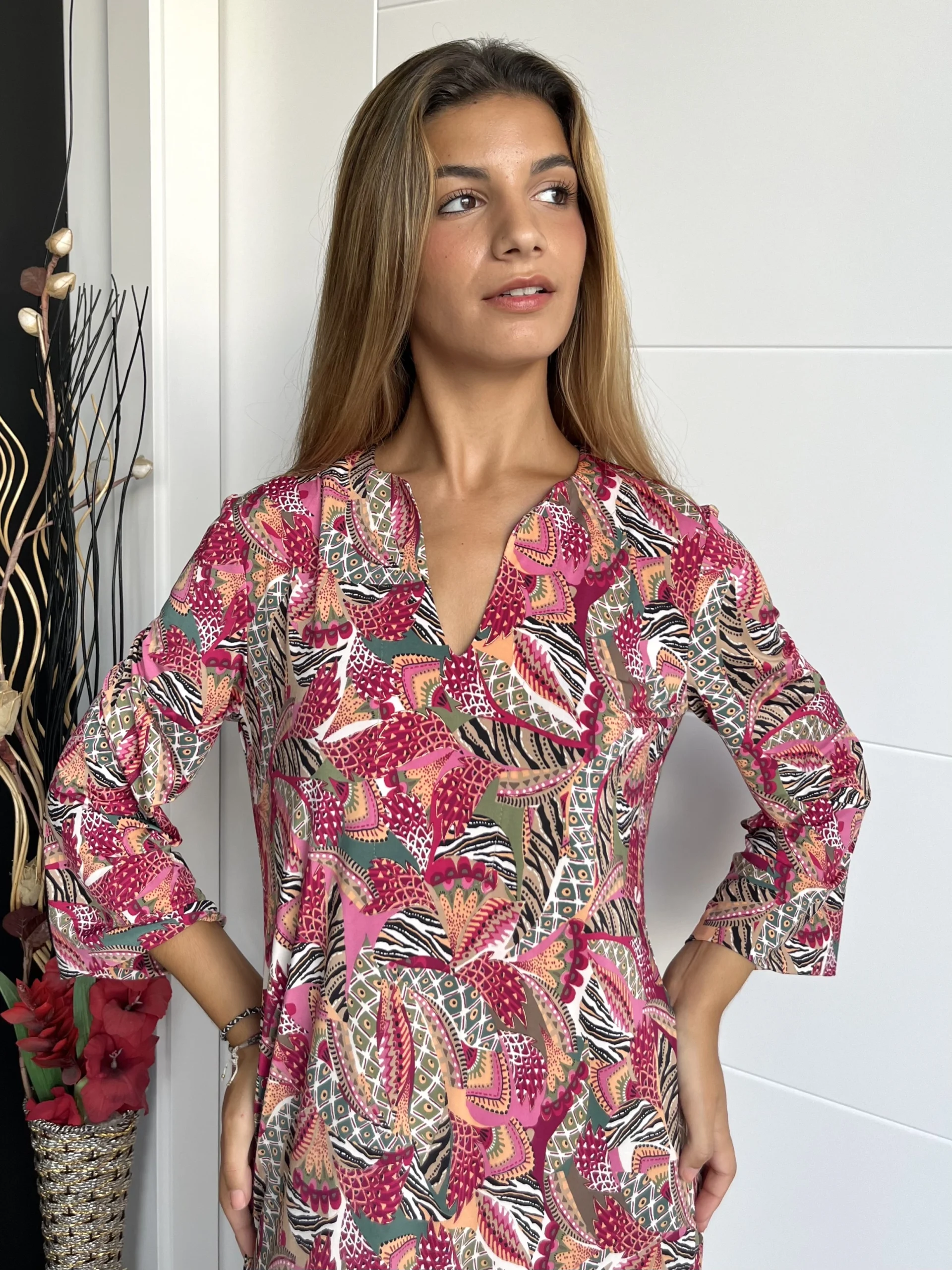 Vestido midi elástico con manga 3/4 y cuello mao. Estampado en colores fucsia, verde, camel, marrón y blanco. Hilo dorado por la prenda. Aberturas en los laterales y prenda con movimiento.