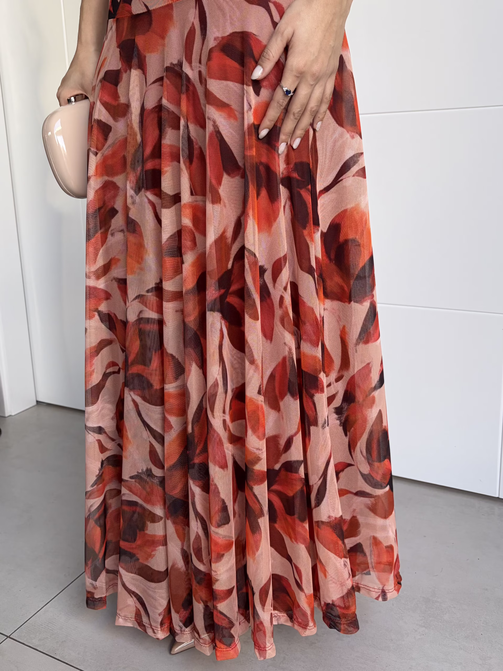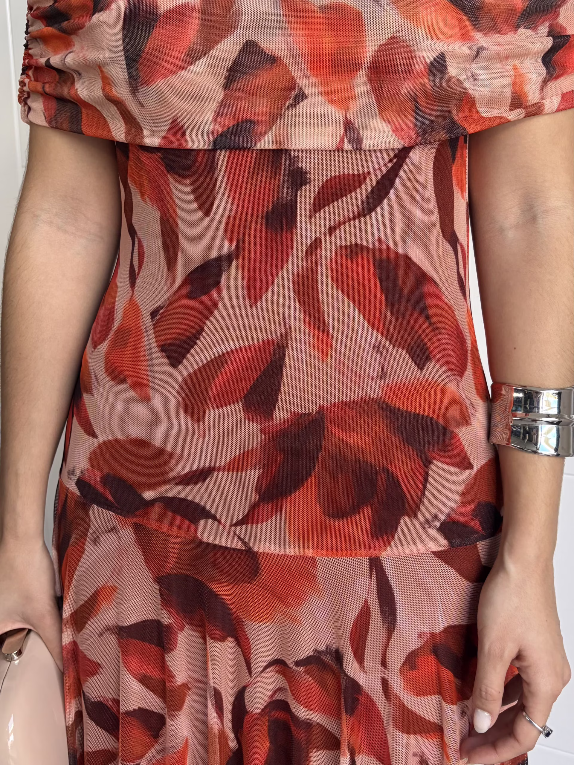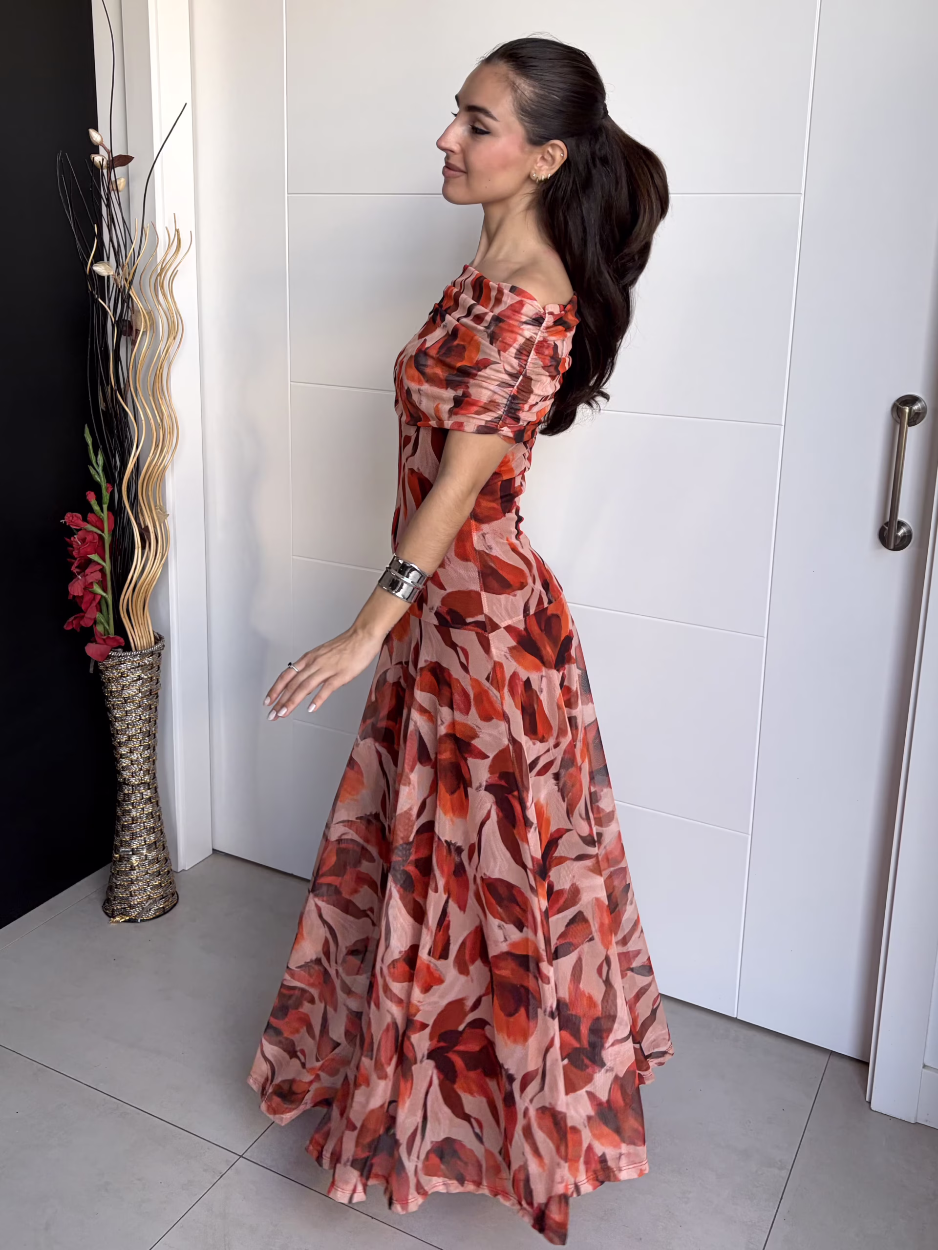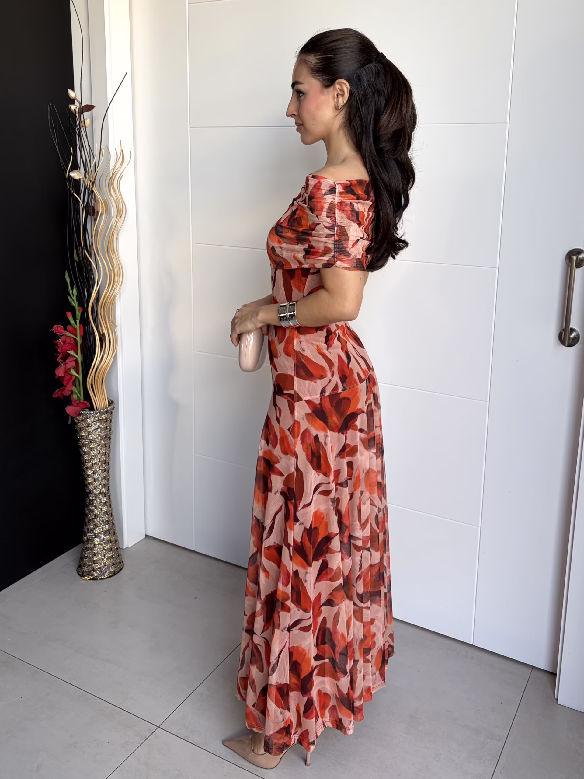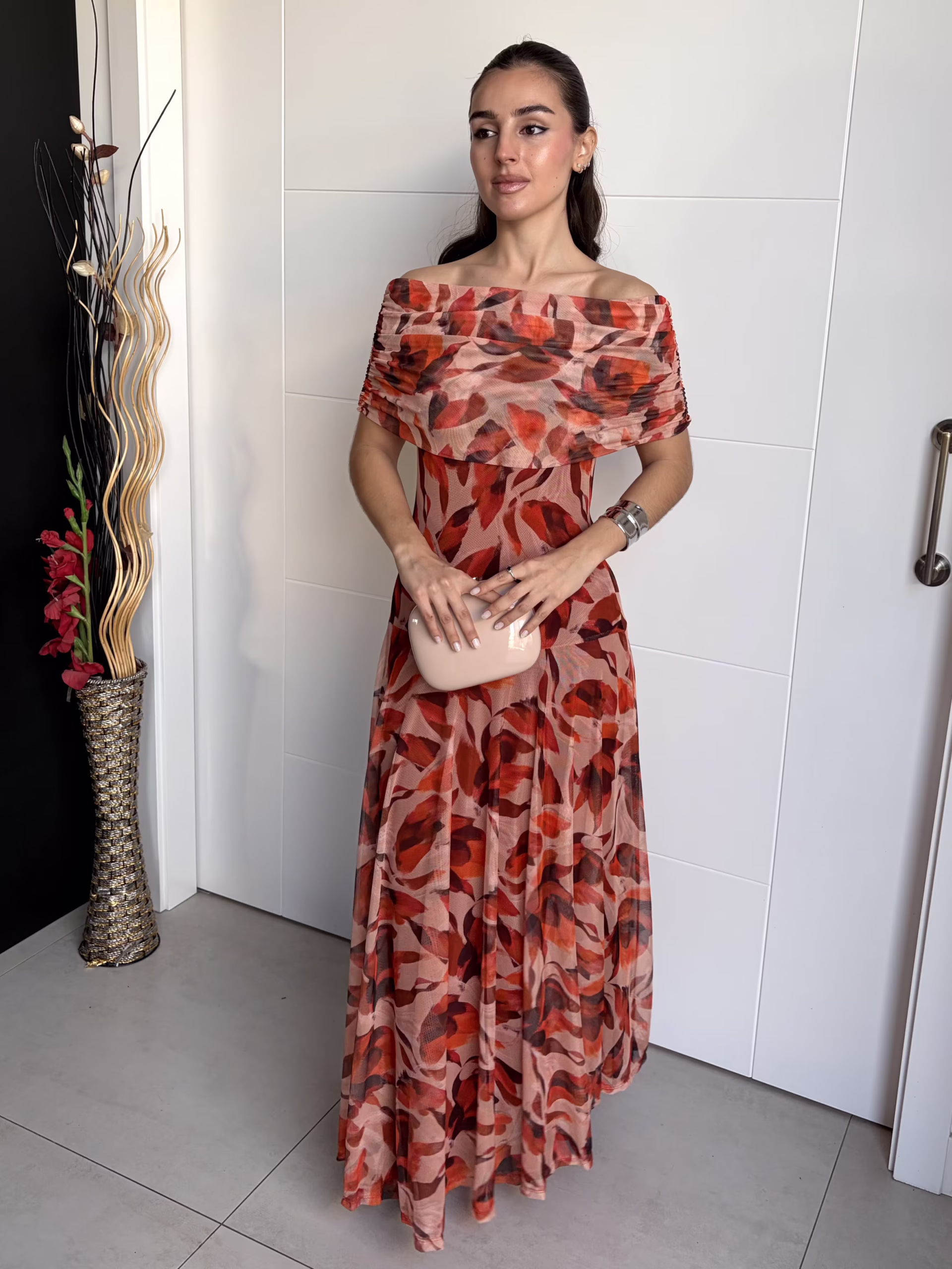 Vestido largo de tul en tonos naranjas y teja con estampado floral. Escote bardot con banda elástica fruncida que permite llevarlo hombros descubiertos. Cuerpo ligeramente entallado y falda amplia con gran vuelo. Forro interior en color teja.