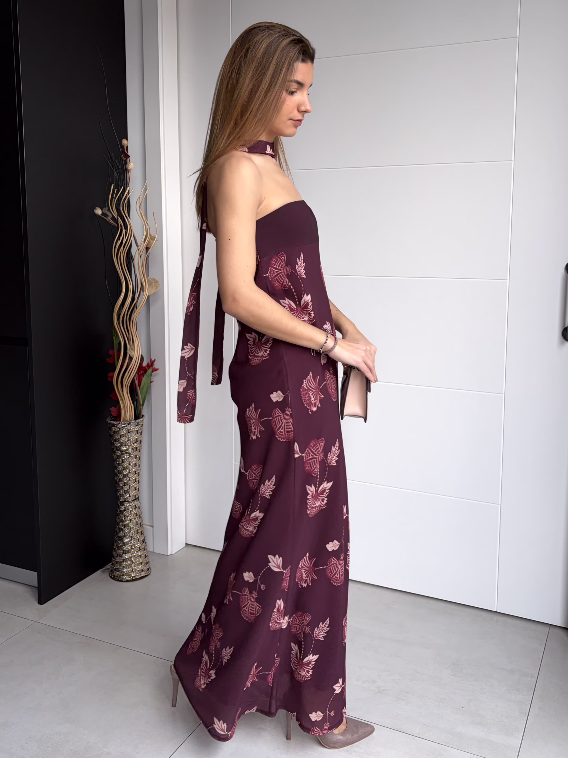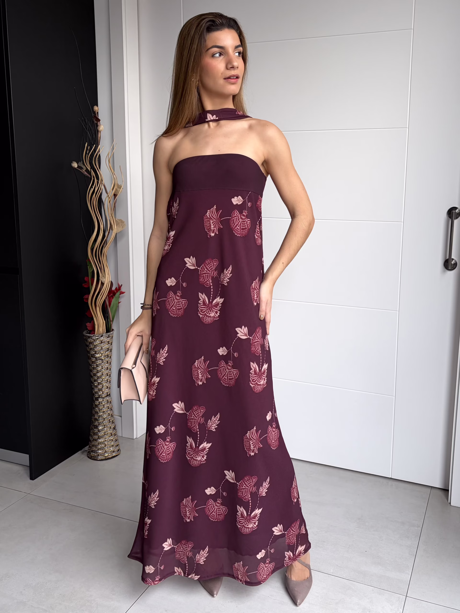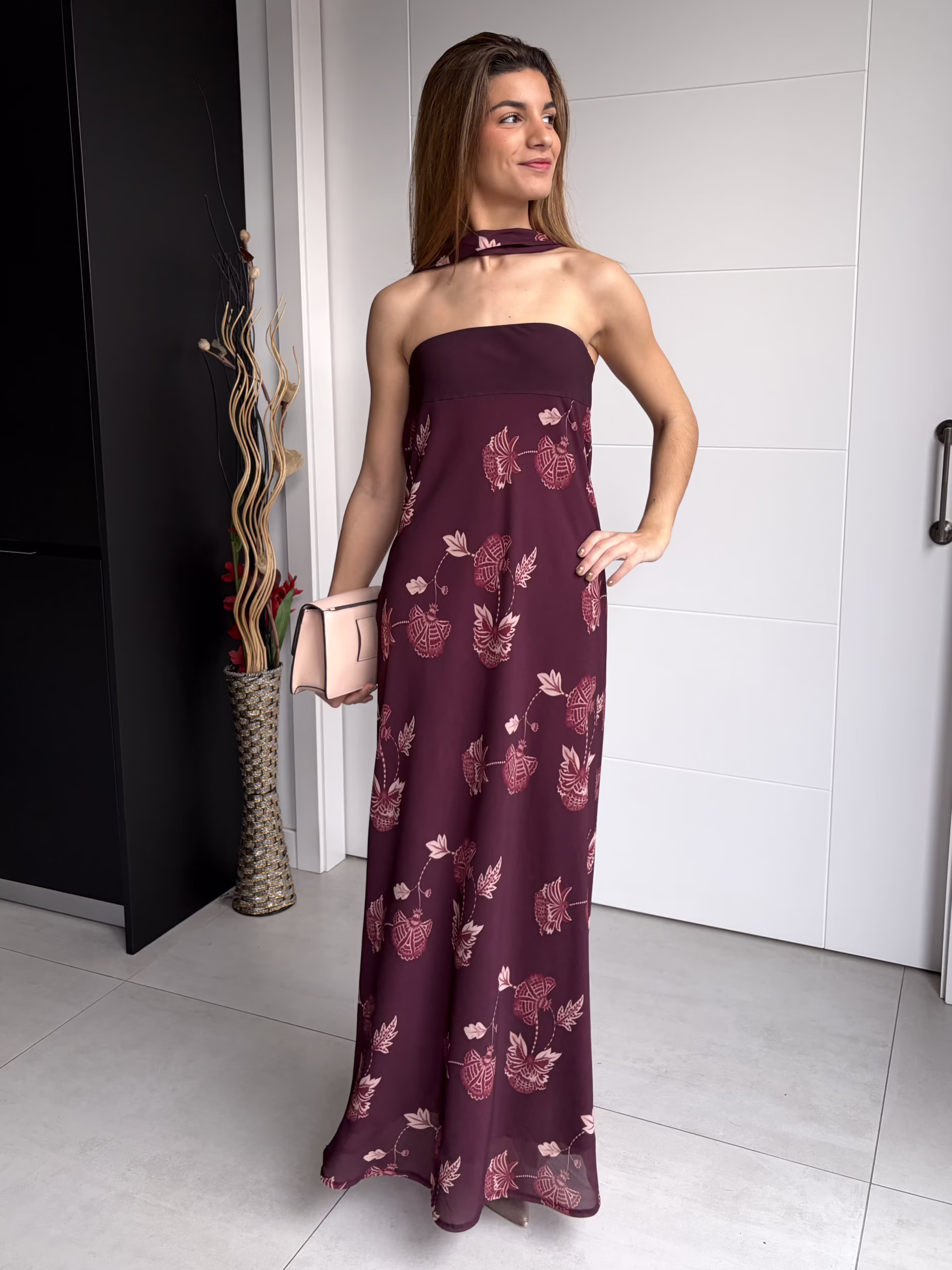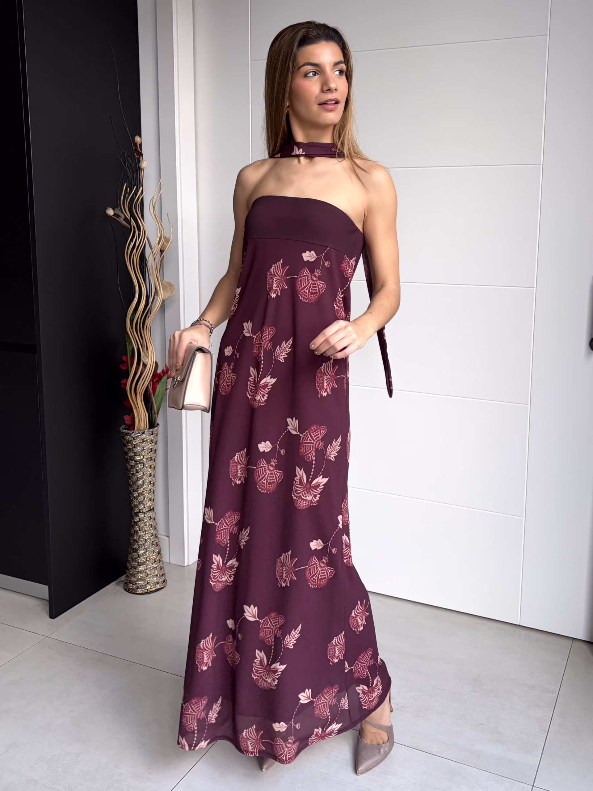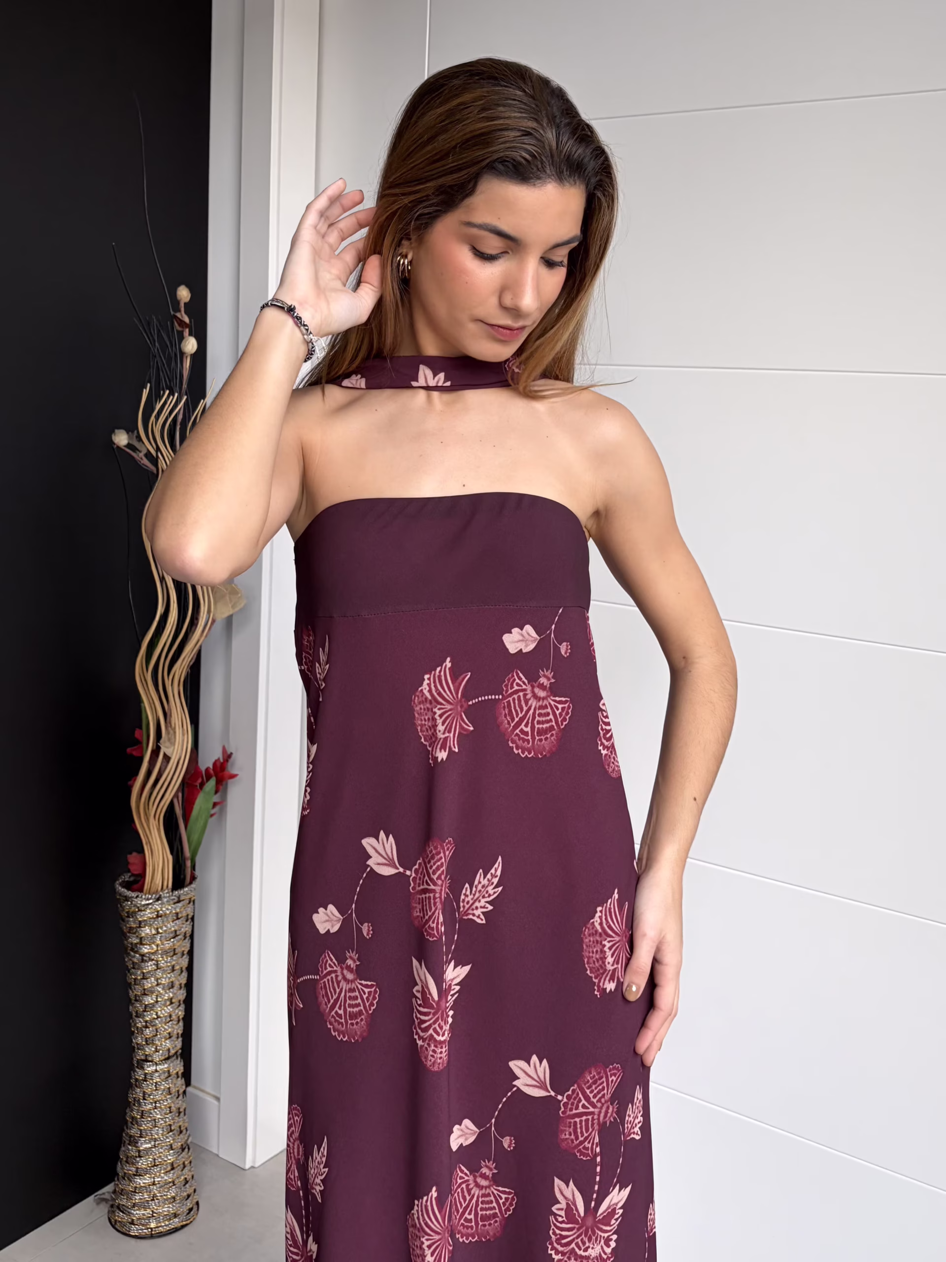 Vestido palabra de honor en tono burdeos con estampado floral integrado. Presenta banda lisa en el pecho que aporta sujeción y define el escote. Incluye lazada independiente para anudar al cuello, que permite variar el estilo del vestido. Forro interior en tono granate. Diseño de caída evasé, con silueta suelta y movimiento natural.