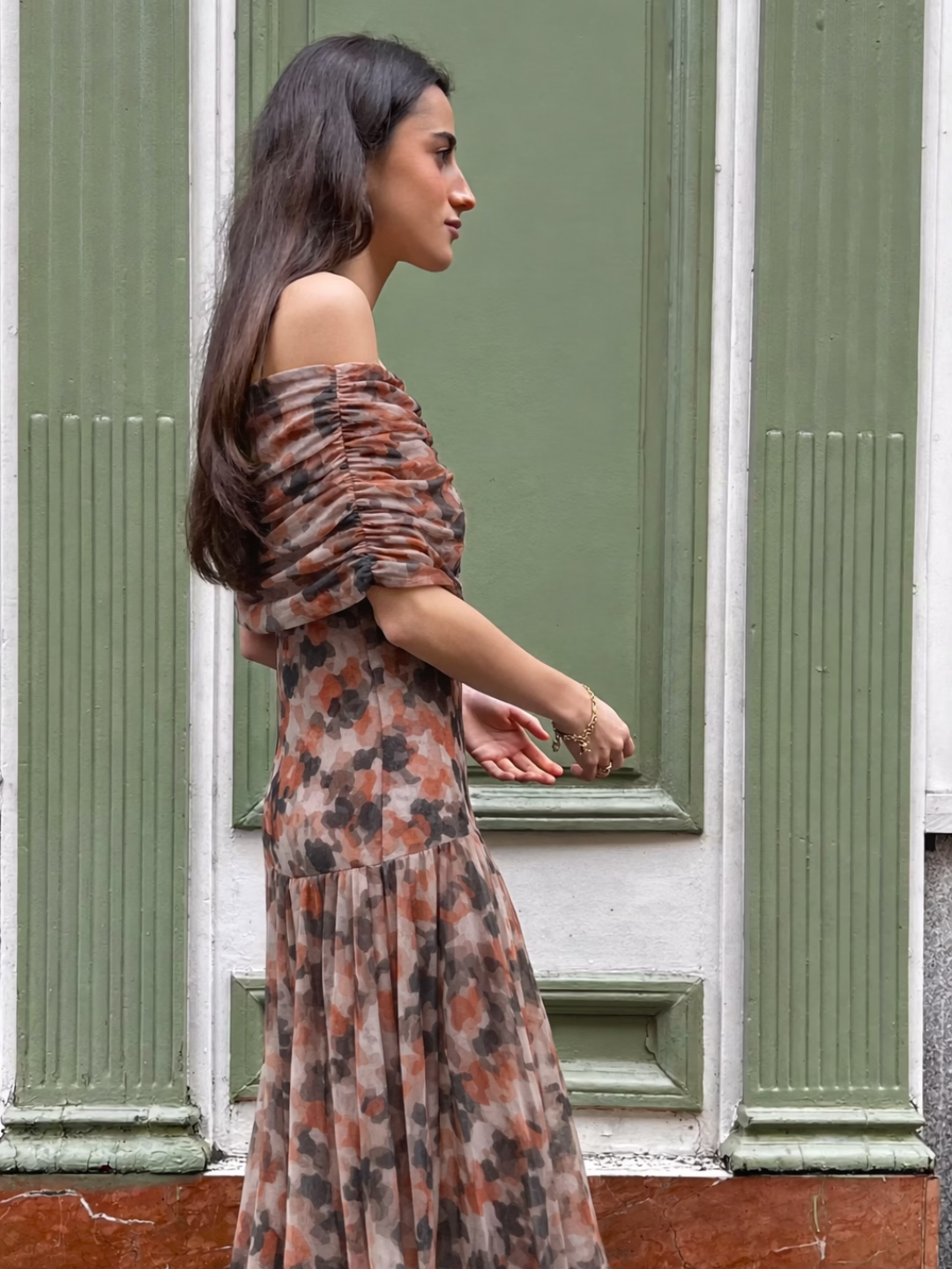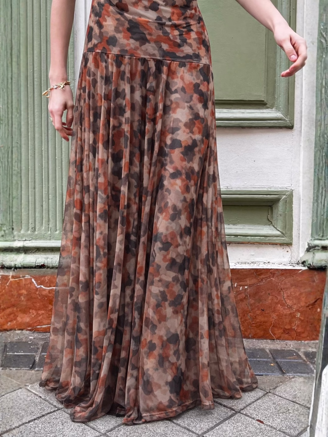Vestido largo de gasa estampado en tonos tierra, negro y caldera con efecto acuarela. Tejido drapeado en la parte superior que realza la silueta. Falda larga con caída fluida y movimiento.
