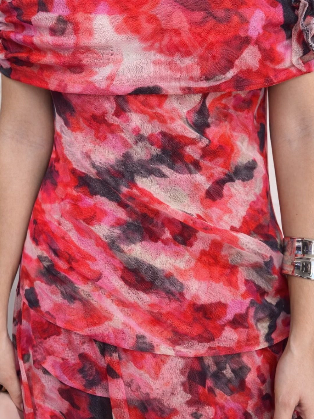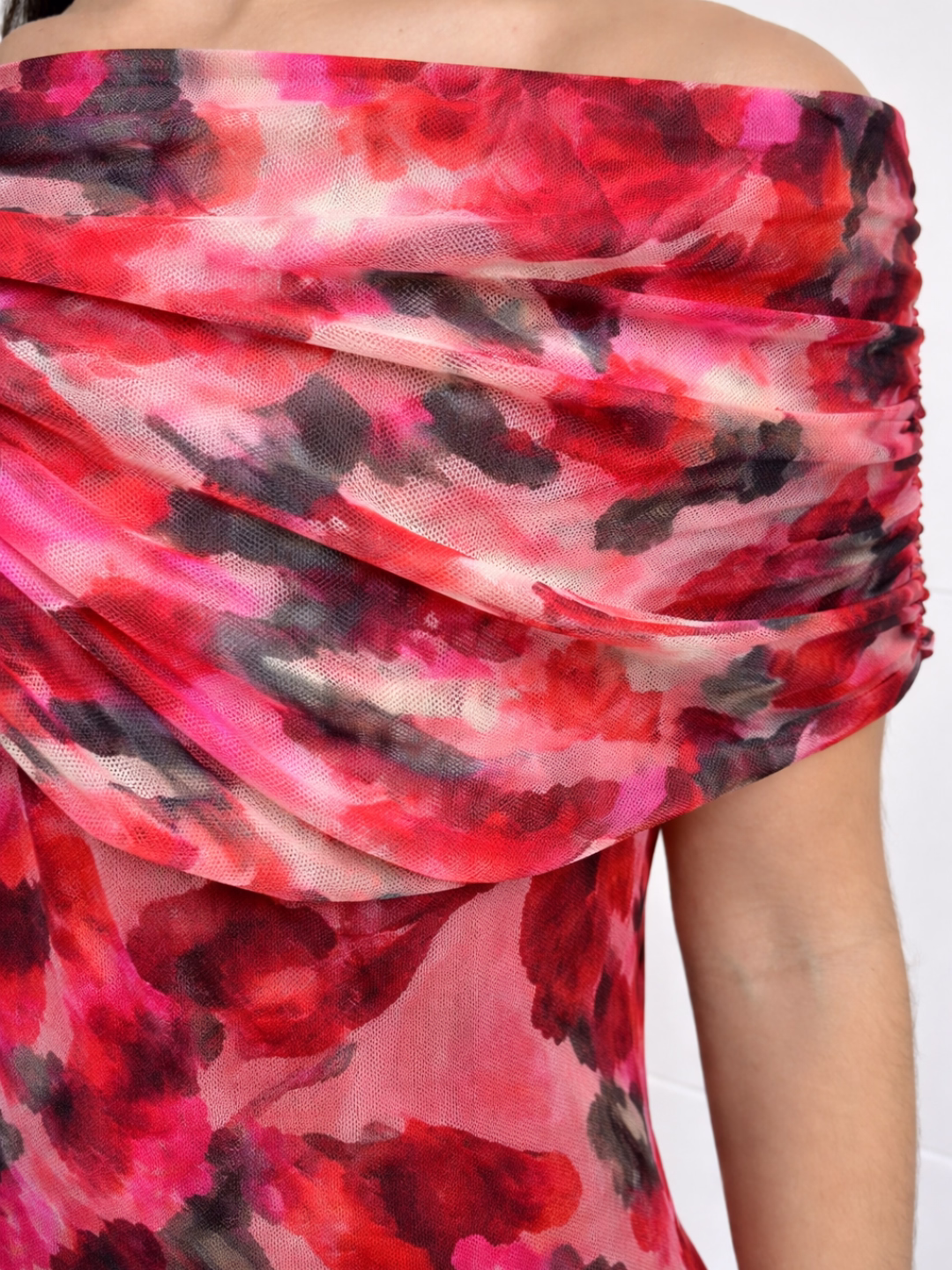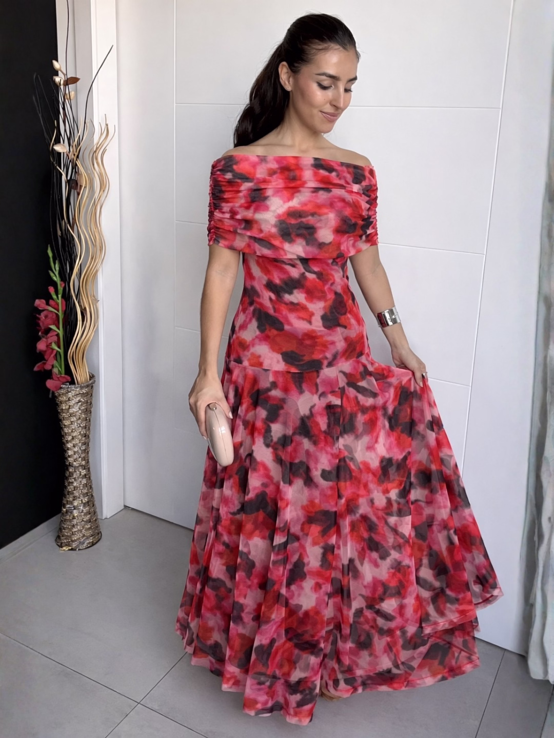 Vestido largo de gasa estampado en tonos carmesí, rojo y nude con efecto acuarela. Diseño con escote bardot que deja los hombros al descubierto, acompañado de una banda fruncida. Cuerpo ligeramente ajustado y falda con caída fluida y movimiento.