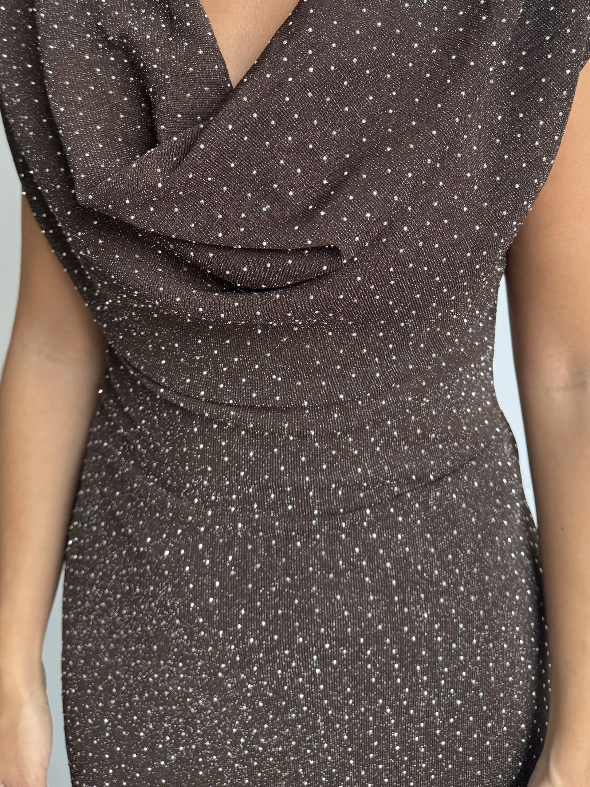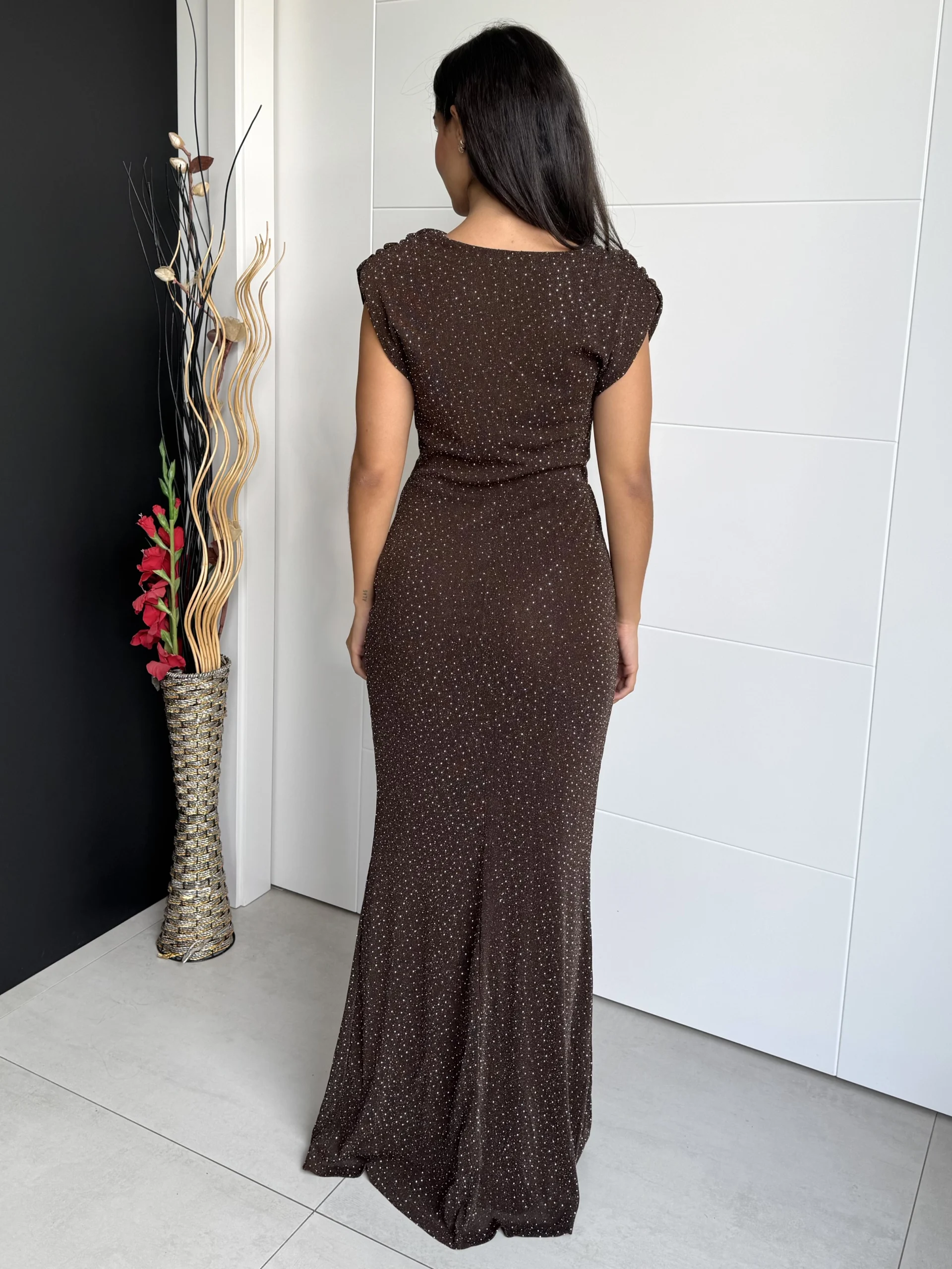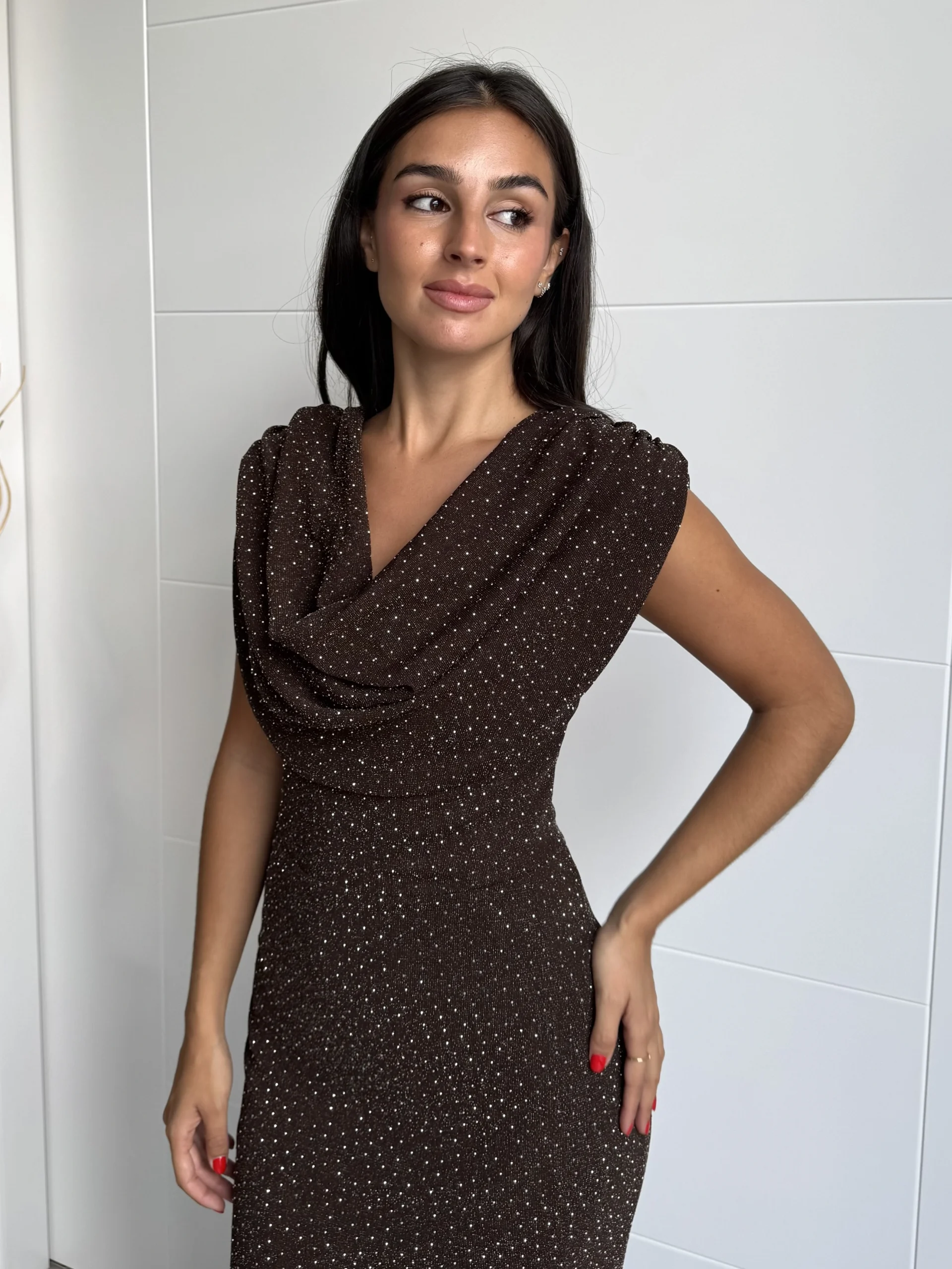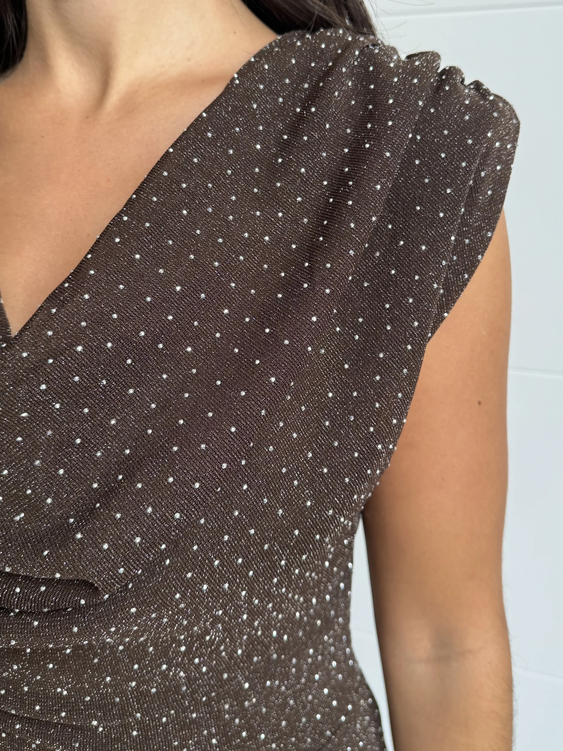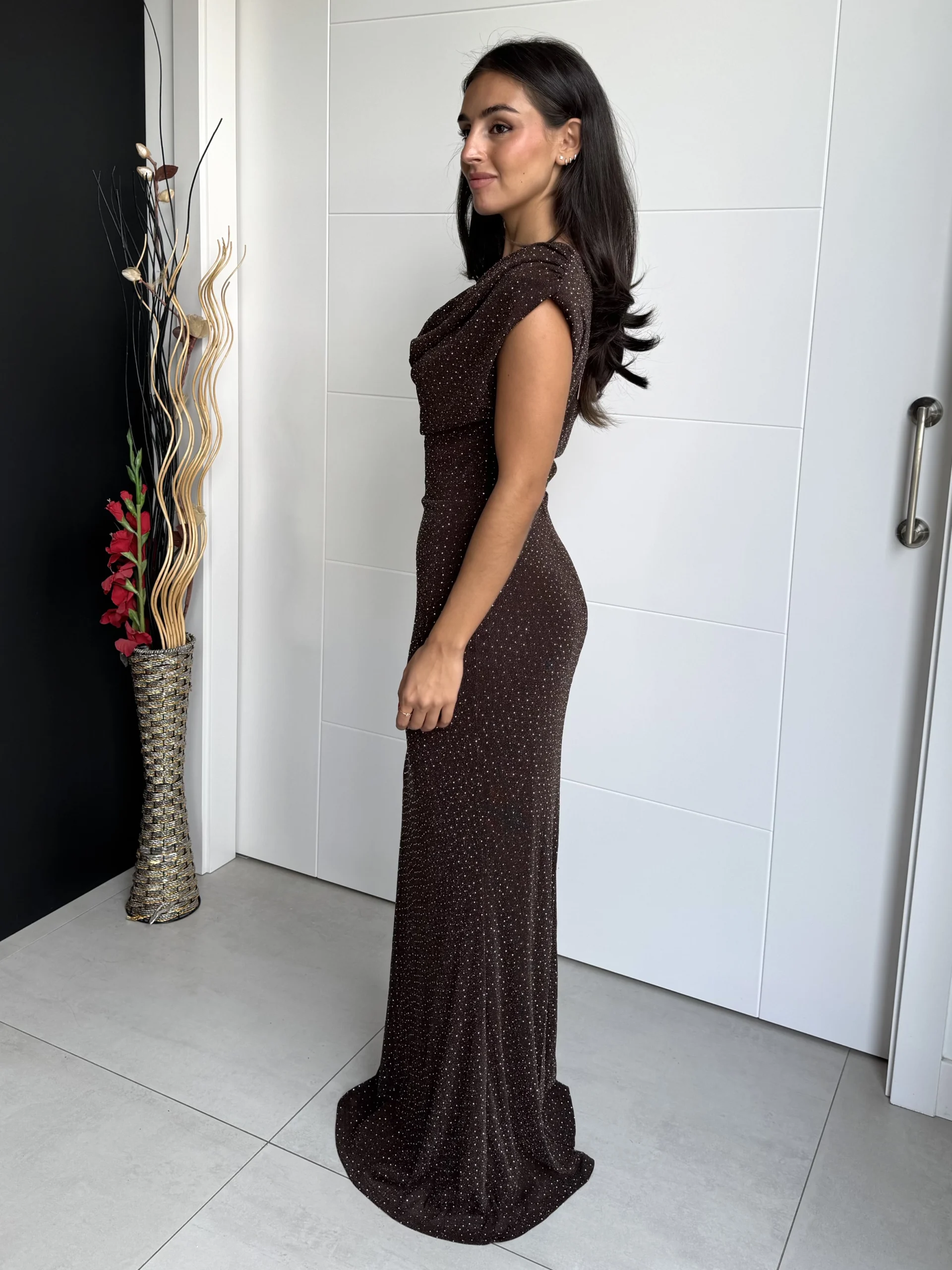 Vestido largo chocolate con strass con corte entallado y falda de silueta sirena. El escote drapeado en cascada realza la zona del busto con elegancia, mientras que los microdestellos plateados iluminan la prenda con un brillo sutil y sofisticado. Confeccionado en tejido elástico de punto, ofrece comodidad y ajuste perfecto, adaptándose a la figura sin perder fluidez en el movimiento.