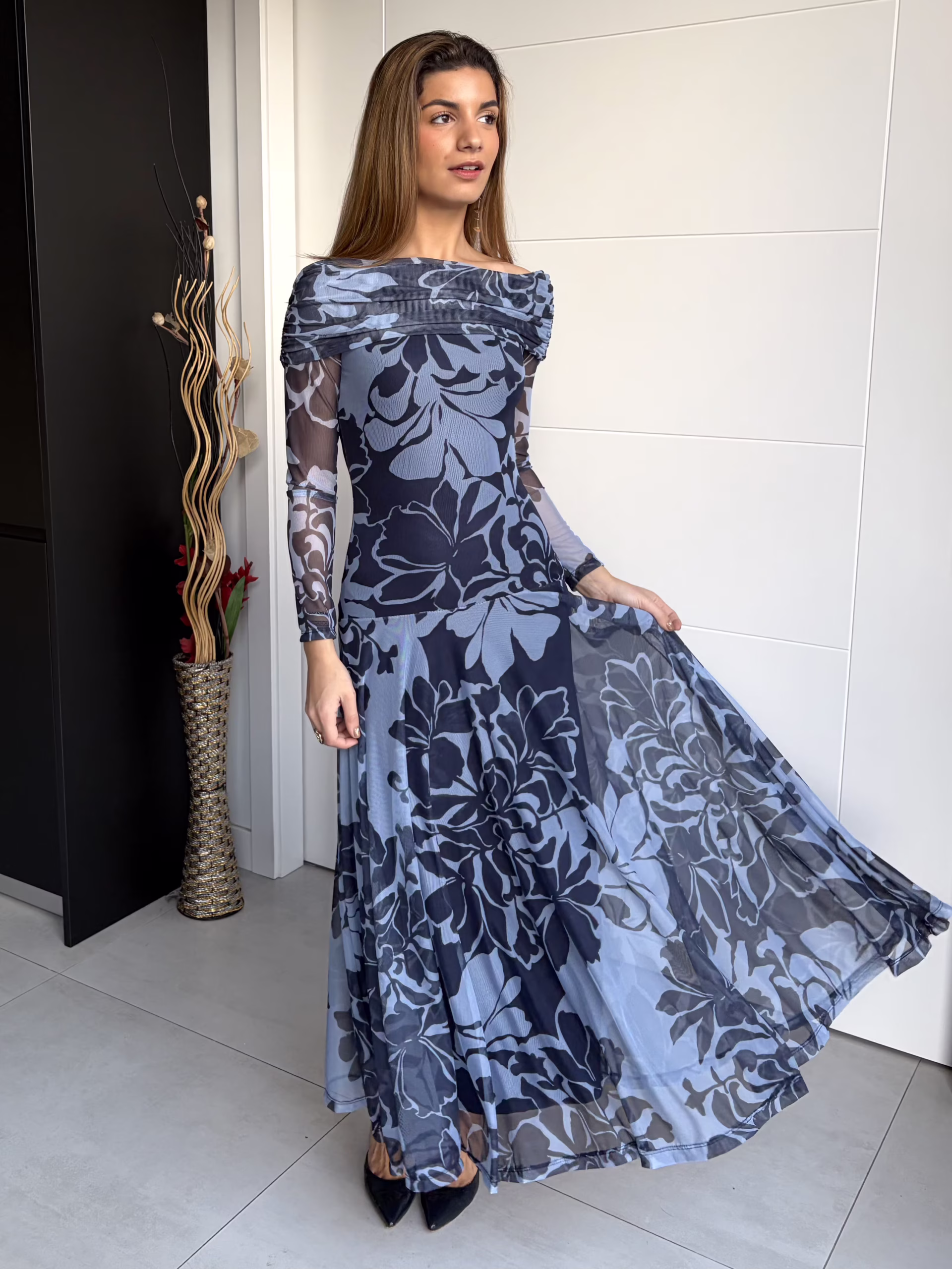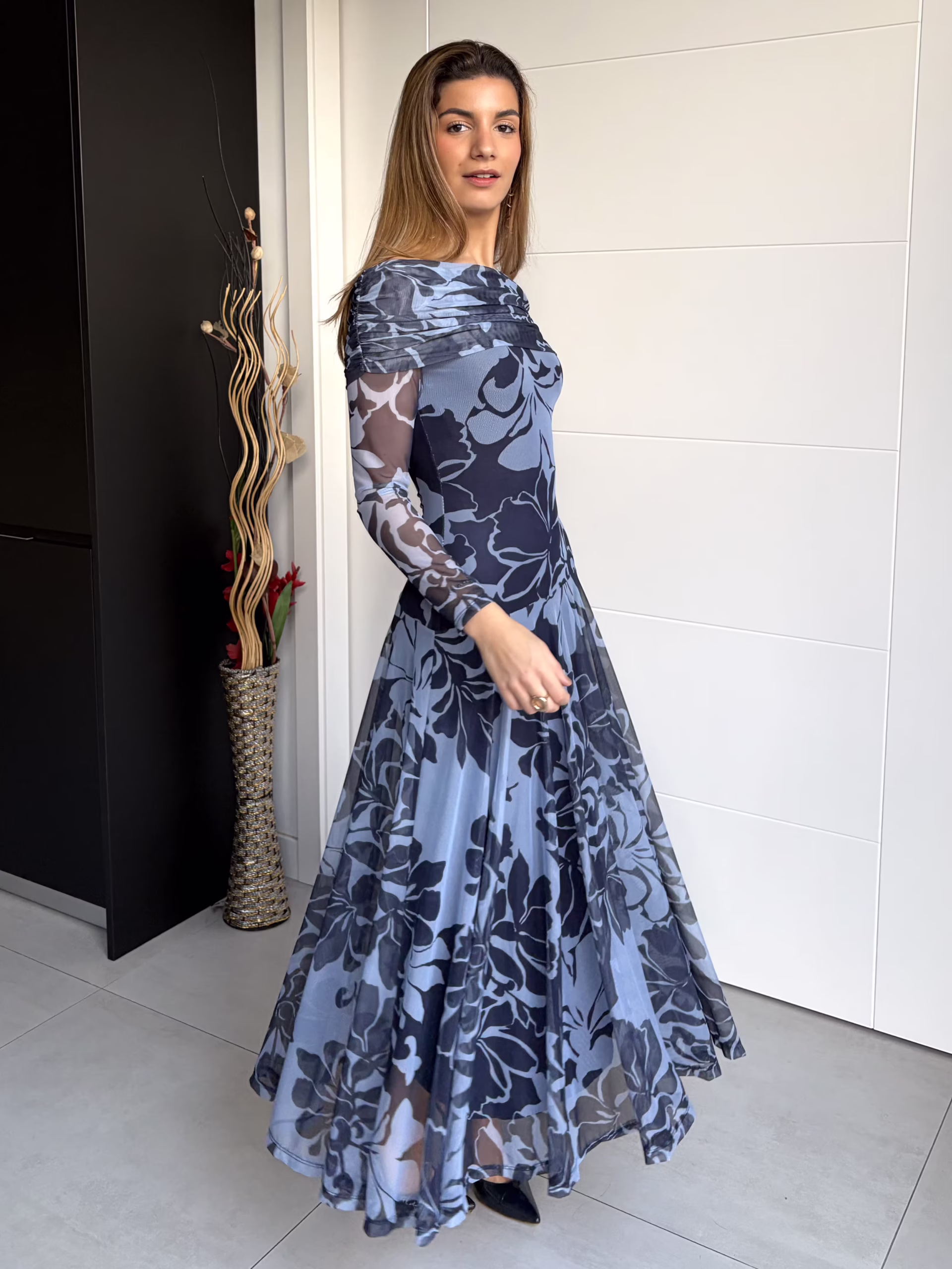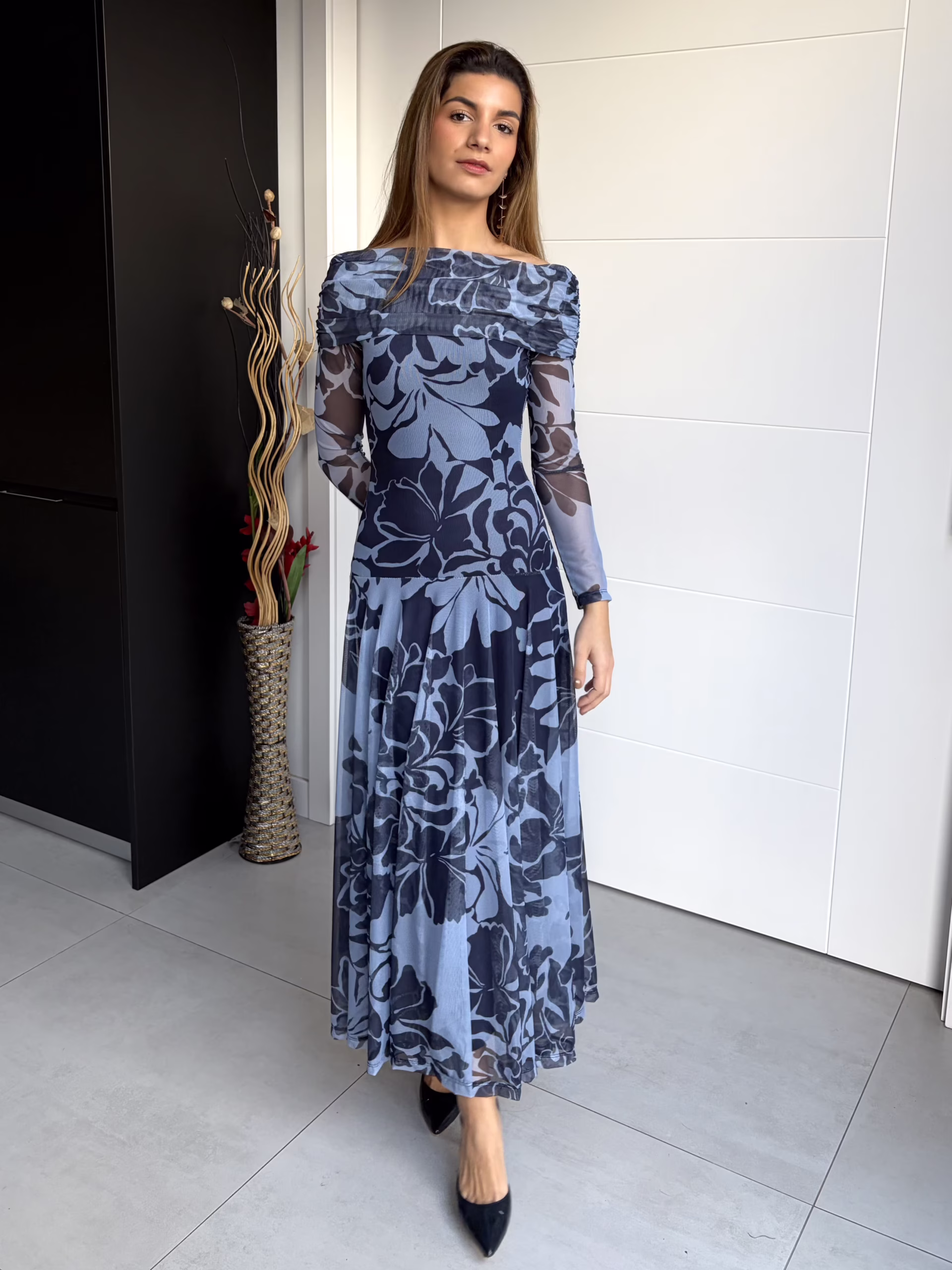 Vestido de tul largo en tonos azules con estampado floral en toda la prenda. Presenta escote Bardot, manga larga semitransparente y cintura elástica que se adapta cómodamente al cuerpo. Incorpora forro interior en azul marino y una silueta evasé con caída fluida y movimiento.