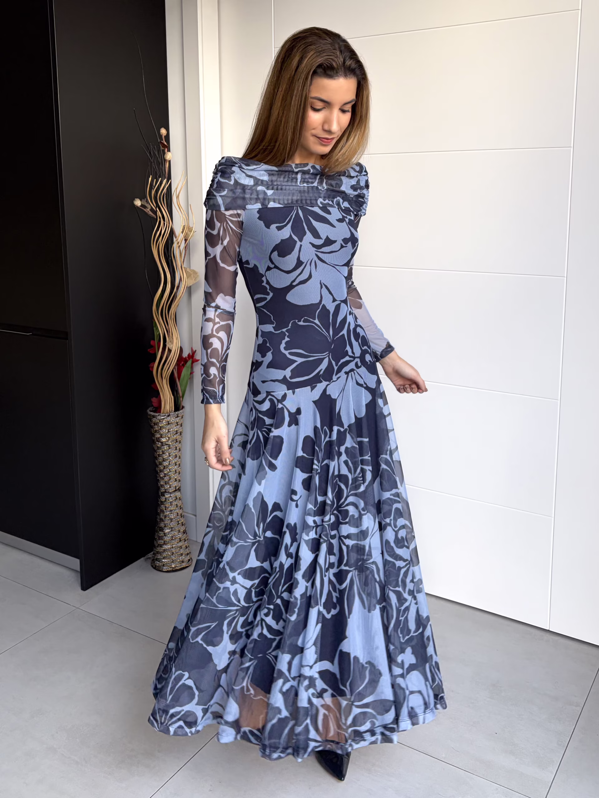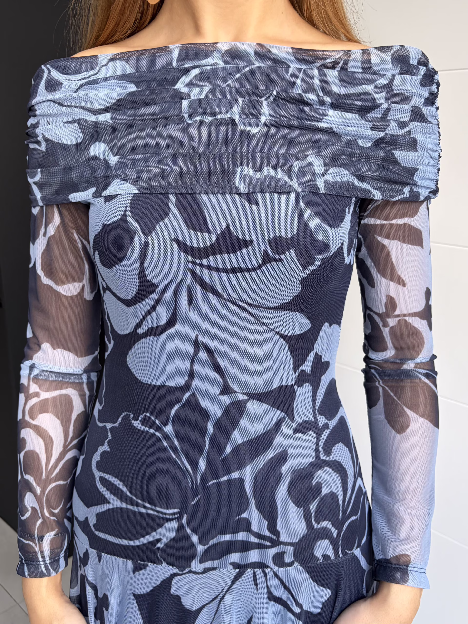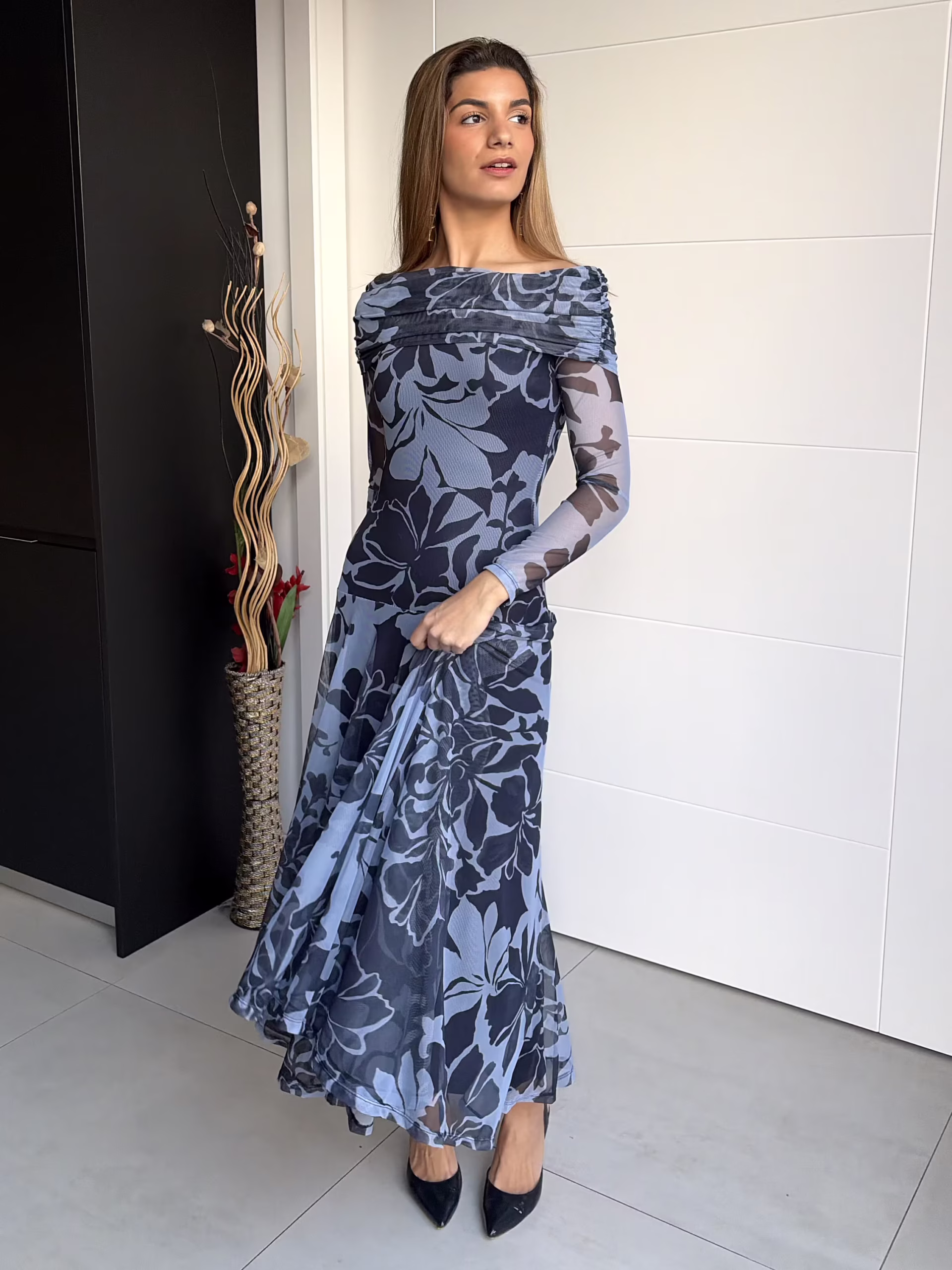 Vestido de tul largo en tonos azules con estampado floral en toda la prenda. Presenta escote Bardot, manga larga semitransparente y cintura elástica que se adapta cómodamente al cuerpo. Incorpora forro interior en azul marino y una silueta evasé con caída fluida y movimiento.