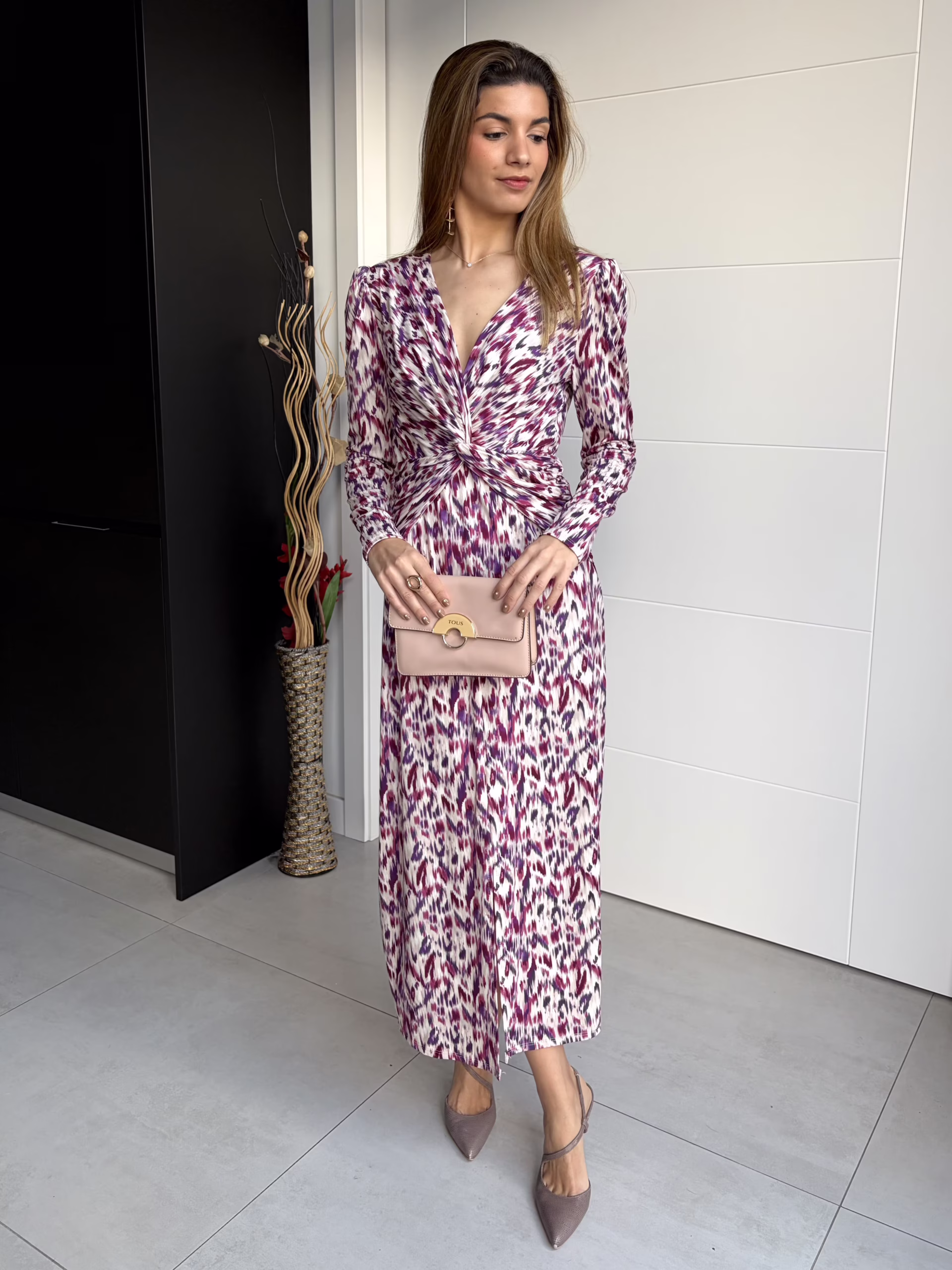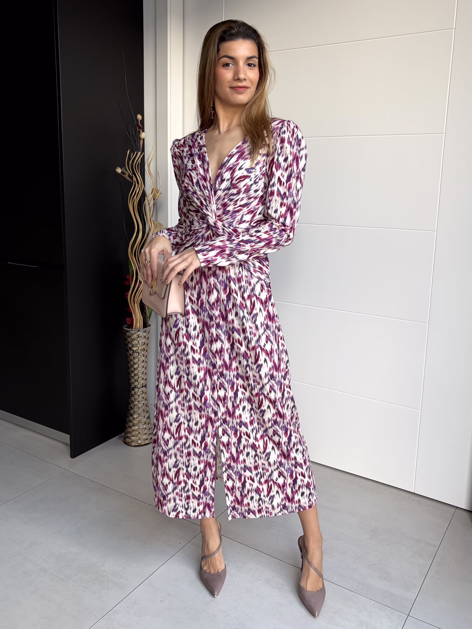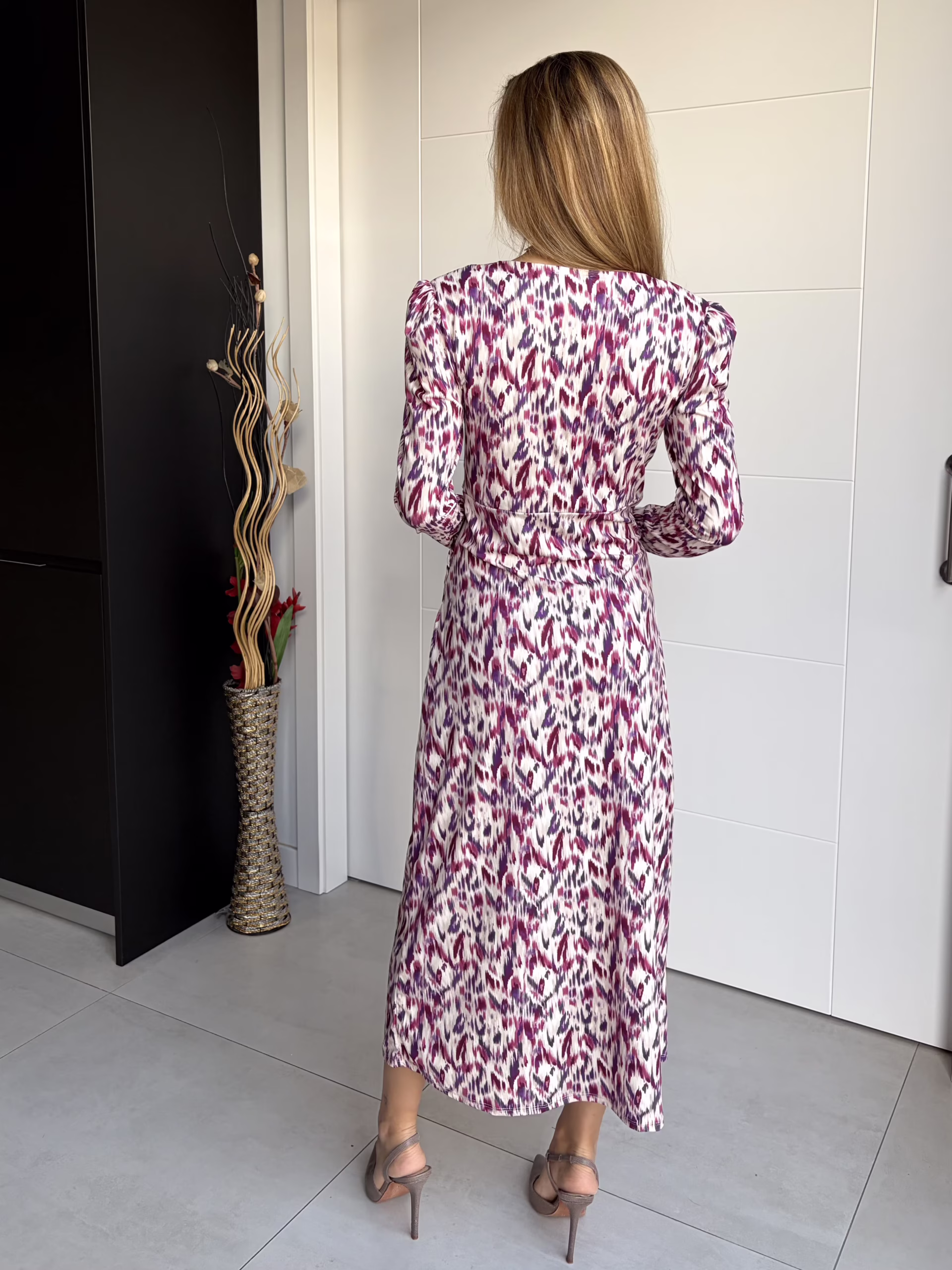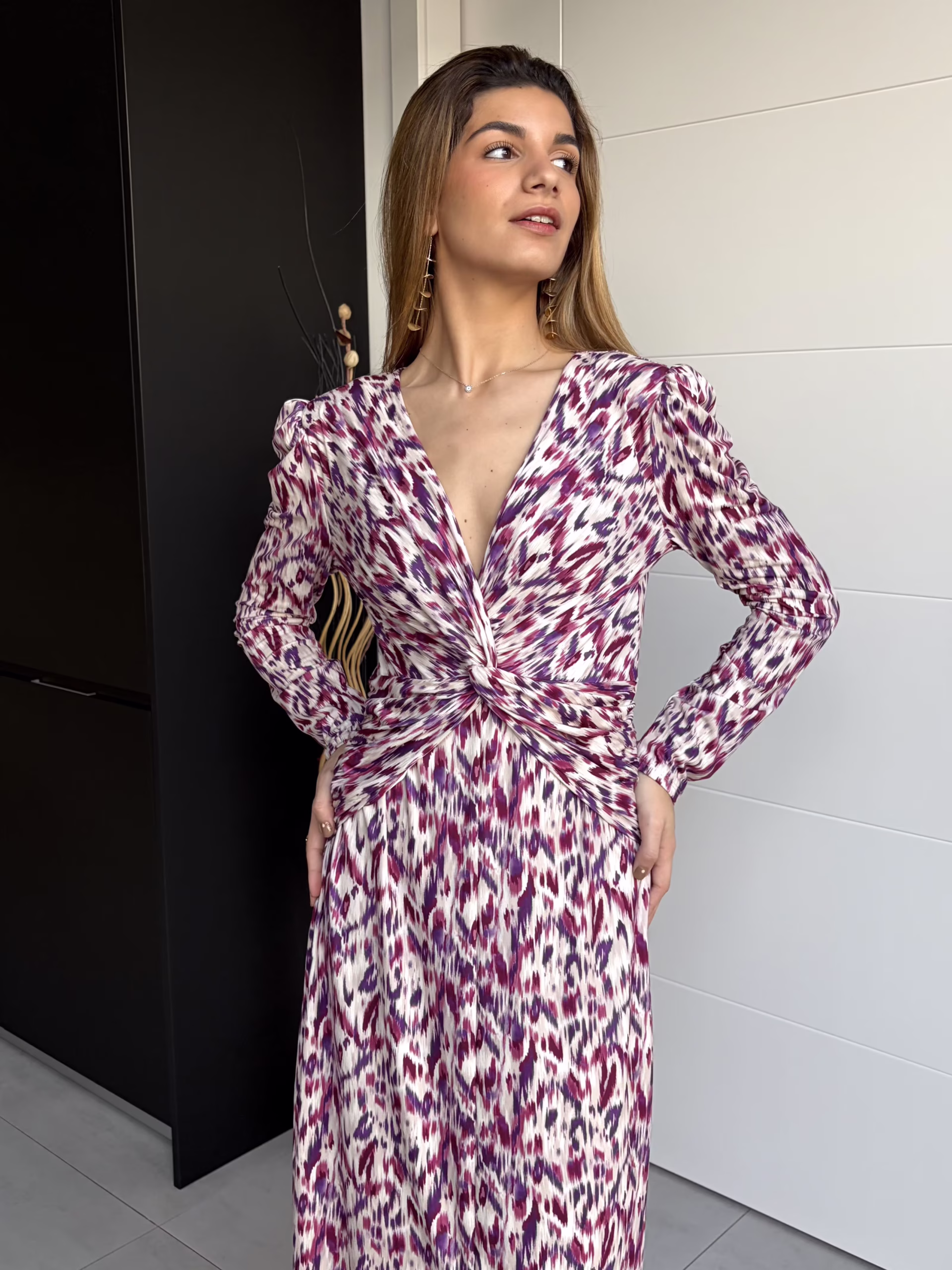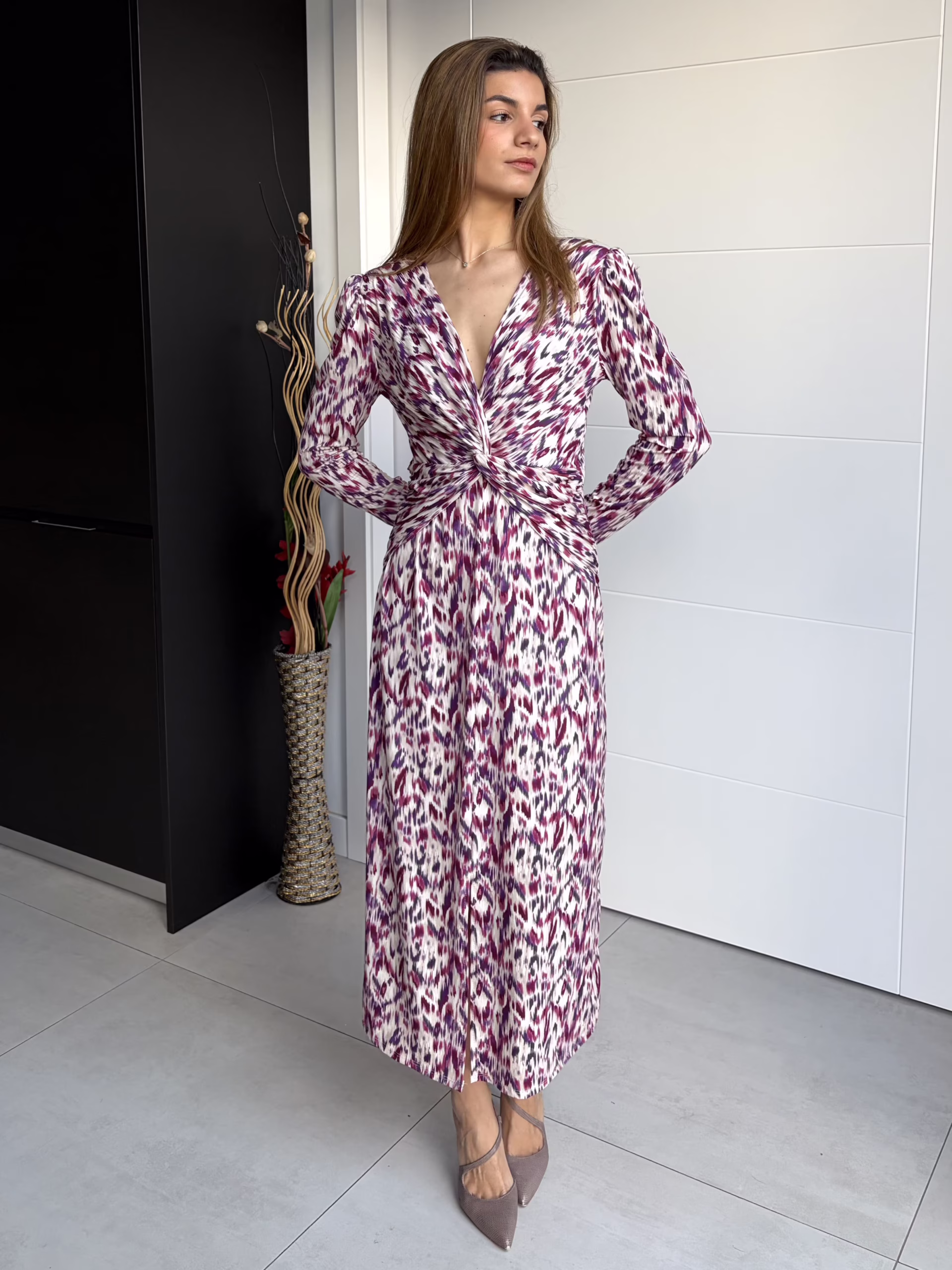 Vestido largo de corte fluido con estampado en tonos buganvilla y escote en pico cruzado. Presenta fruncido central que estiliza la silueta, mangas largas y falda evasé con caída natural. Tejido ligero y cómodo, ideal para looks femeninos y elegantes.