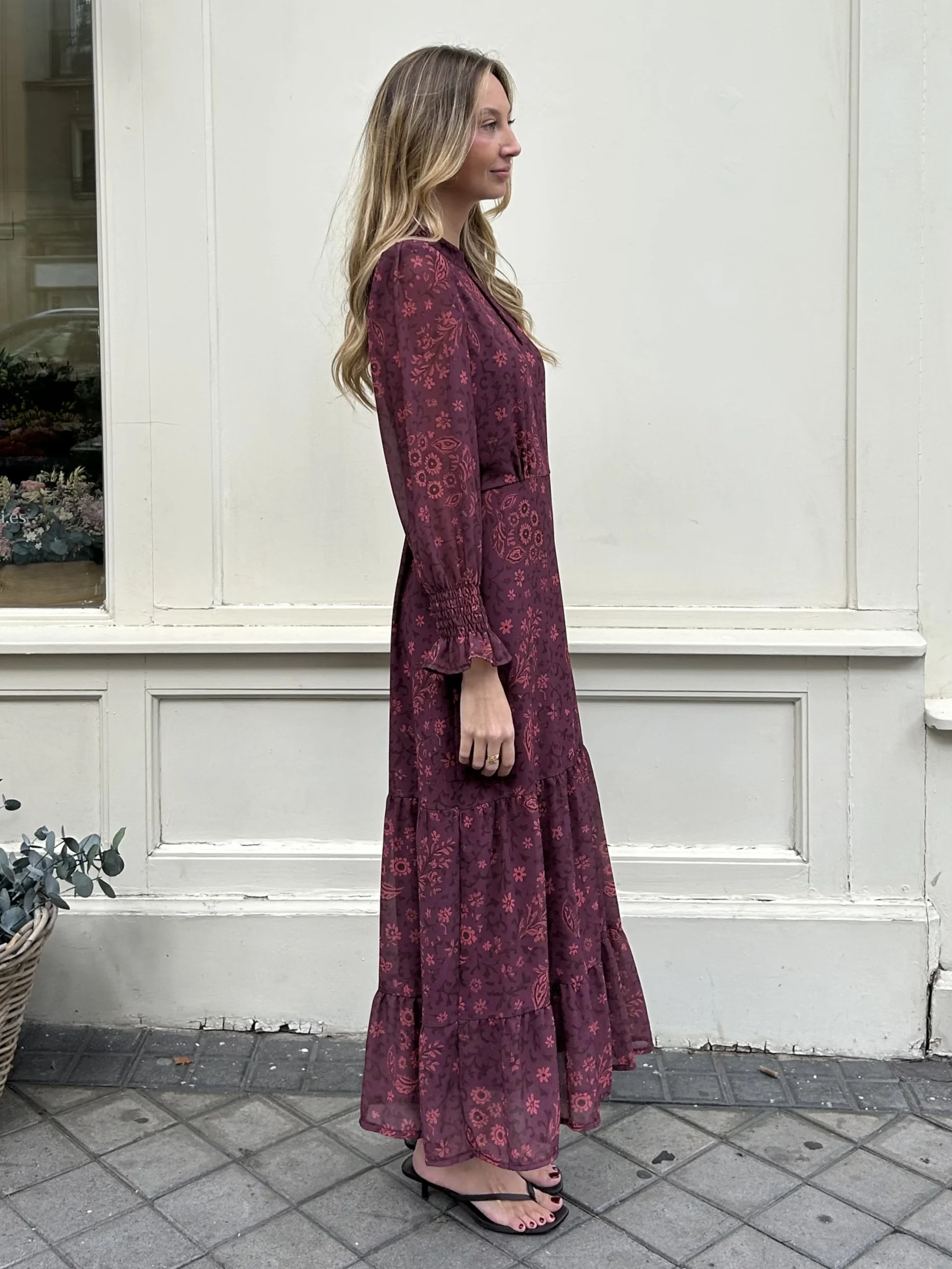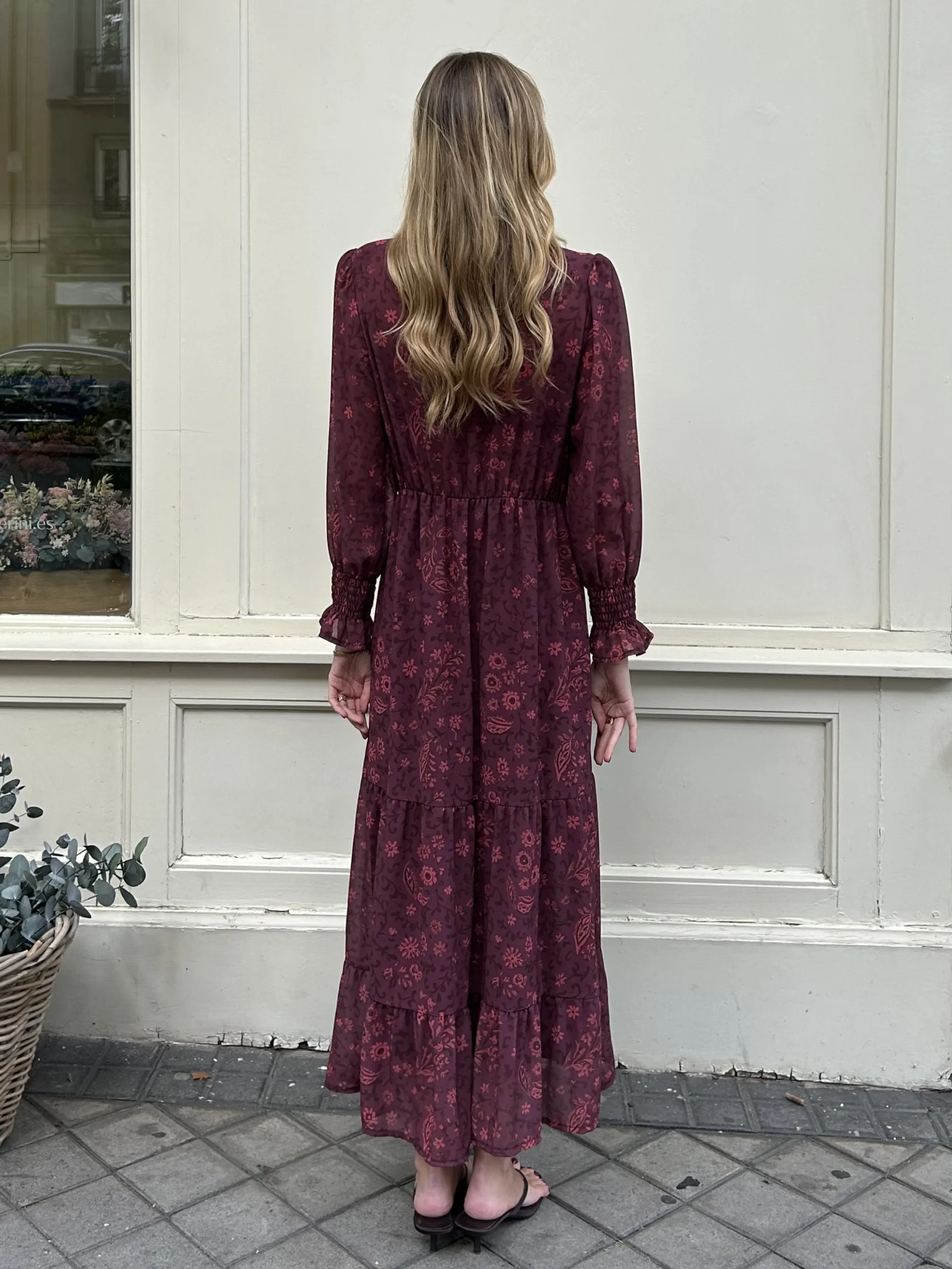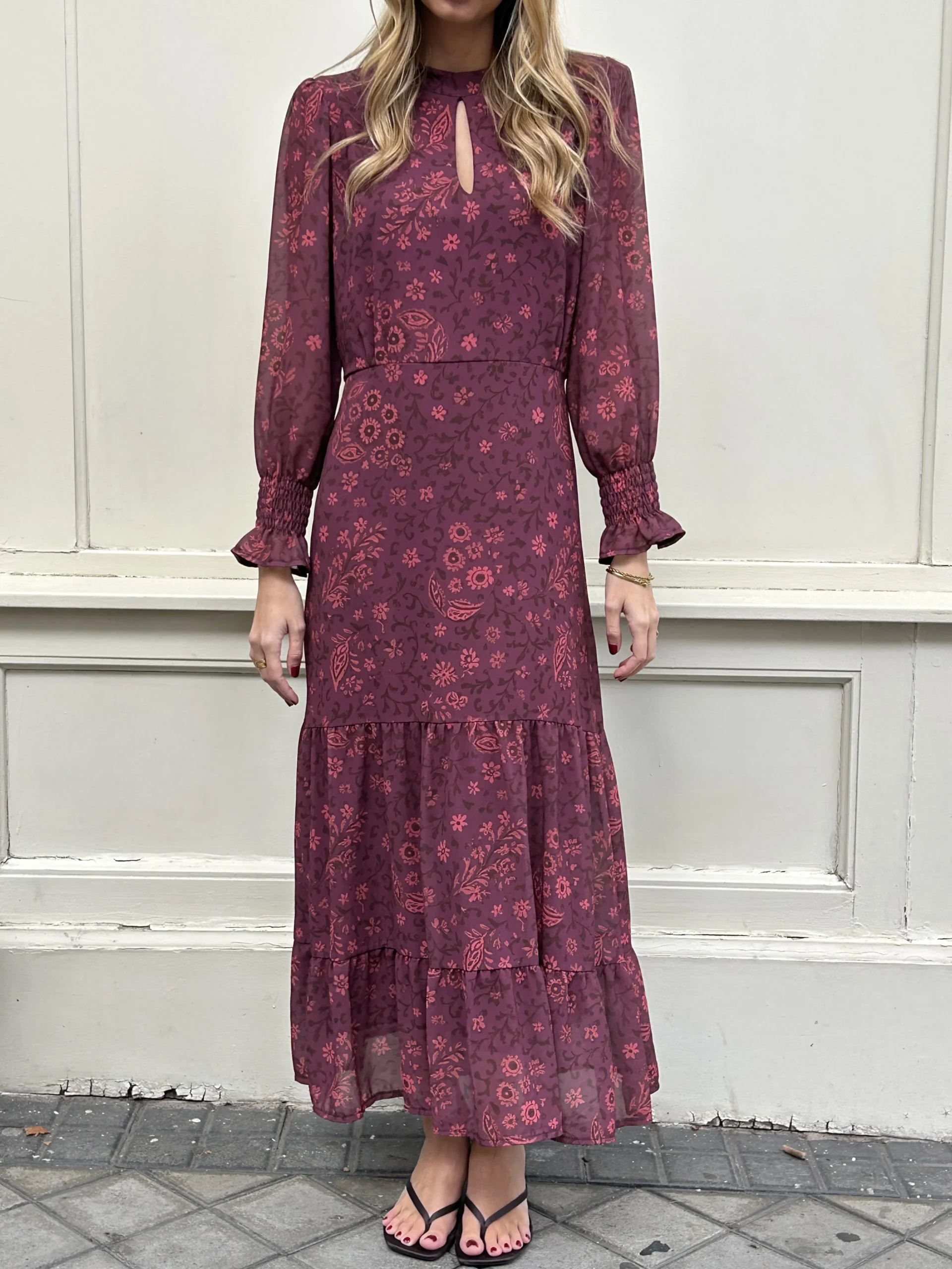 Vestido largo de gasa burdeos con estampado pequeño en colores granate y rosa. Cintura más ceñida con goma elástica en la parte trasera. Cierre con botones en la nuca.