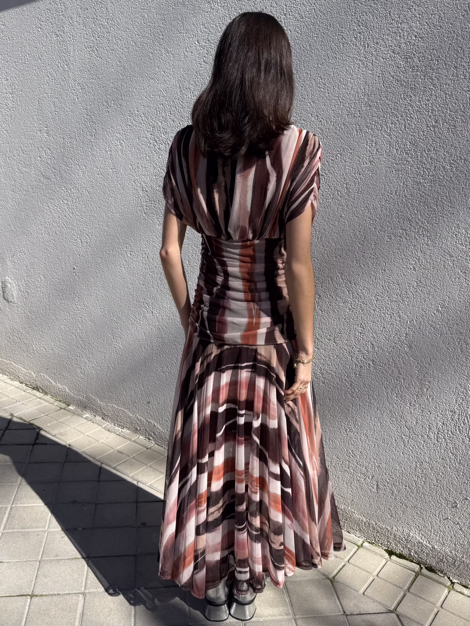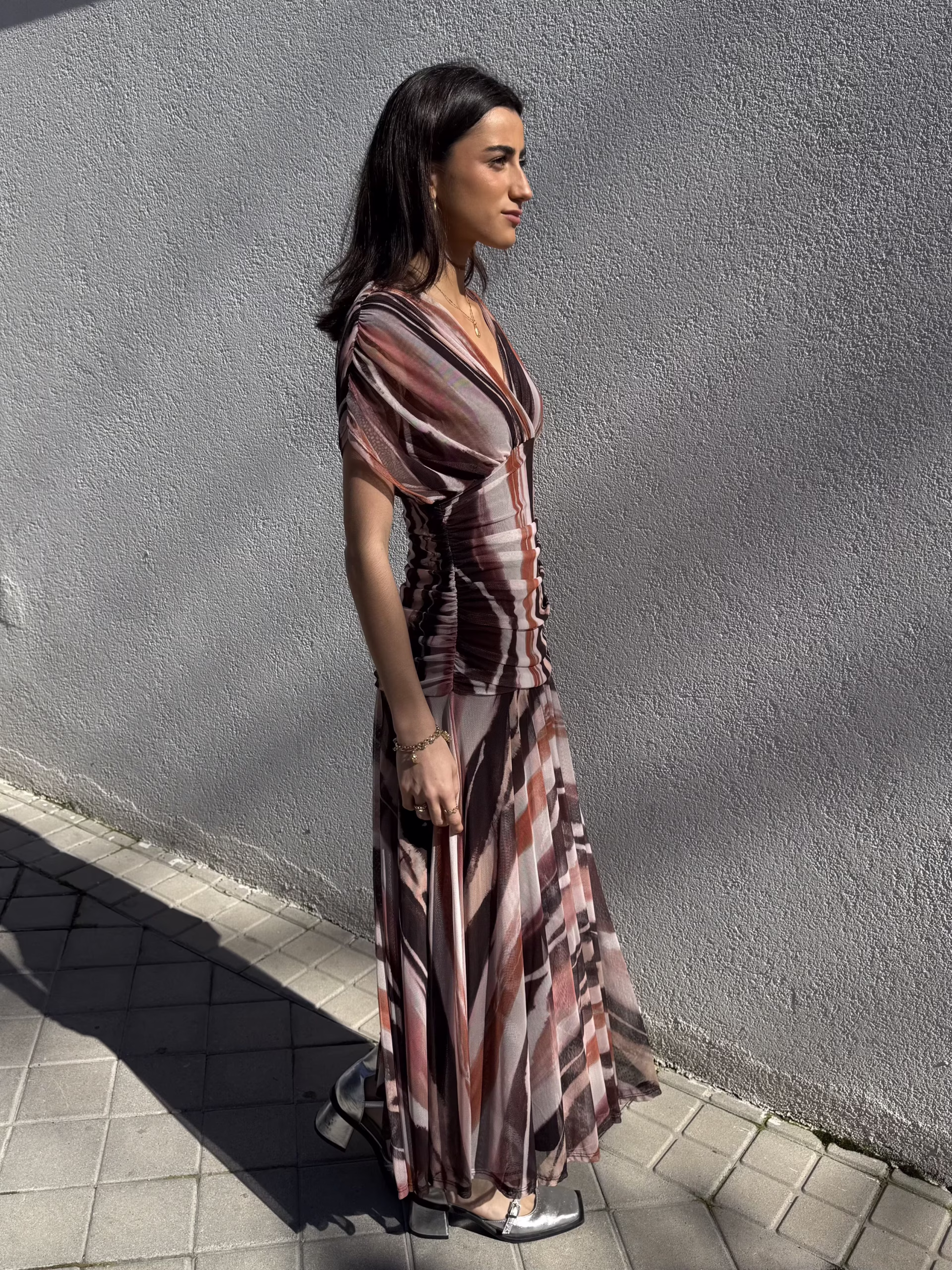 Vestido largo estampado en tonos tierra con escote en pico drapeado y efecto cruzado. Cintura fruncida que define la silueta y falda larga fluida con movimiento natural. Mangas cortas tipo capa que aportan ligereza y elegancia.