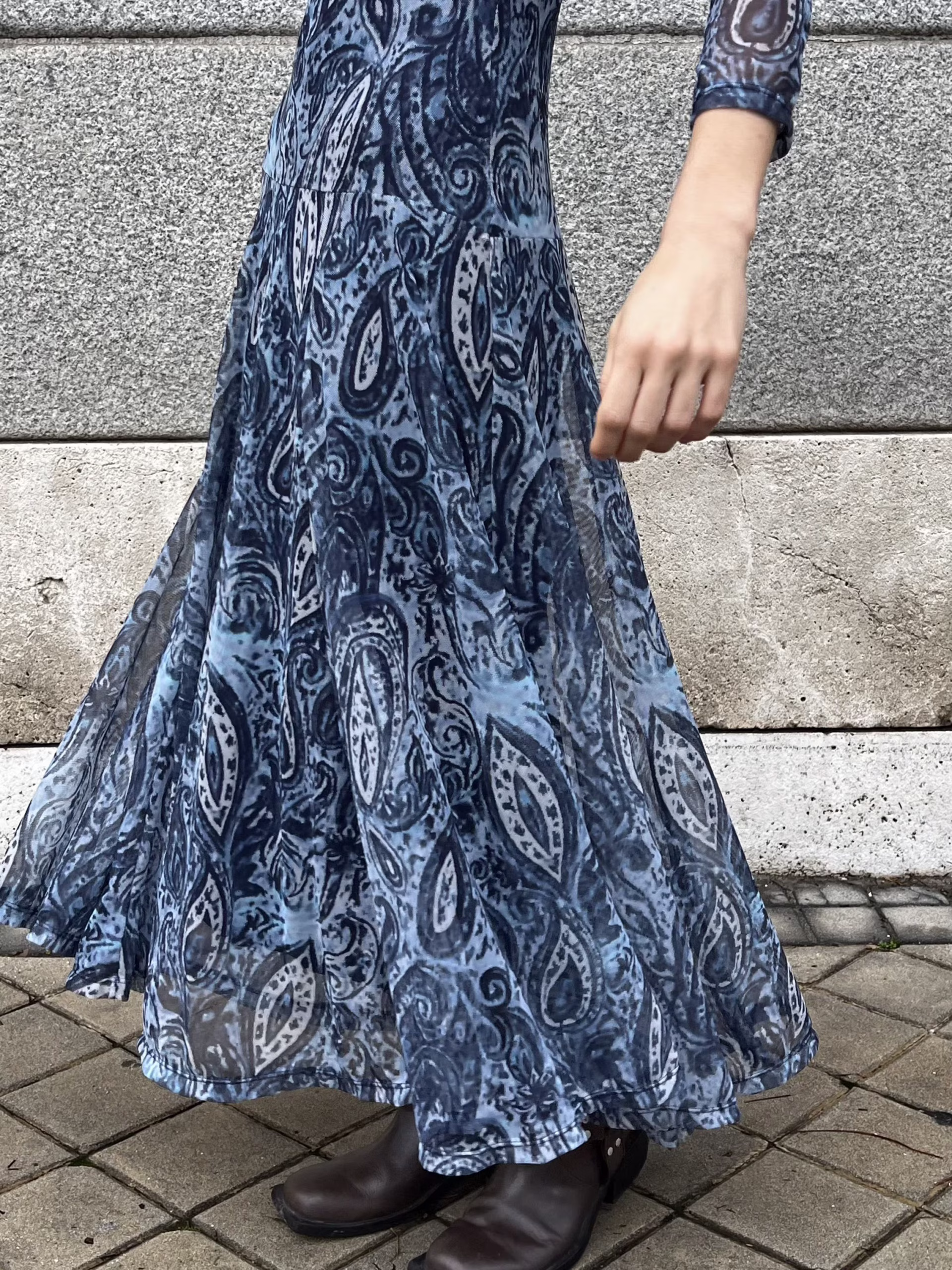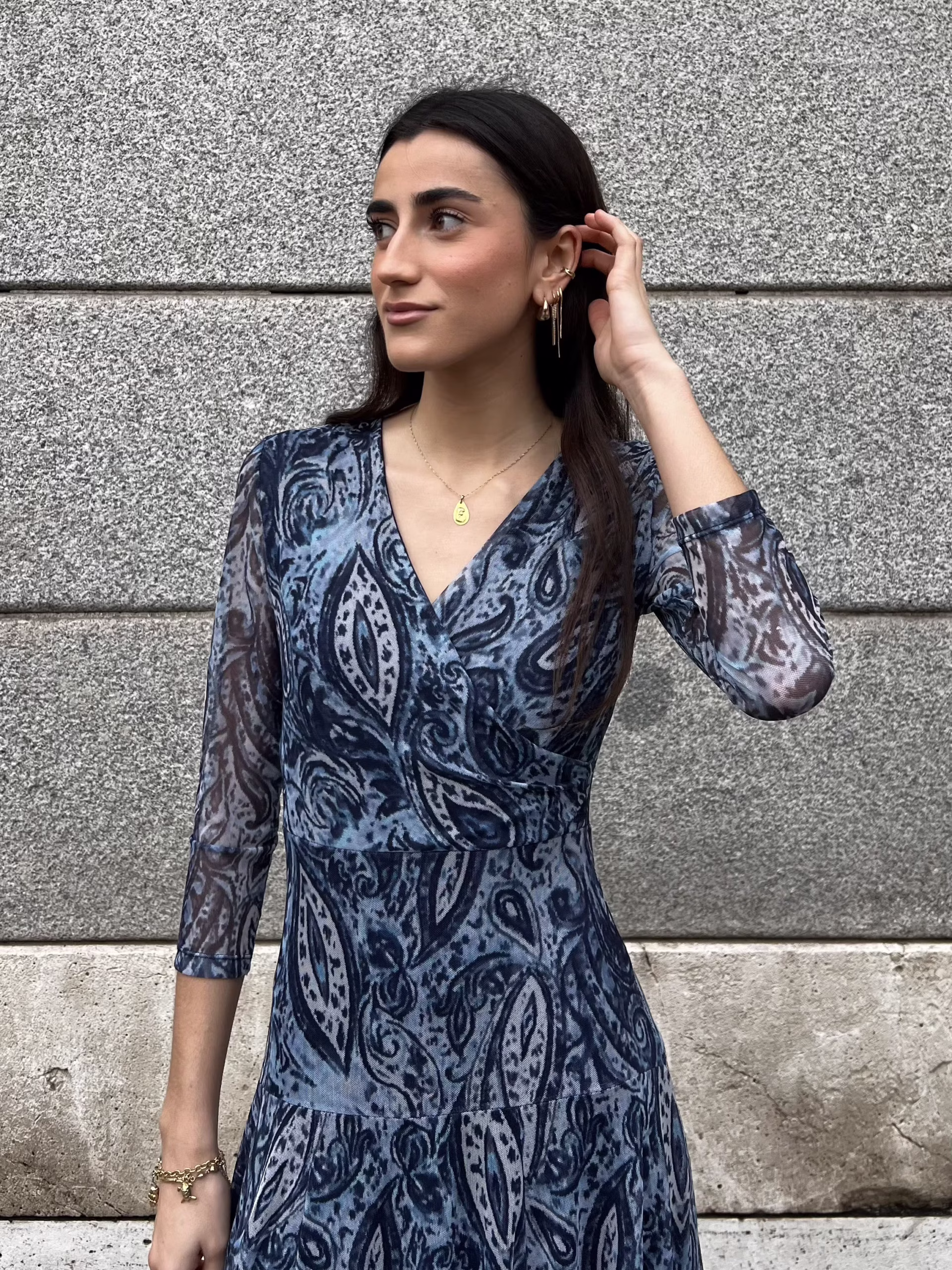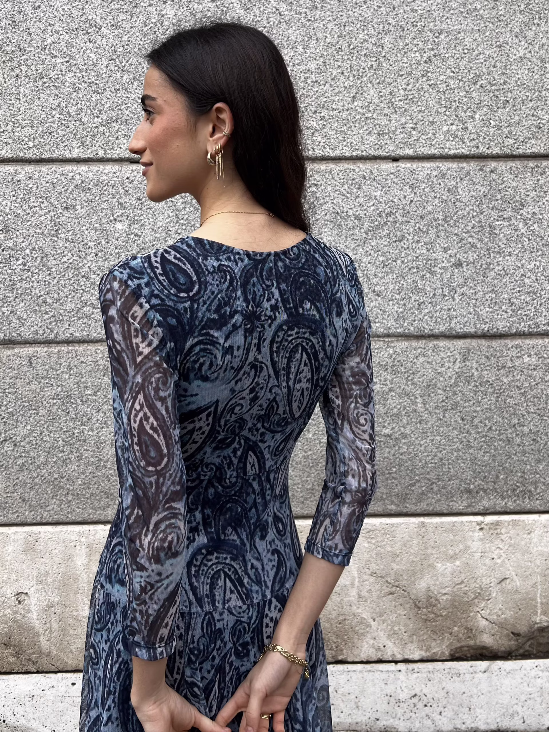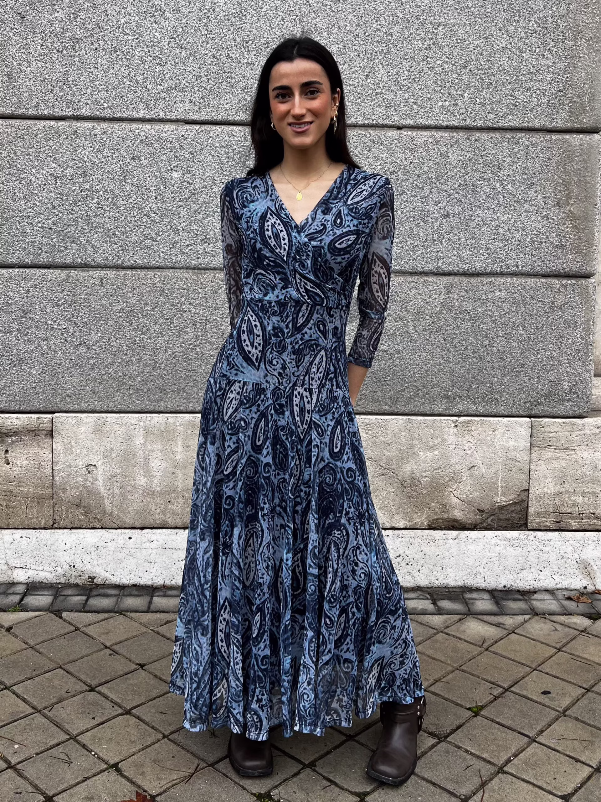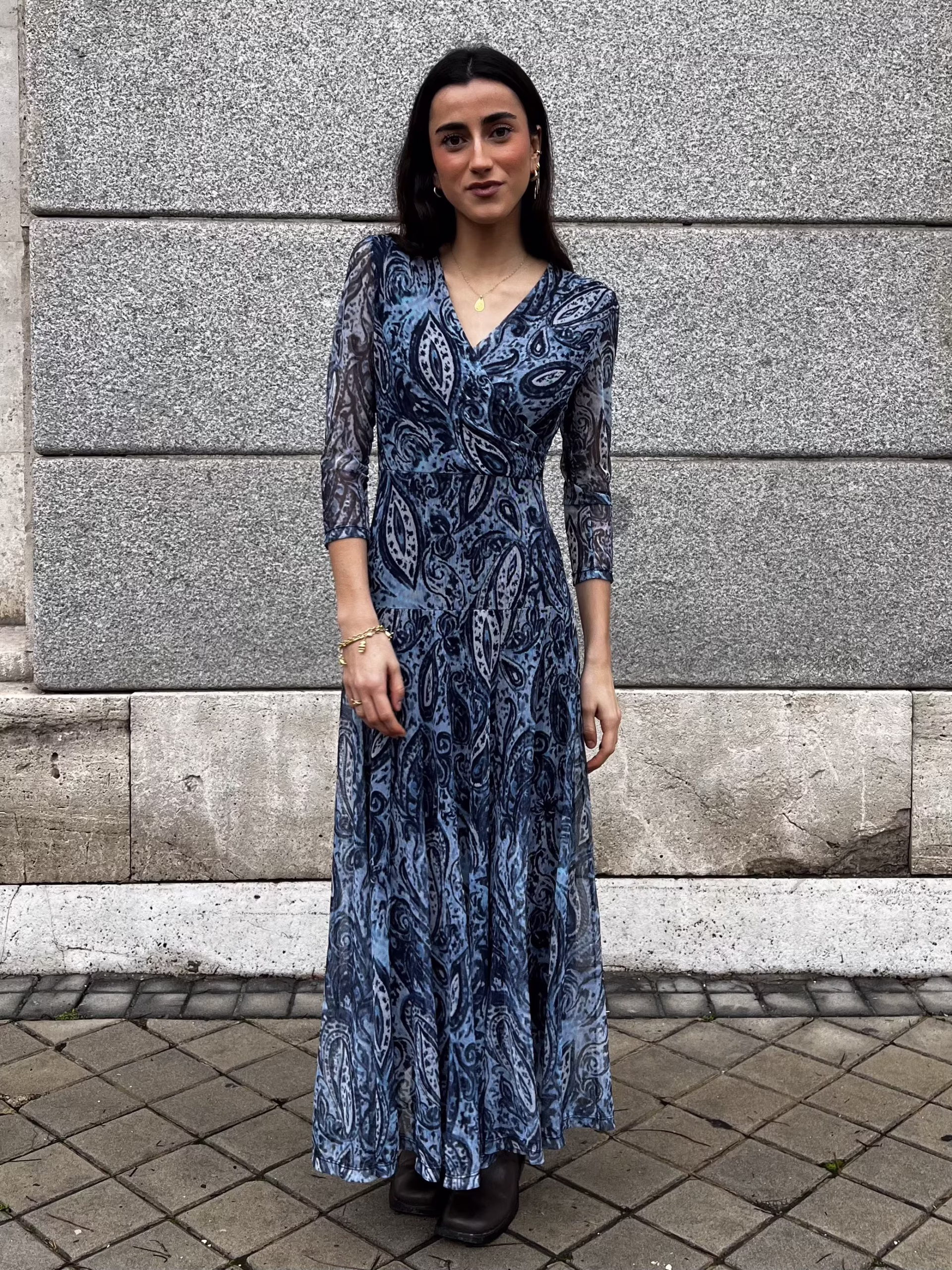 Vestido largo con estampado Paisley en tonos azul noche, confeccionado en tejido ligero y fluido con acabado semi translúcido. Diseño de manga larga transparente, escote en pico cruzado y cintura entallada que estiliza la silueta. Corte evasé con movimiento y caída suave.