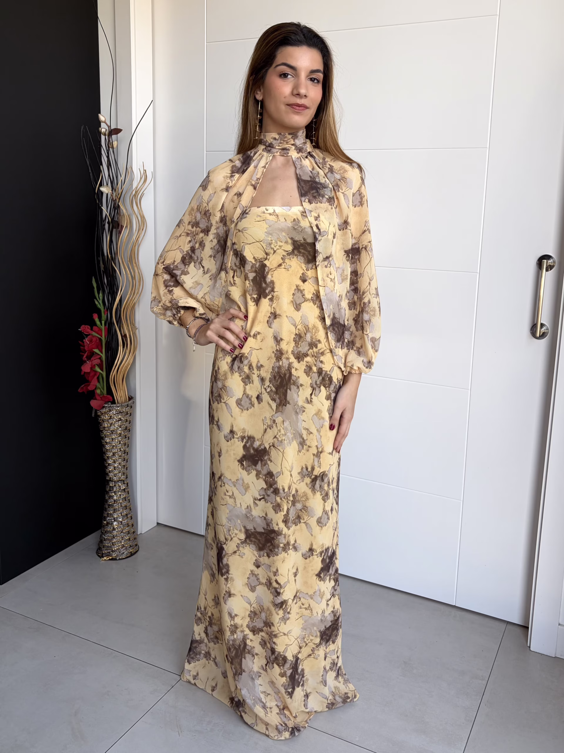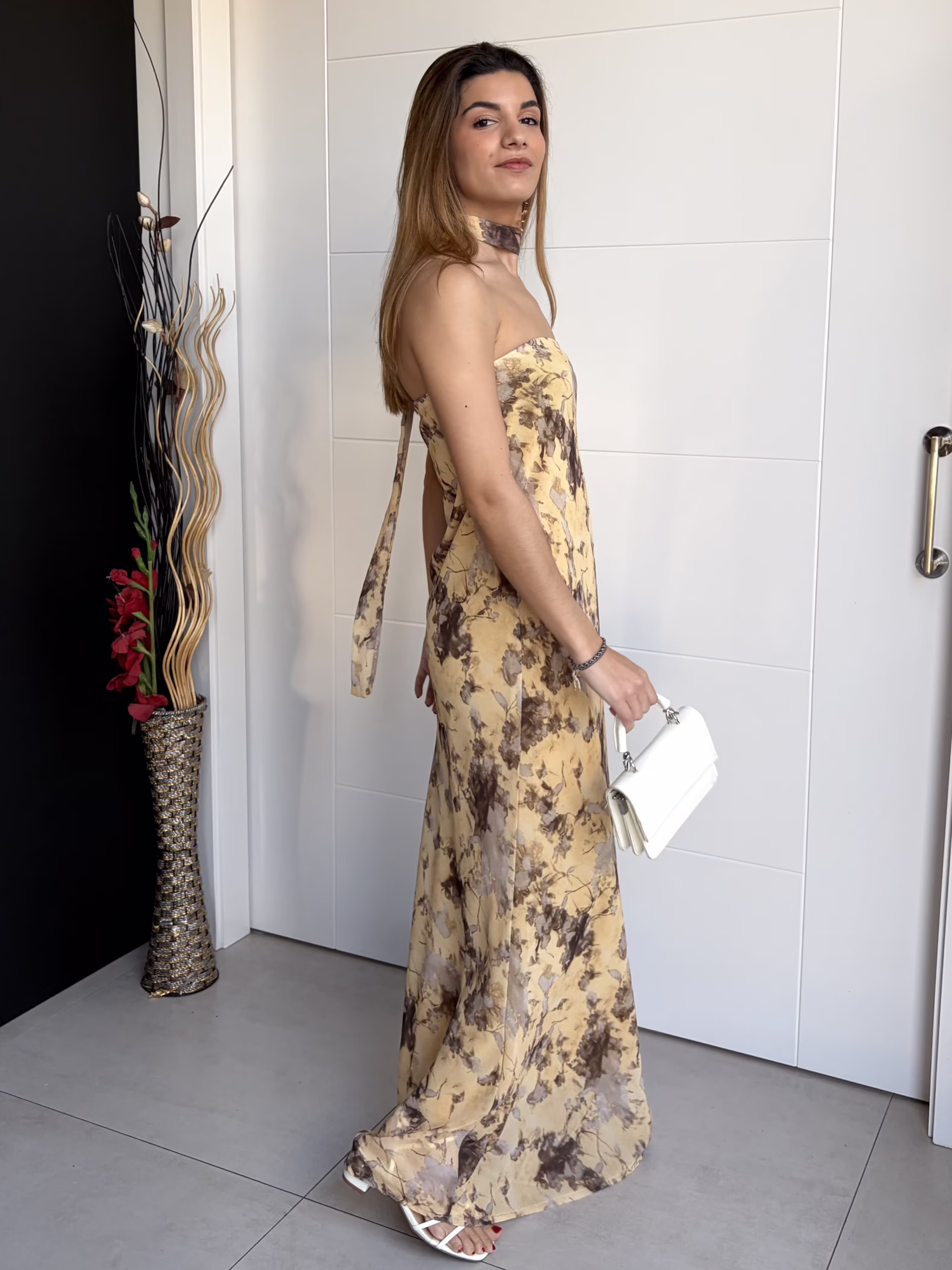 Vestido largo palabra de honor en tono amarillo pastel con estampado floral en marrón y beige. Diseño recto y fluido que estiliza la silueta. Parte superior con goma elástica que se adapta al cuerpo y aporta sujeción. Incluye tira a juego para el cuello que permite llevarlo como halter o tipo gargantilla. Forro interior en tono amarillo.