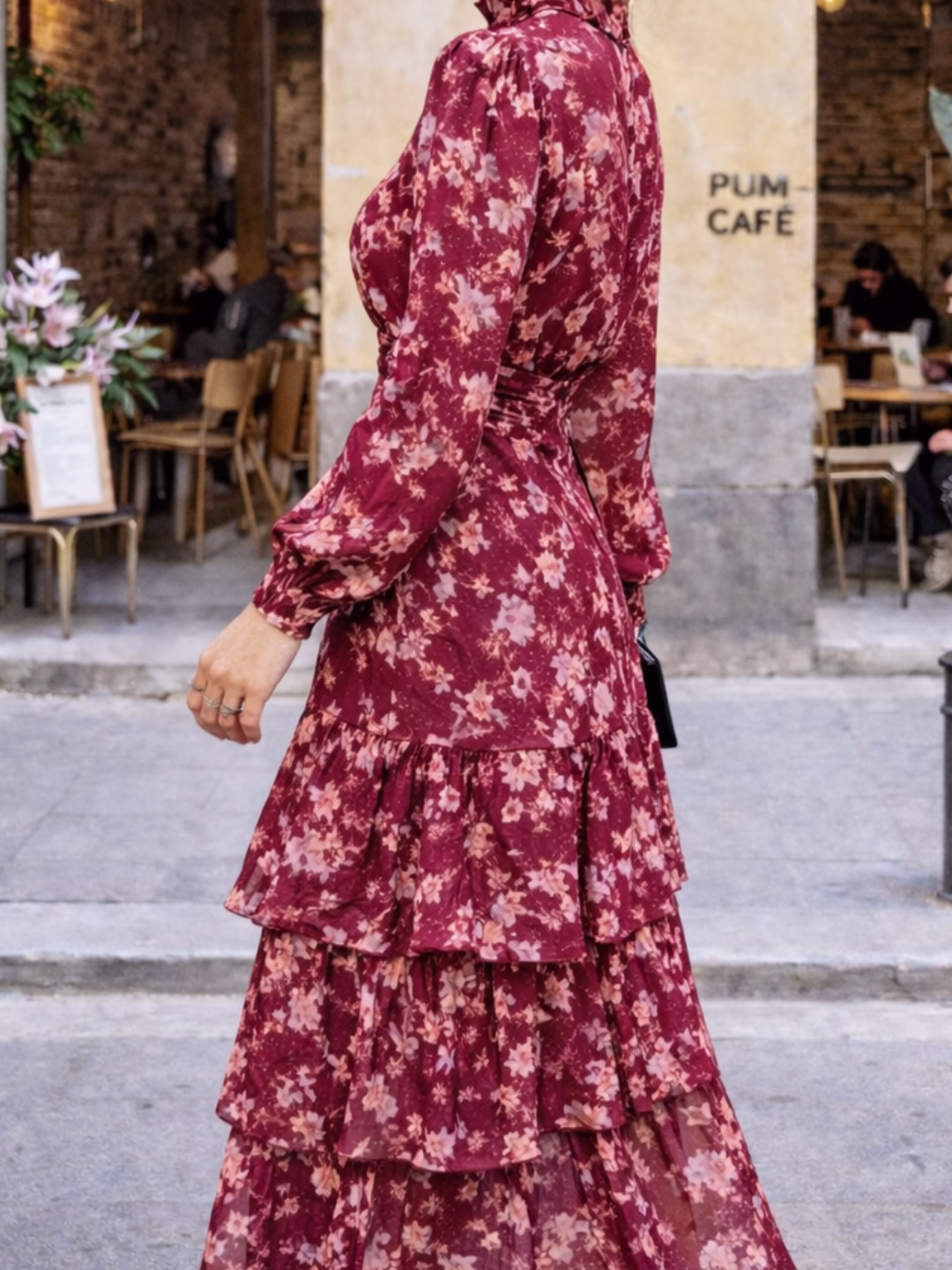 Vestido largo de volantes en tonos cereza con cuello alto y apertura frontal en forma de gota. Manga larga y falda fluida en capas con volantes. Femenino, elegante y muy favorecedor.