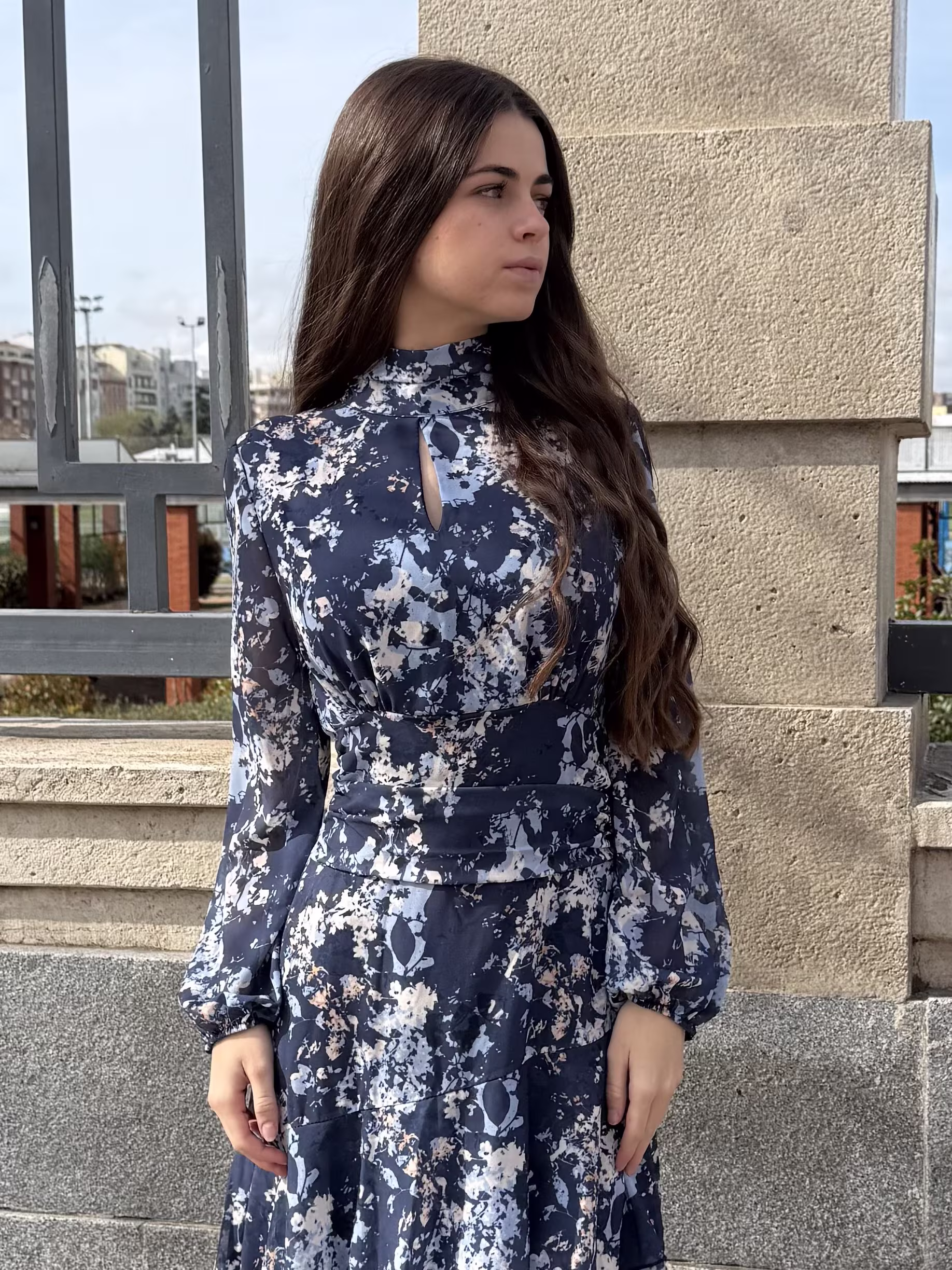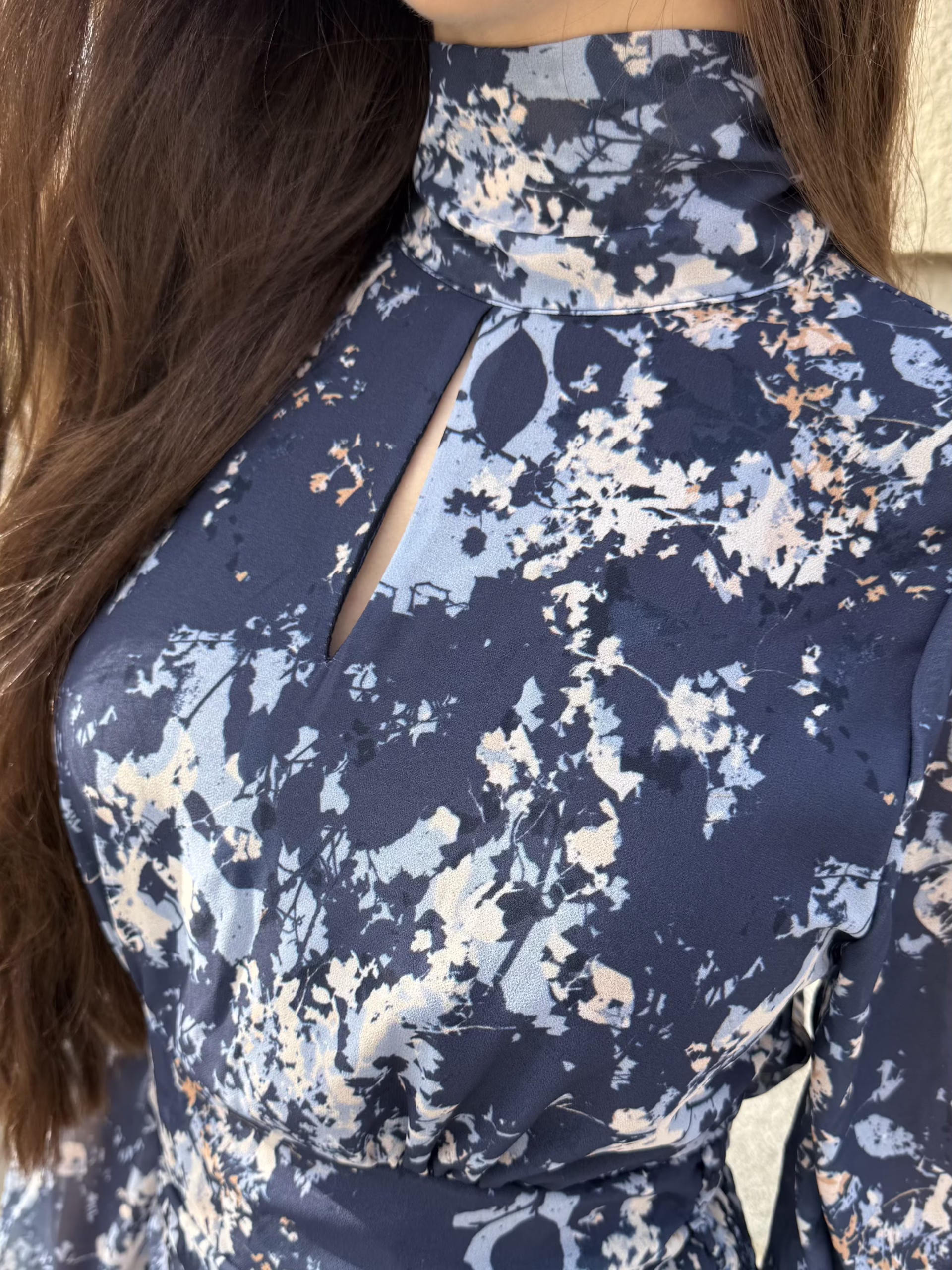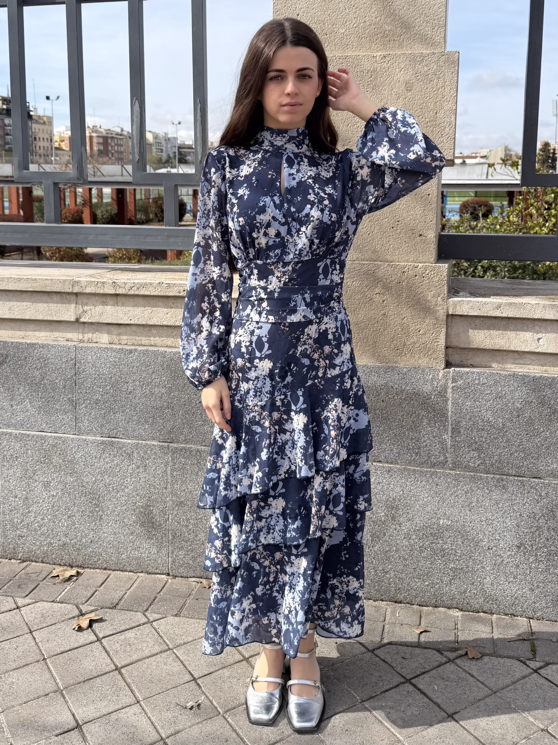 Vestido largo de volantes en tonos marinos con cuello alto y apertura frontal en forma de gota. Manga larga y falda fluida en capas con volantes. Elegante y atemporal.