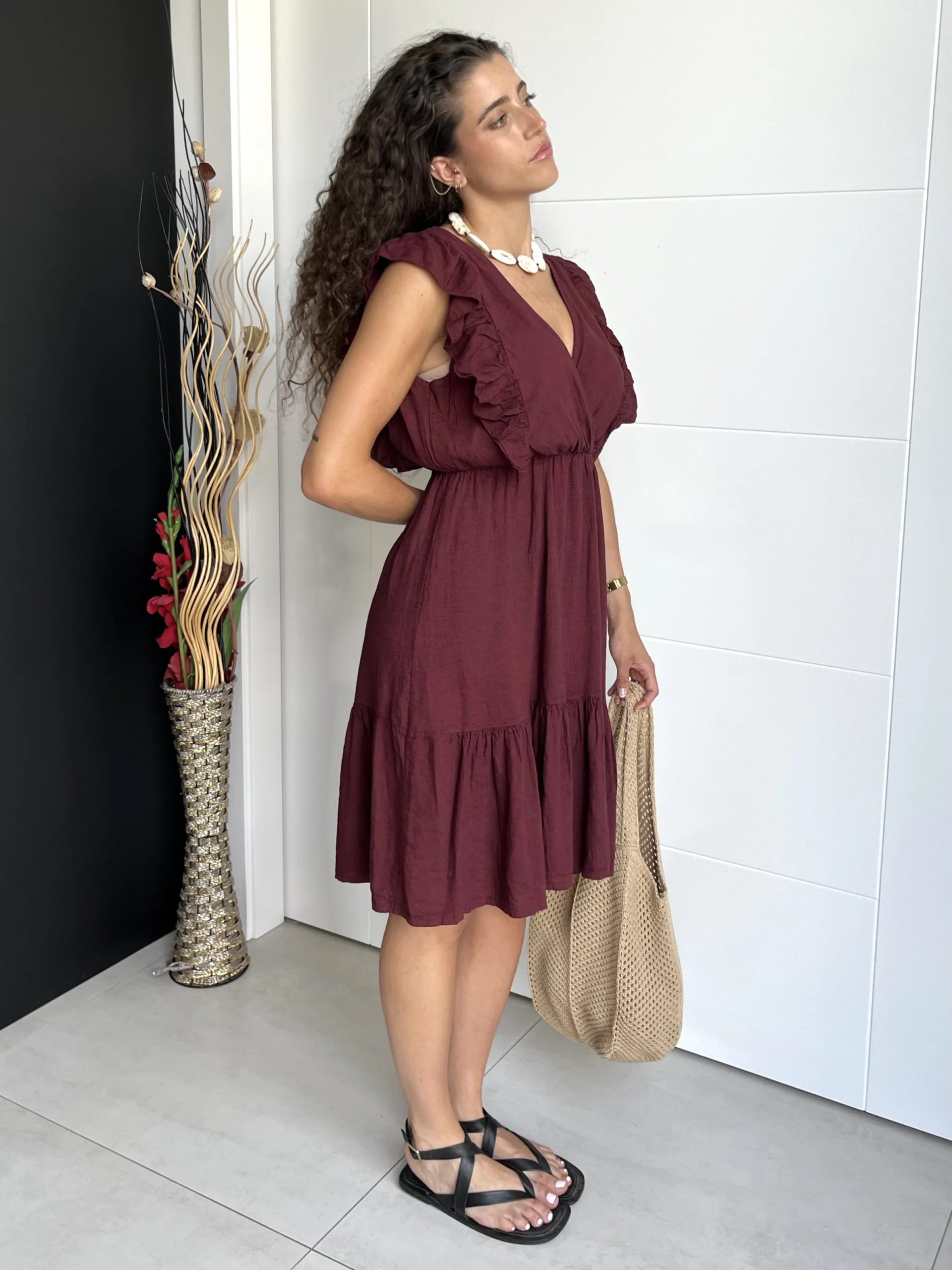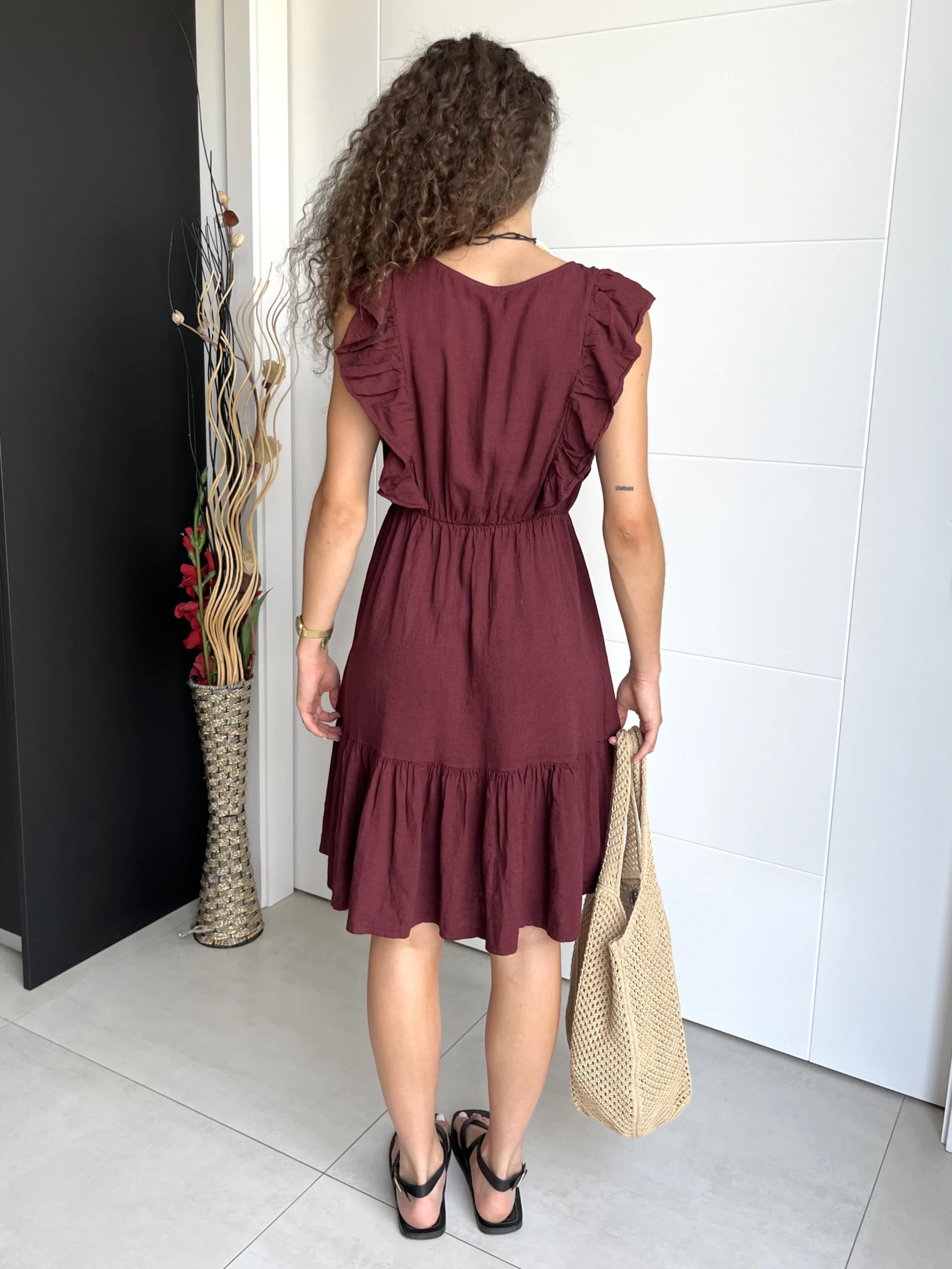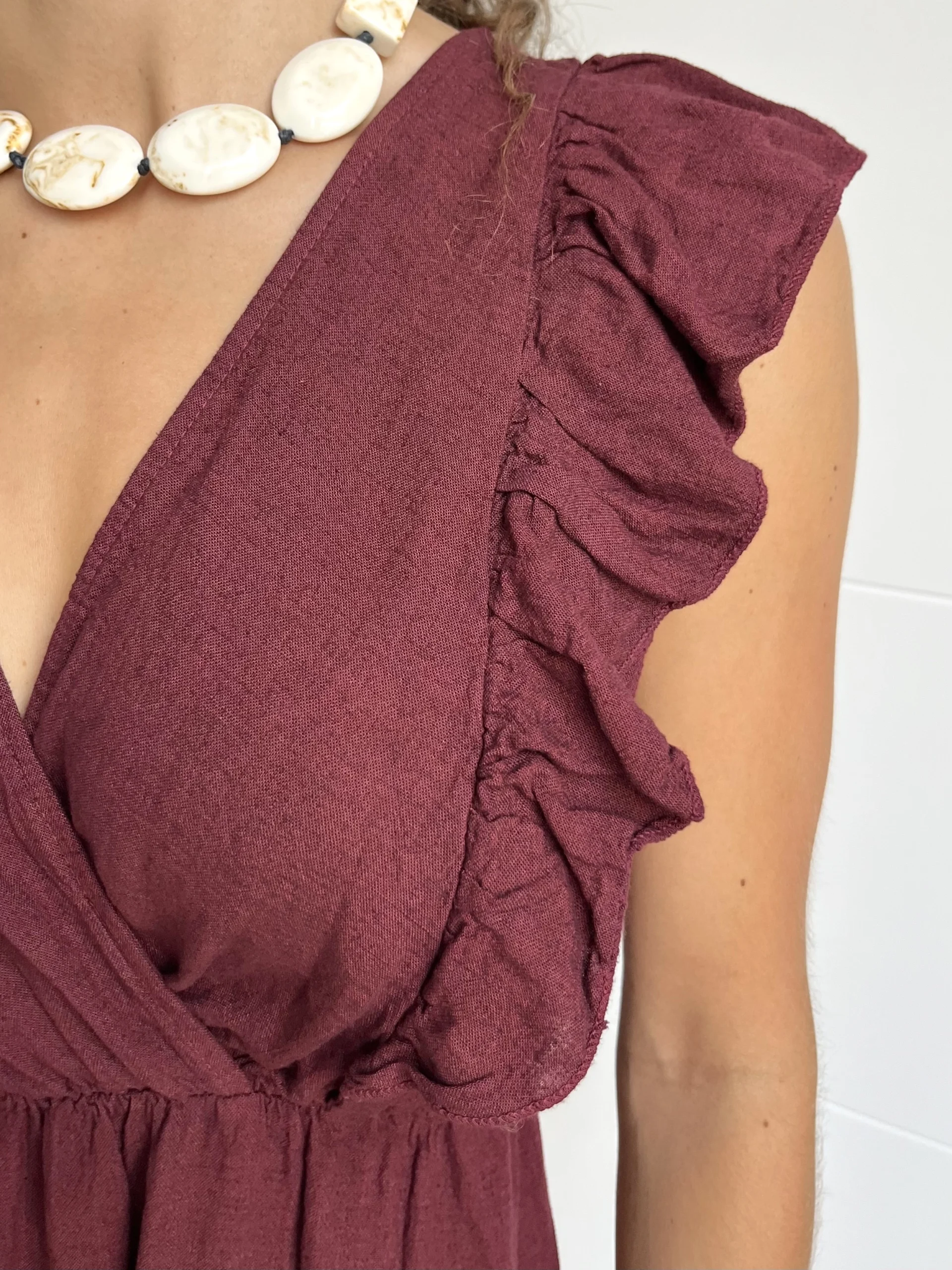 Vestido corto de lino en color granate, con escote en pico cruzado y volantes en los tirantes. Cintura elástica con goma y volante al final de la falda. No tiene forro interior.
