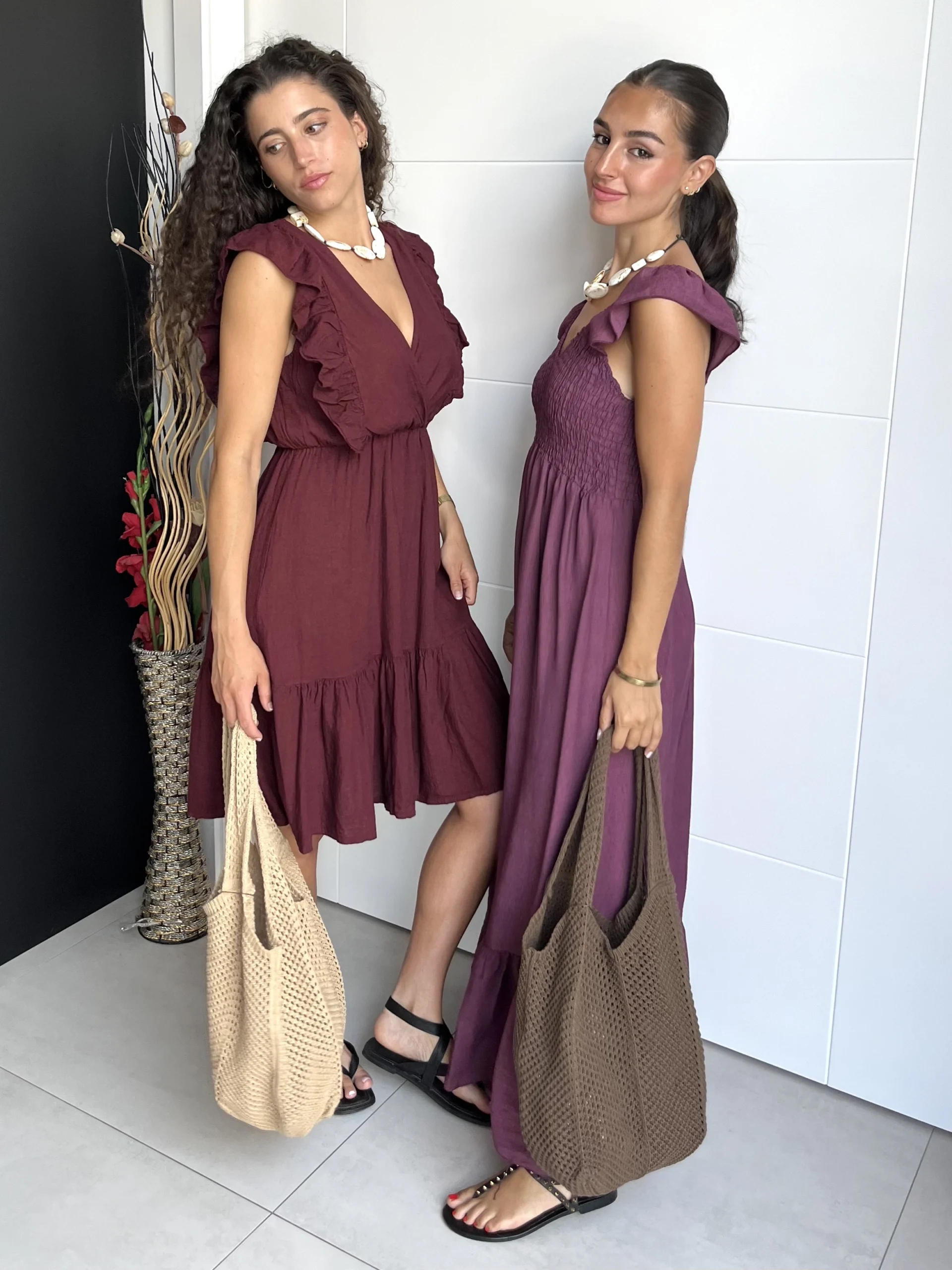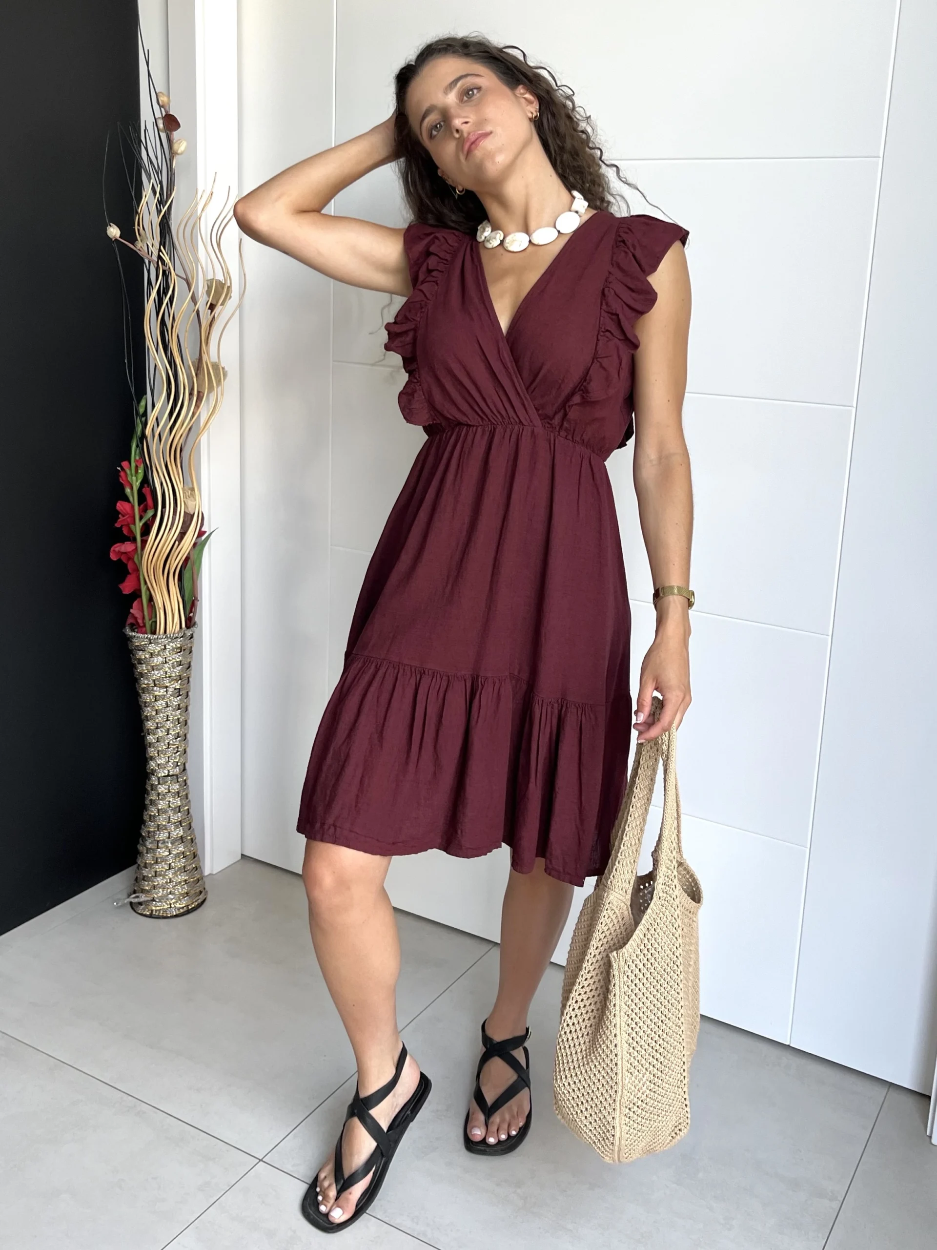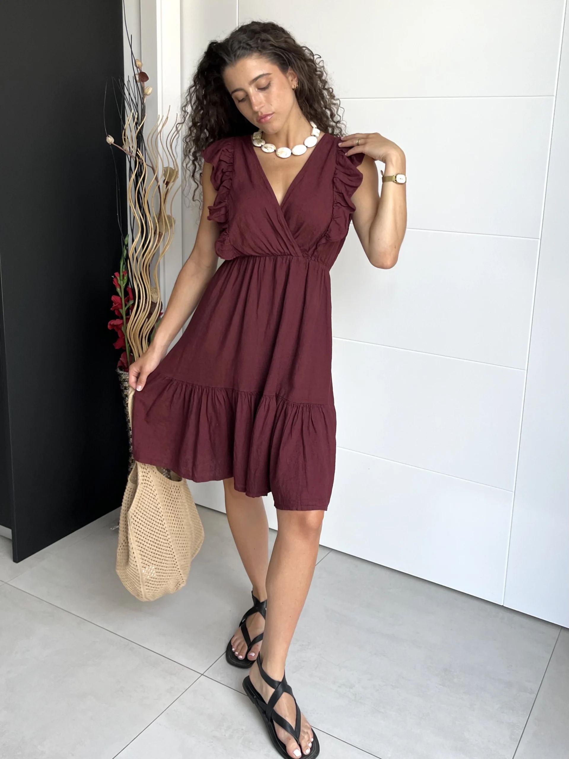 Vestido corto de lino en color granate, con escote en pico cruzado y volantes en los tirantes. Cintura elástica con goma y volante al final de la falda. No tiene forro interior.