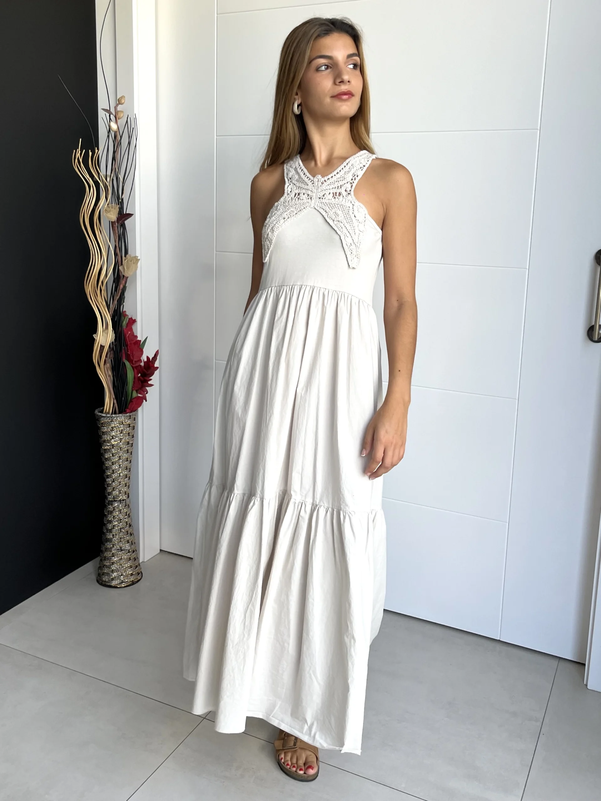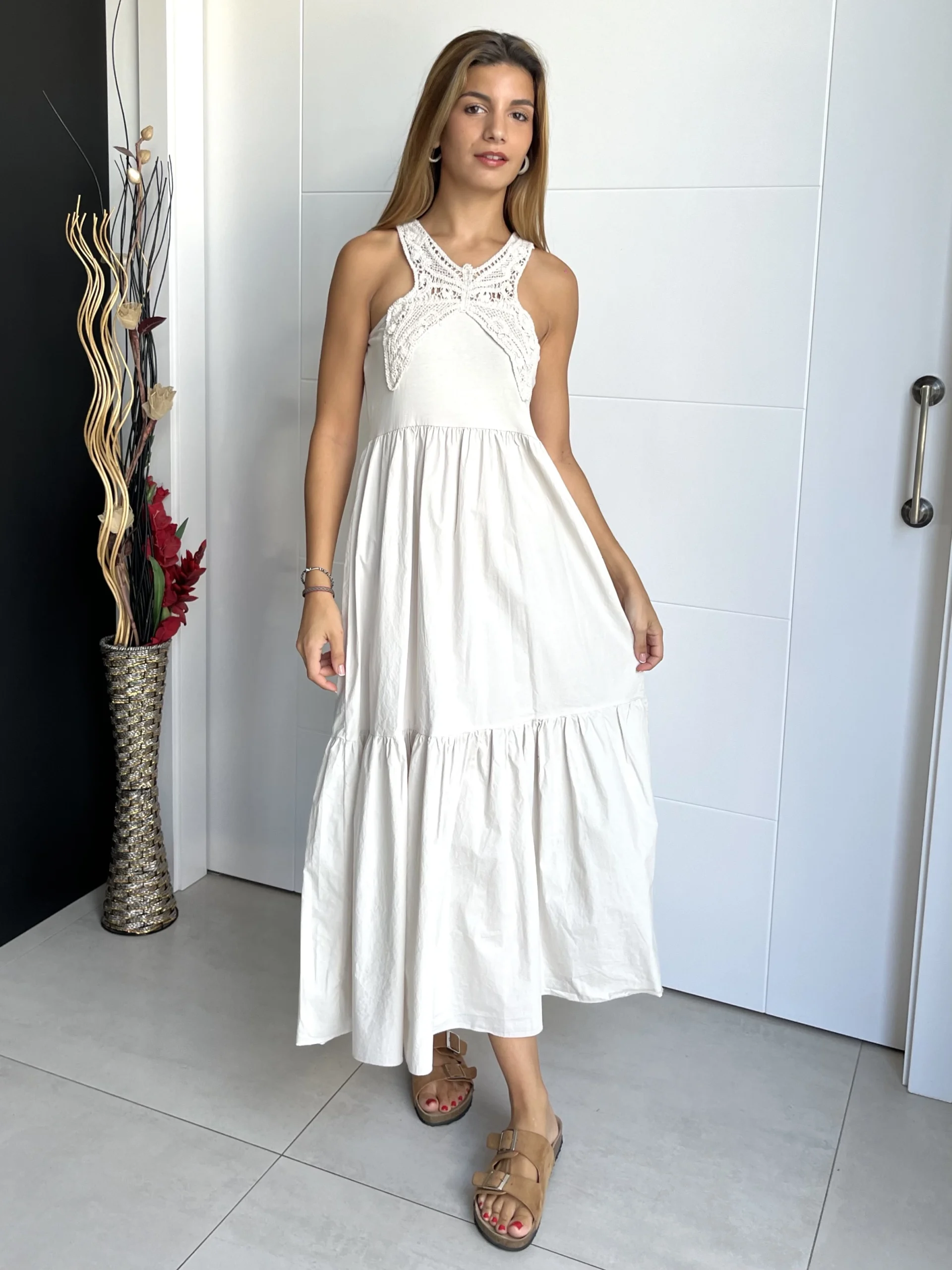 Vestido de tirantes en color crudo, con una mariposa en el pecho croché. Zona del pecho elástica y falda acampanada.