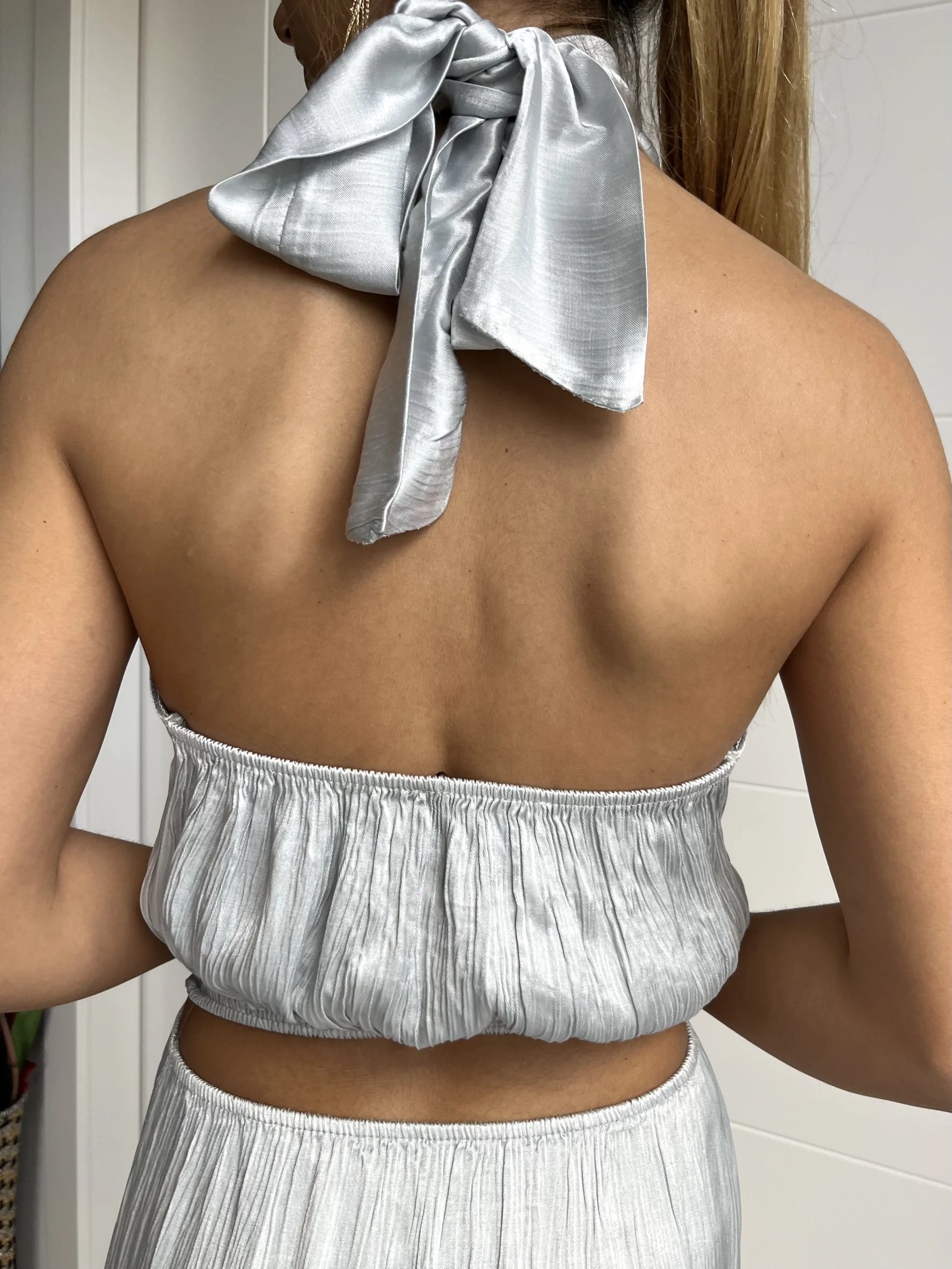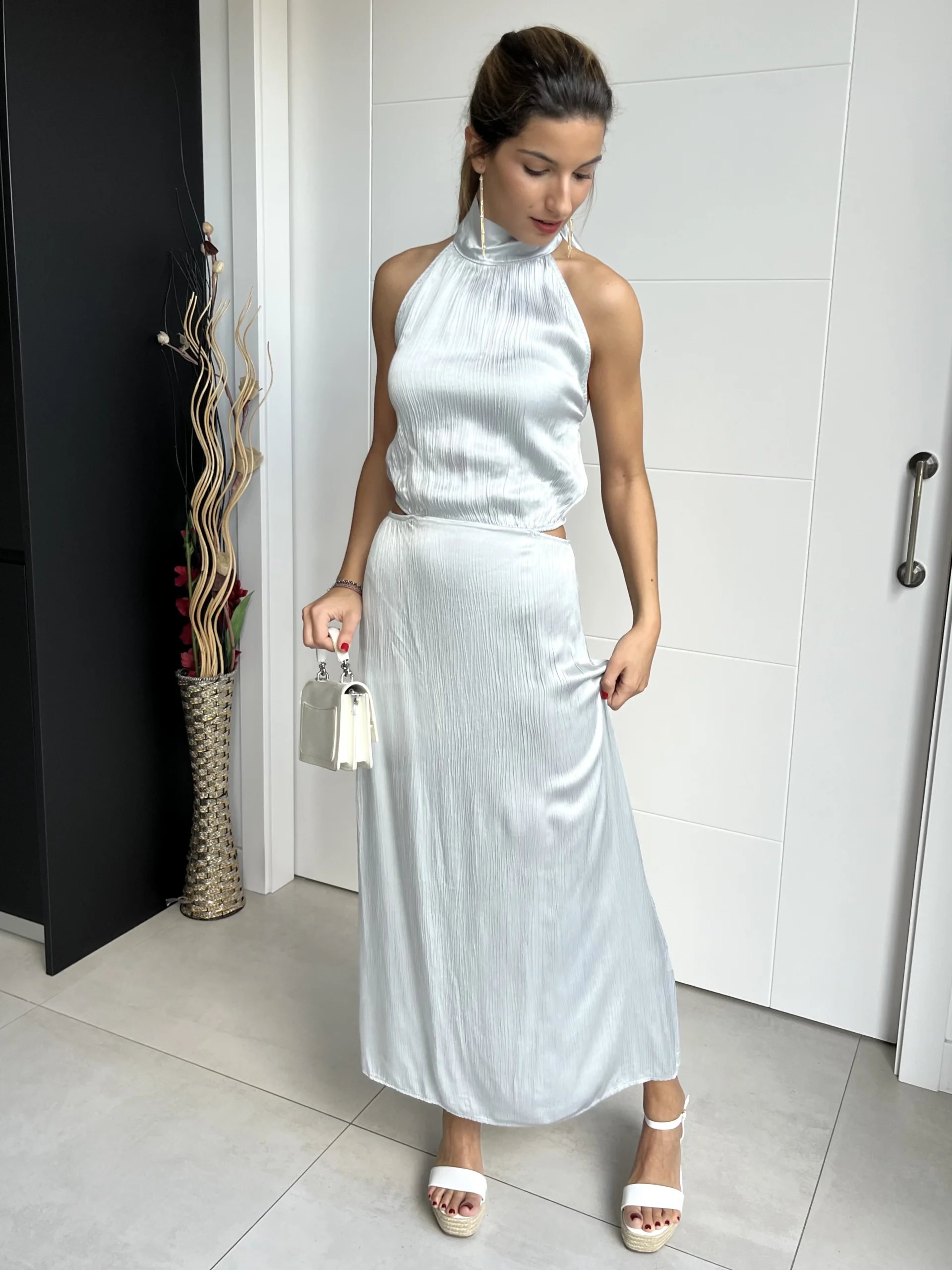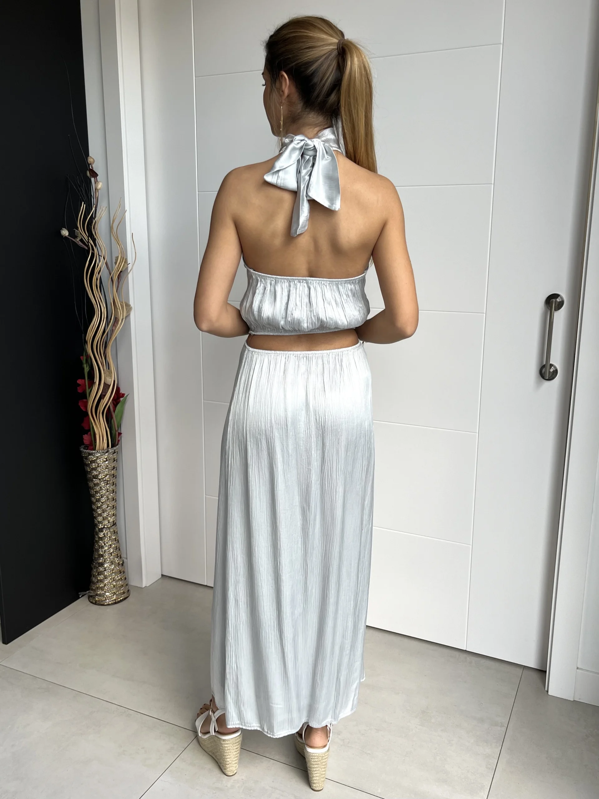 Vestido midi satinado en color plata, con cuello halter y lazada en la nuca. Espalda al aire con abertura en la cintura. Espalda elástica con gomas, caída evasé y sin forro.