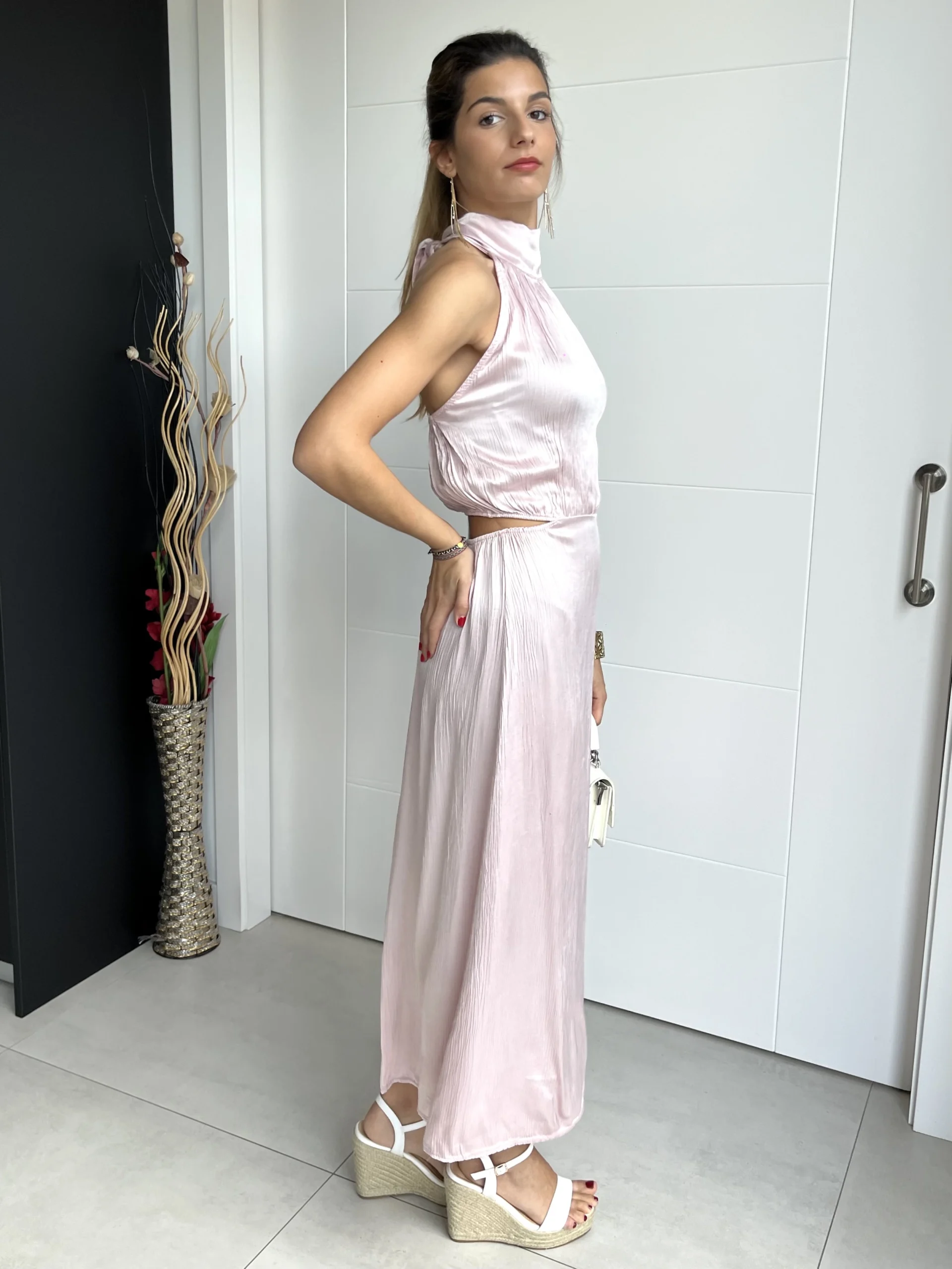 Vestido midi satinado en color rosa palo, con cuello halter y lazada en la nuca. Espalda al aire con abertura en la cintura. Espalda elástica con gomas, caída evasé y sin forro.