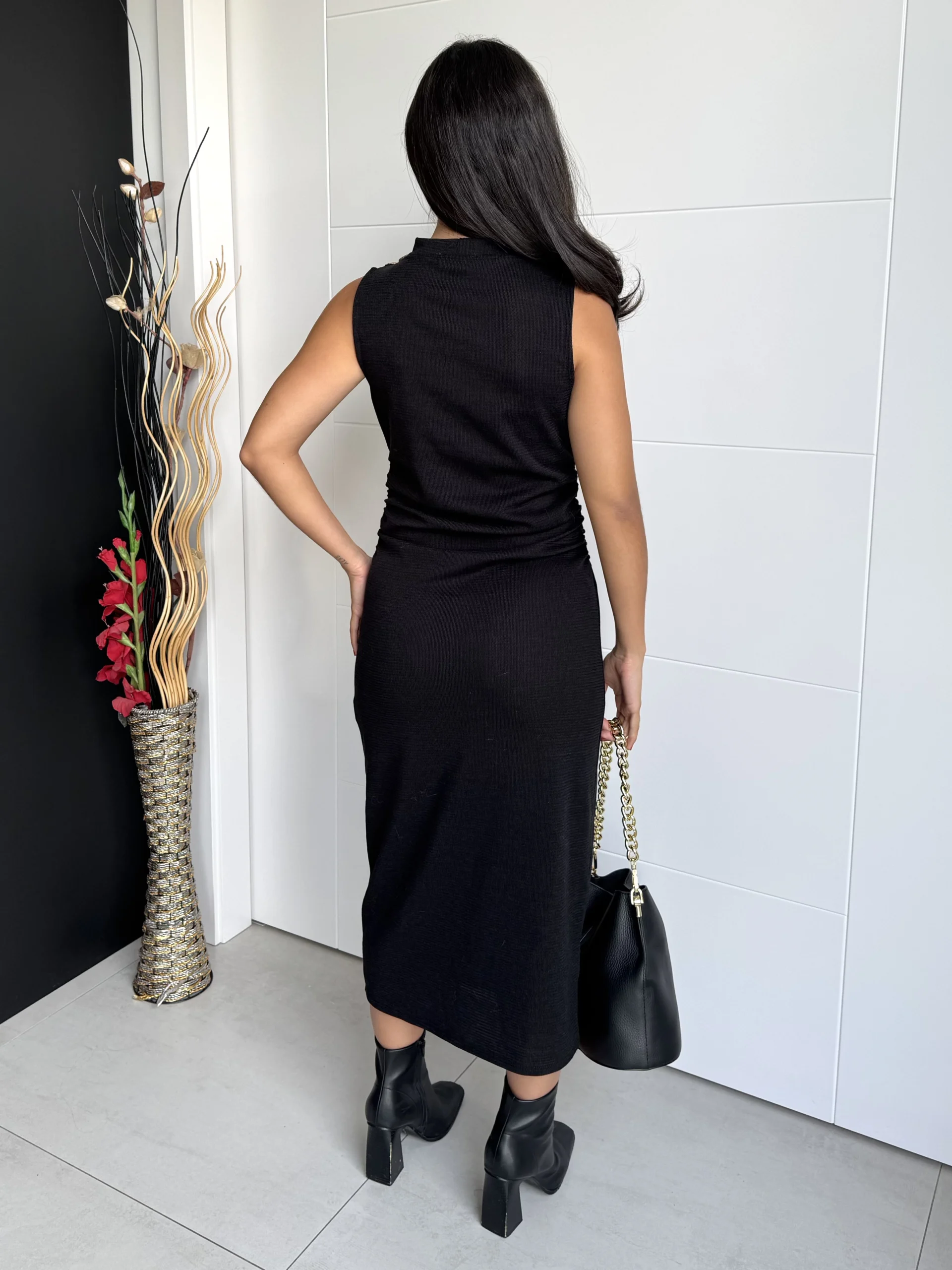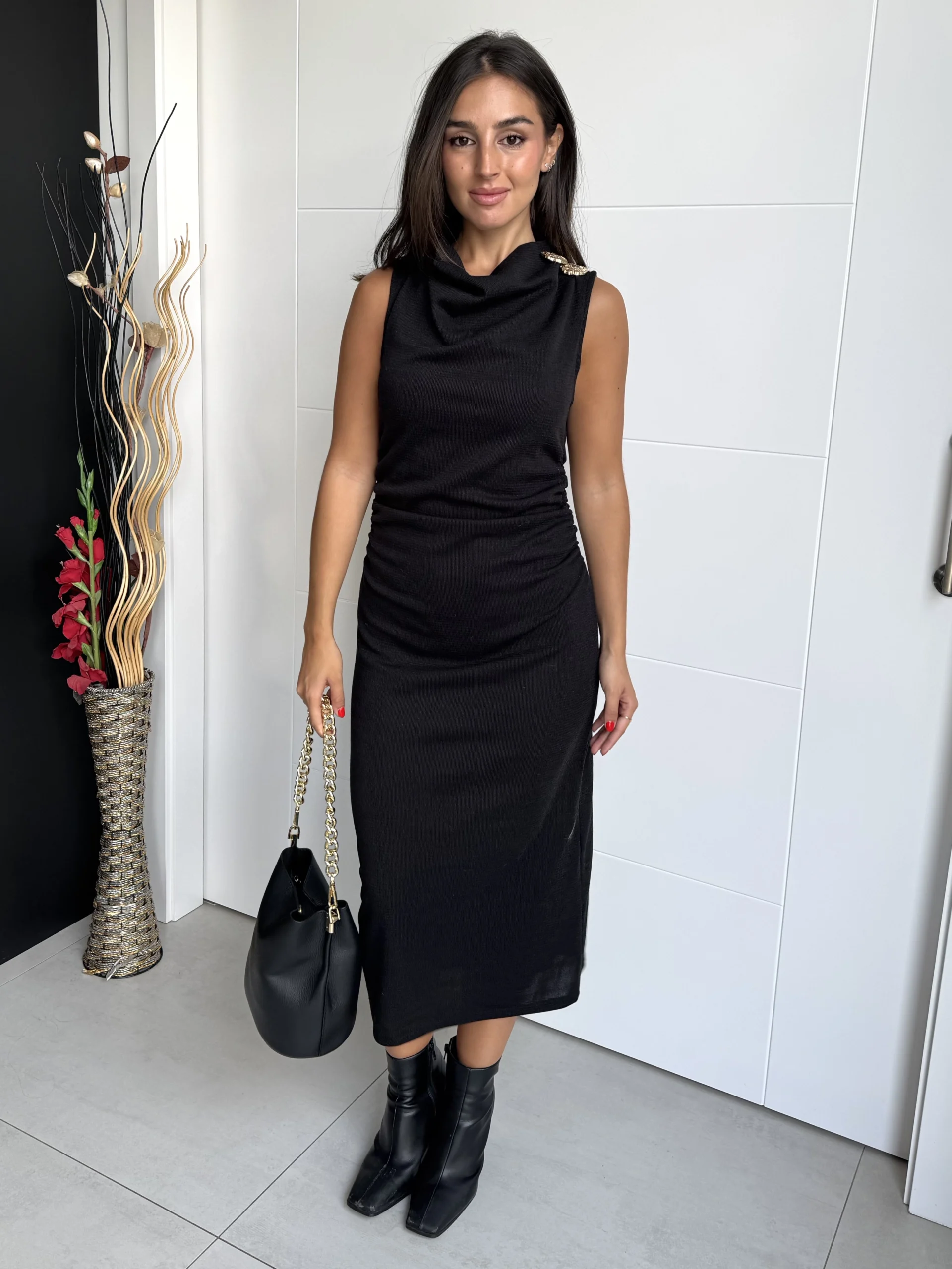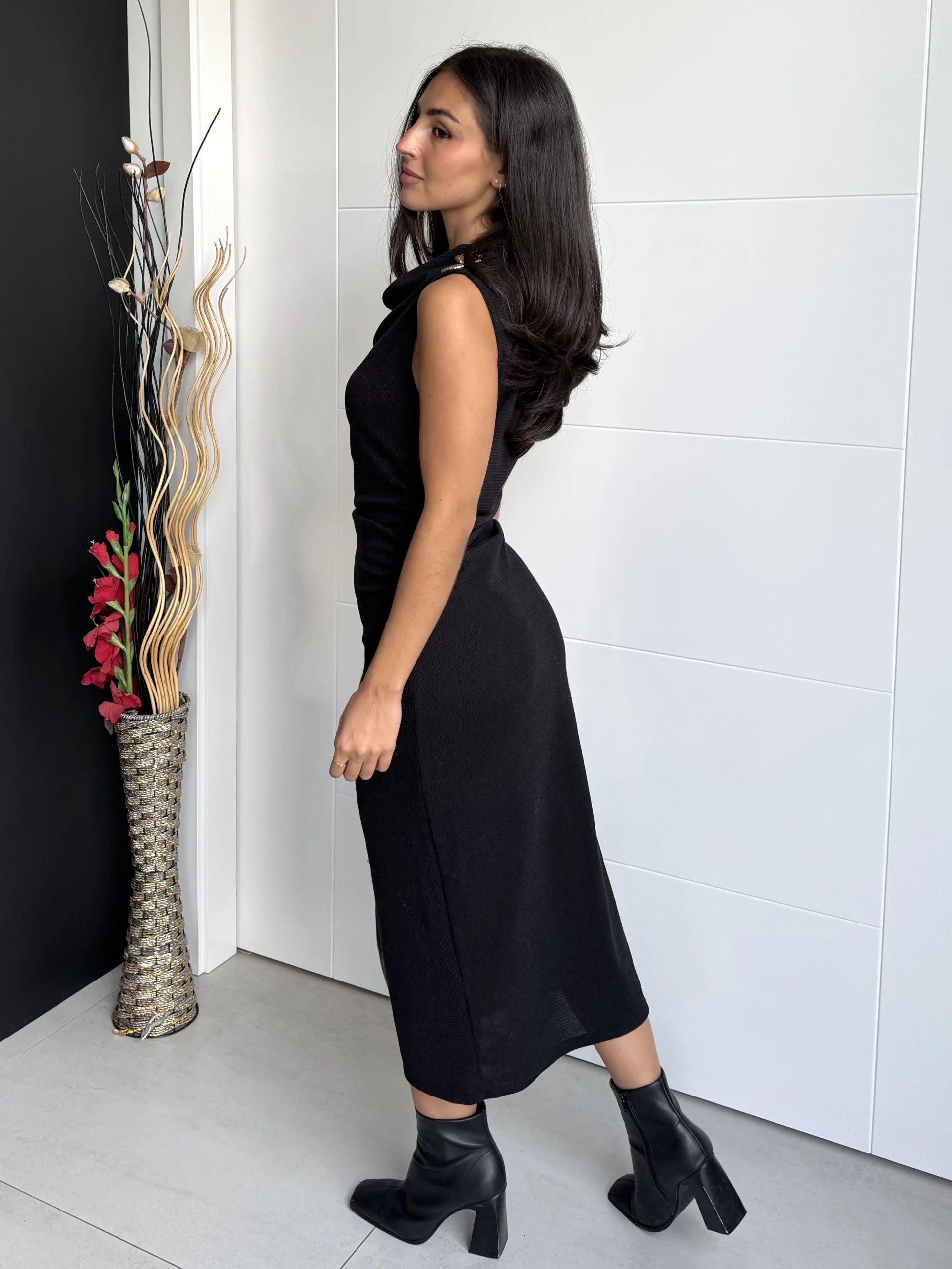 El Vestido Midi Negro cuello drapeado combina elegancia y confort en una prenda imprescindible para ocasiones especiales.